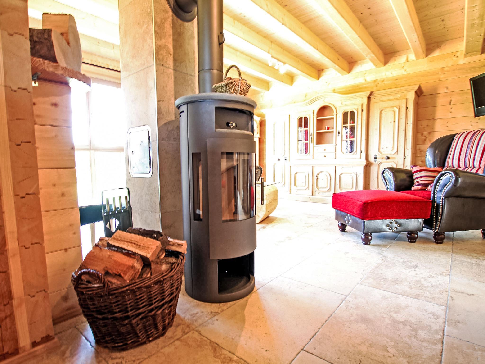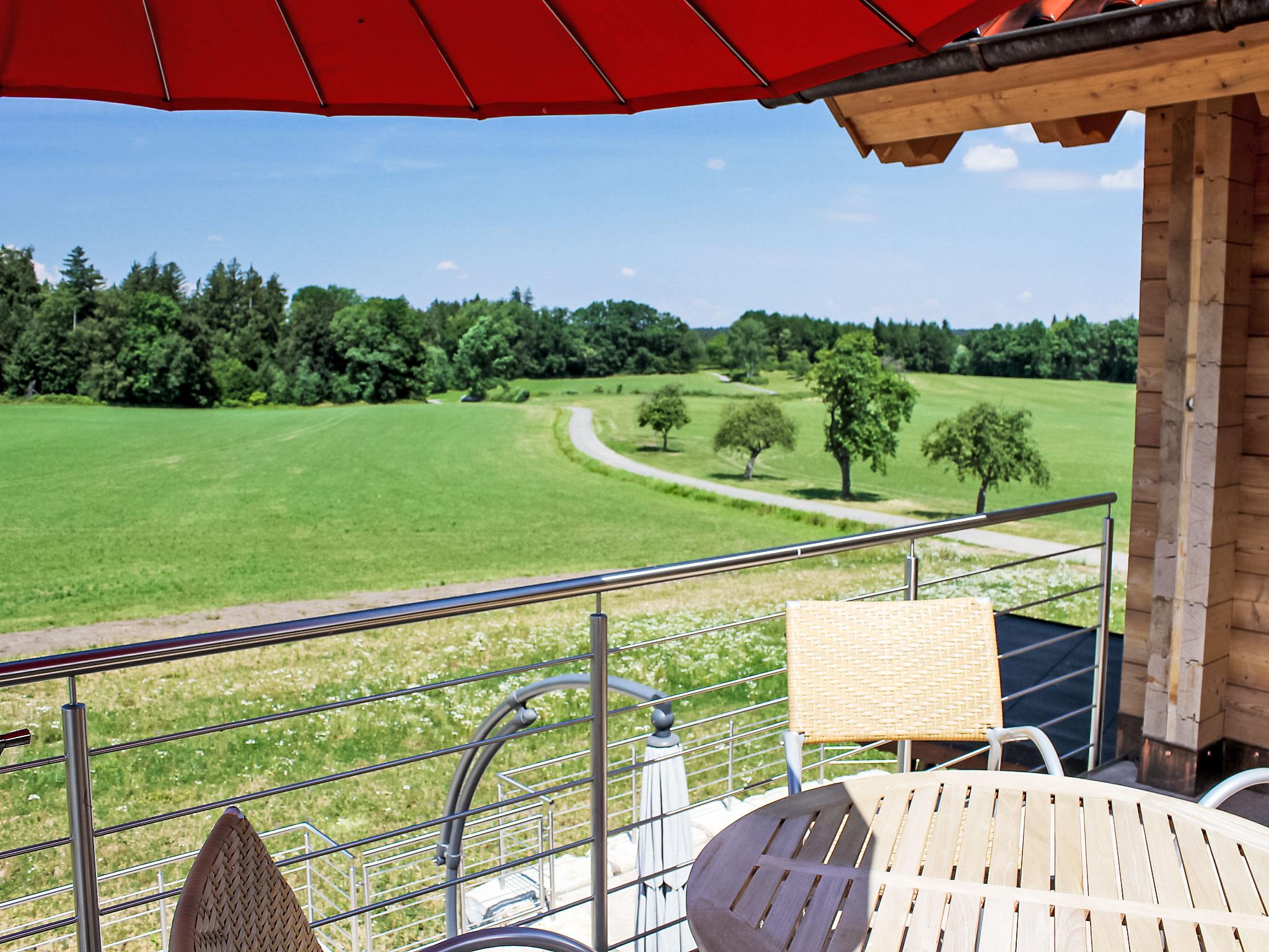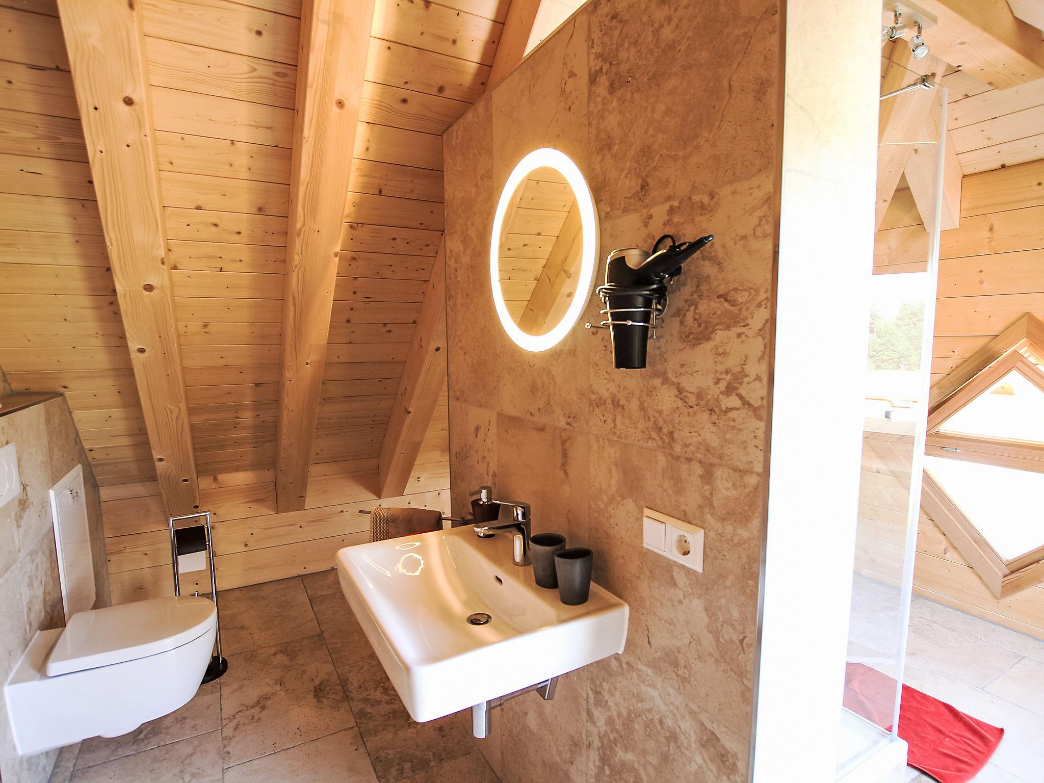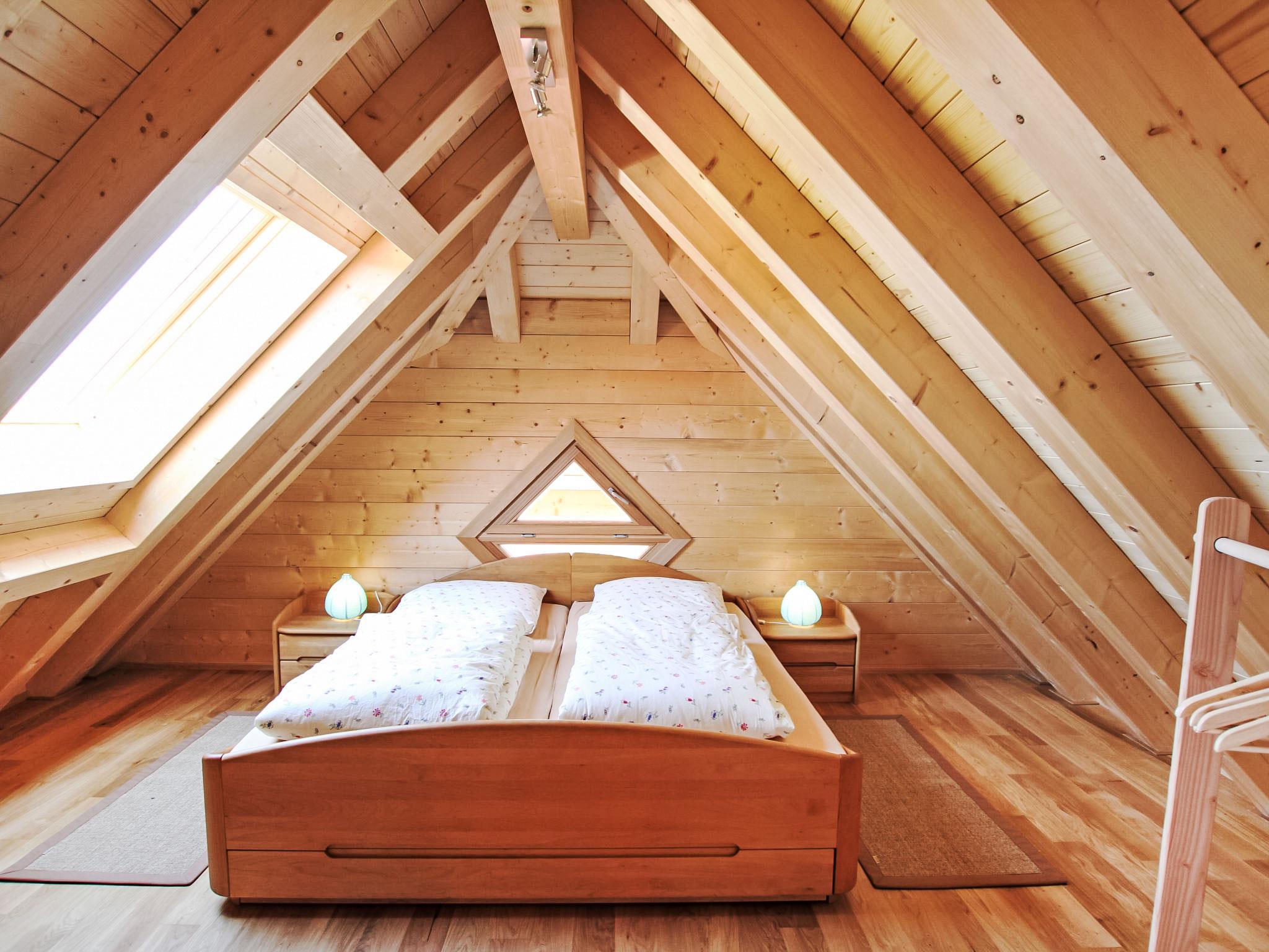 "Lärche", 5-room maisonette 150 m2 on 2 levels on 2nd floor. Stylish and wooden furniture furnishings: living/dining room with Scandinavian wood stove and satellite TV (flat screen). Exit to the balcony. 1 double bedroom. 1 room with 1 bed. Kitchen (oven, dishwasher, 4 ceramic glass hob hotplates, electric coffee machine). Sep. WC, bath/shower/WC. Top floor: 2 double bedrooms with sloping ceilings. Shower/WC. Heating. Balcony furniture. Very beautiful view of the countryside. Facilities: logs (free). Internet (WiFi, free). Please note: non-smokers only. Smoke alarm.