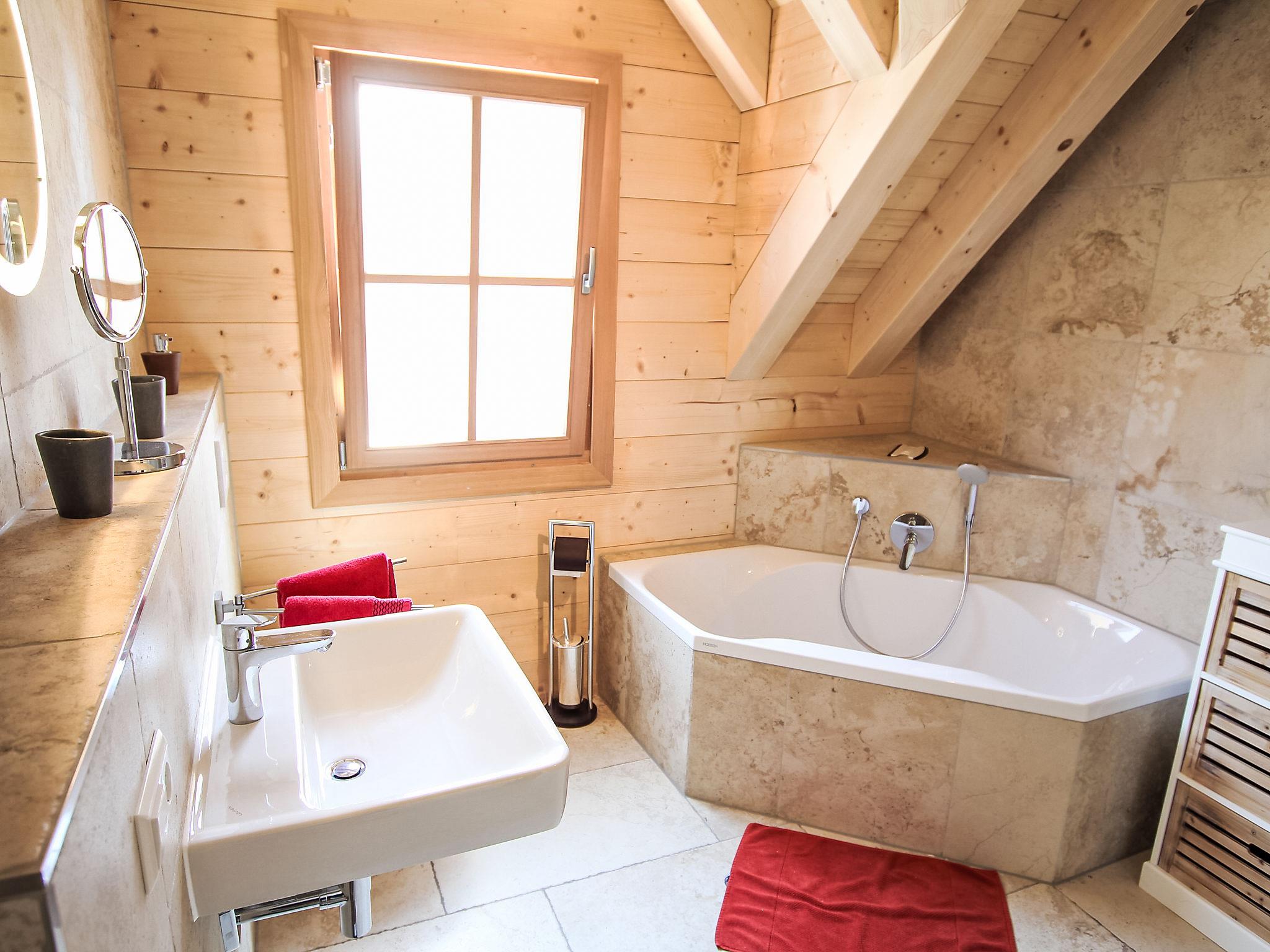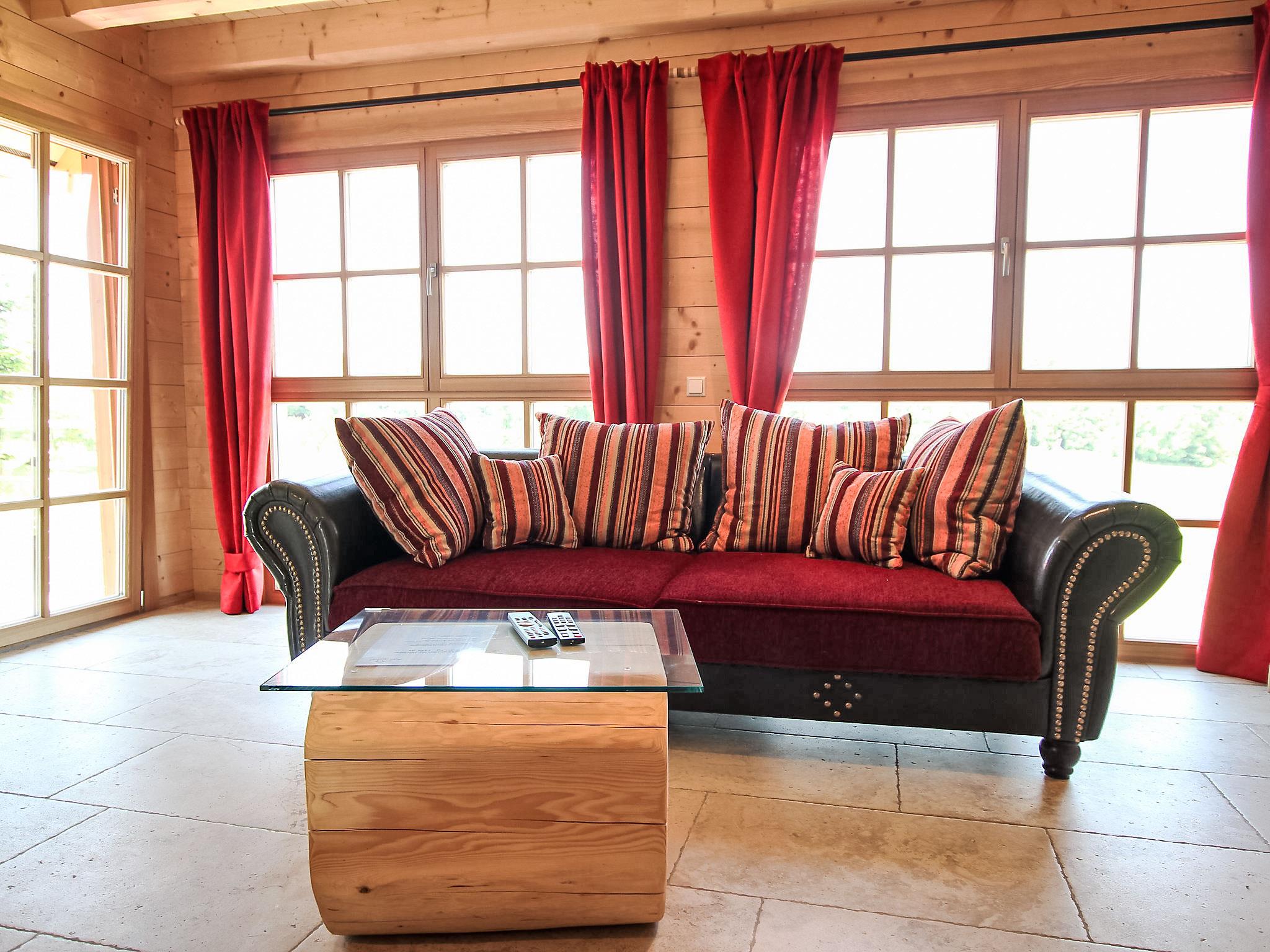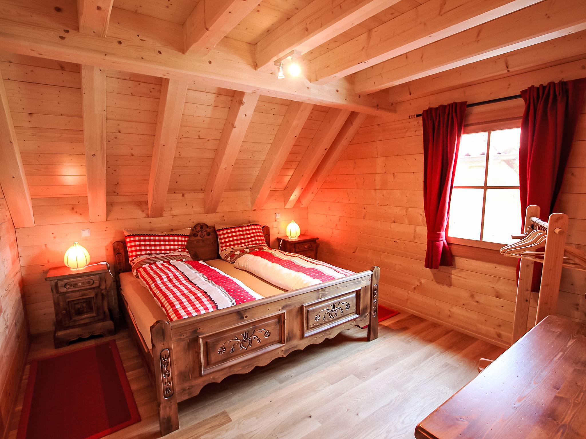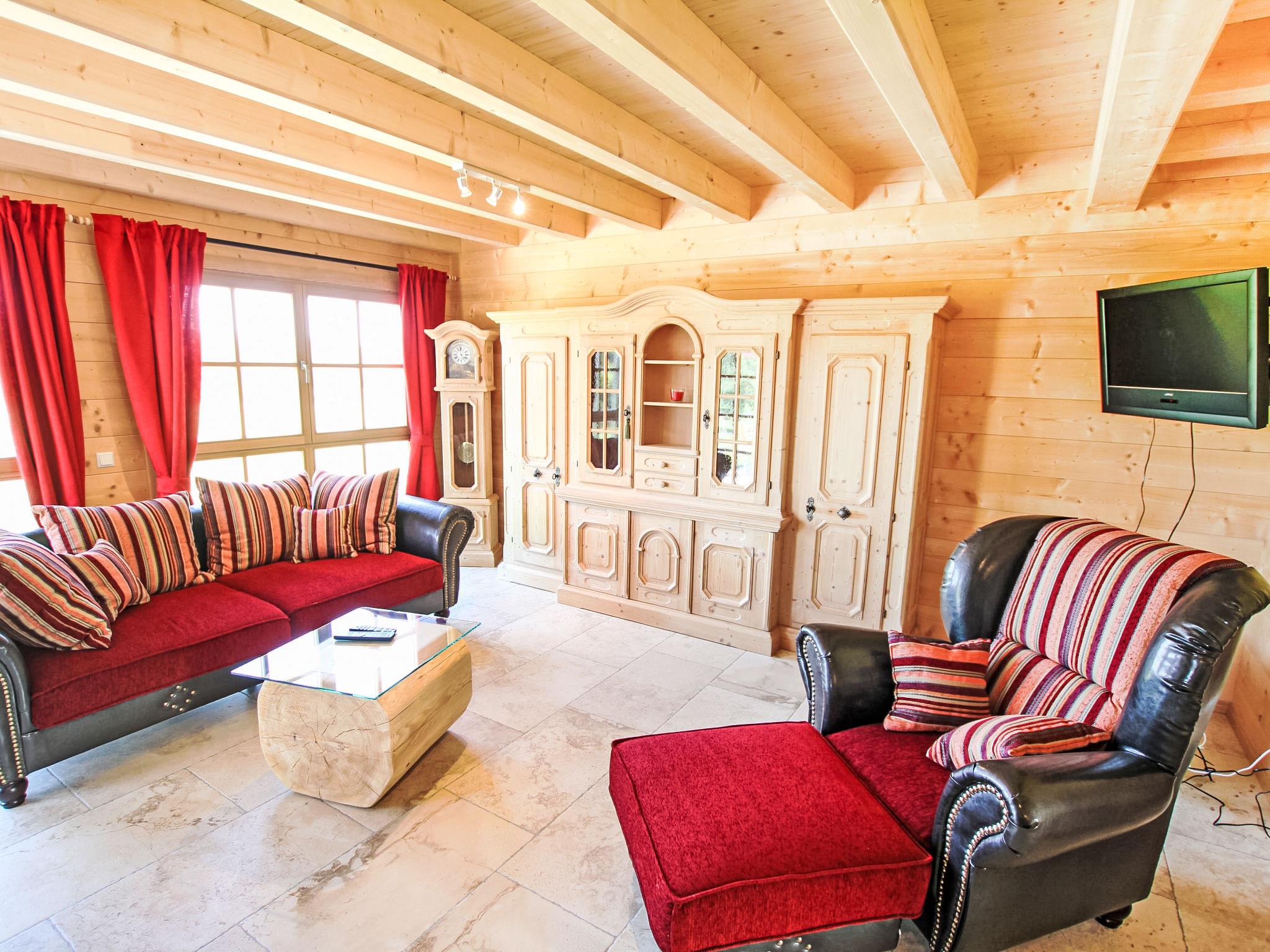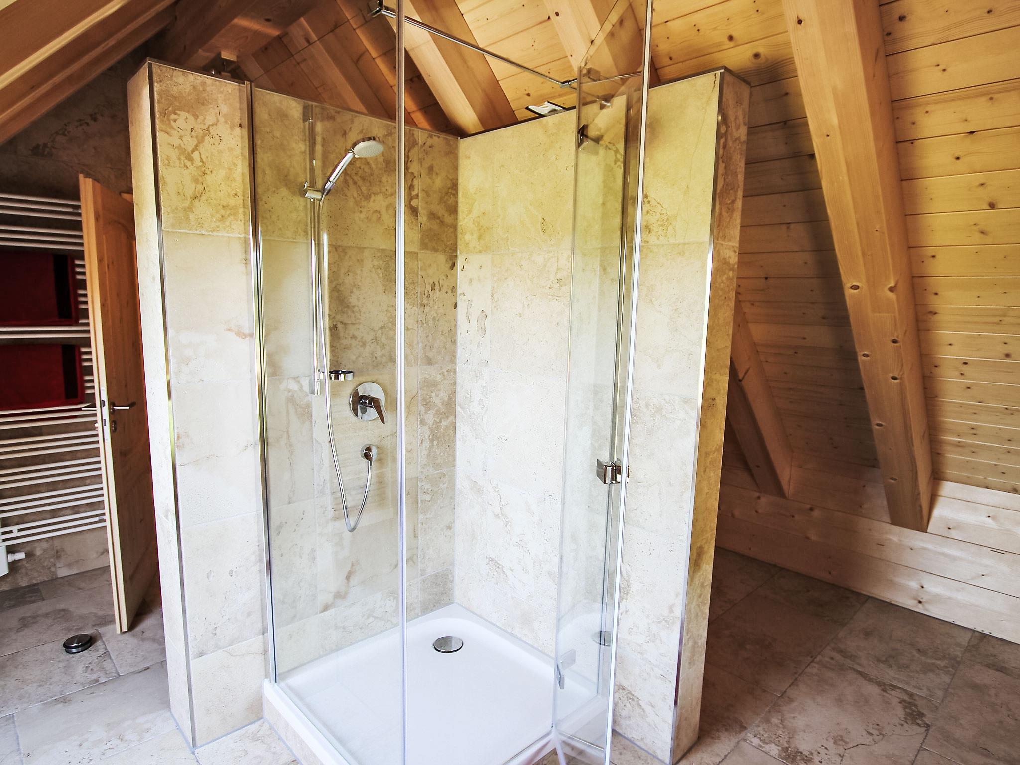 "Lärche", 5-room maisonette 150 m2 on 2 levels on 2nd floor. Stylish and wooden furniture furnishings: living/dining room with Scandinavian wood stove and satellite TV (flat screen). Exit to the balcony. 1 double bedroom. 1 room with 1 bed. Kitchen (oven, dishwasher, 4 ceramic glass hob hotplates, electric coffee machine). Sep. WC, bath/shower/WC. Top floor: 2 double bedrooms with sloping ceilings. Shower/WC. Heating. Balcony furniture. Very beautiful view of the countryside. Facilities: logs (free). Internet (WiFi, free). Please note: non-smokers only. Smoke alarm.