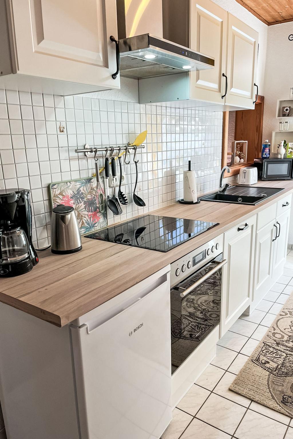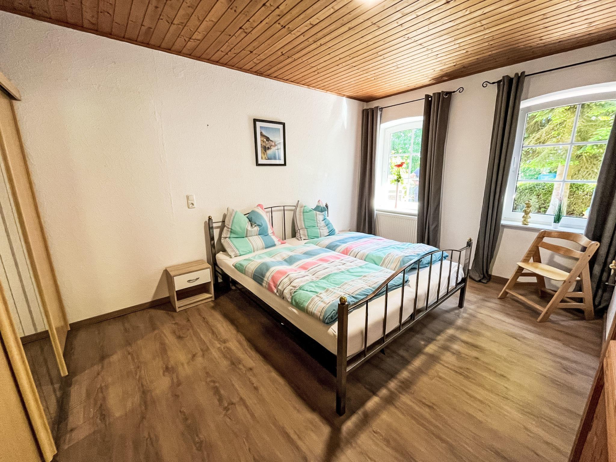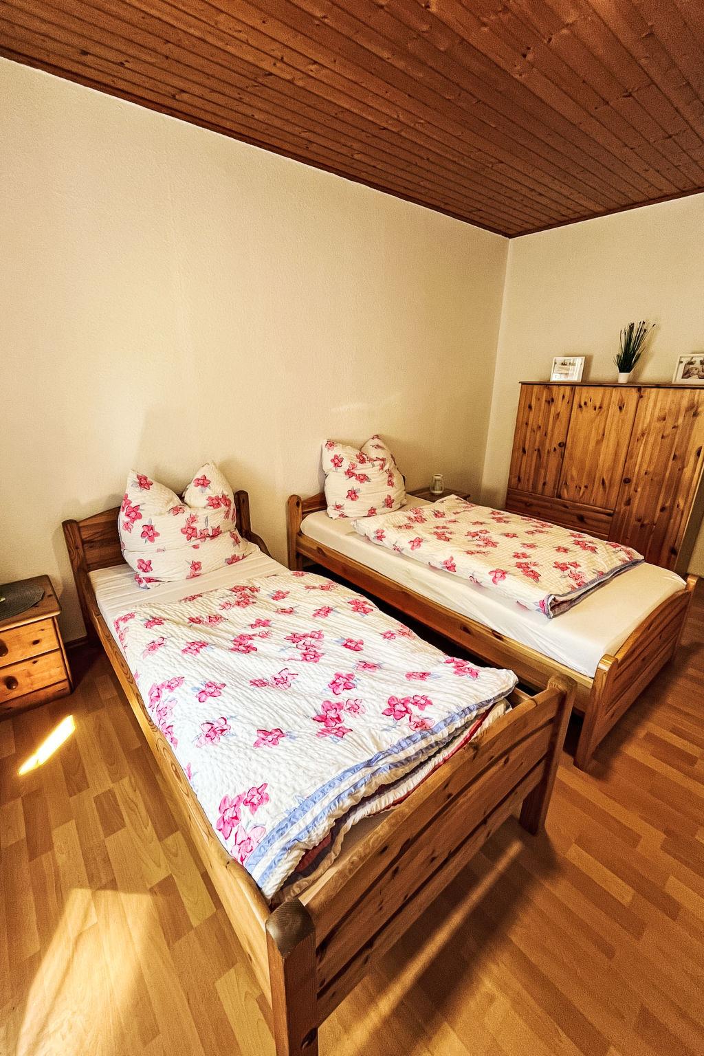 3-room apartment on the ground floor. Cosy furnishings: living/dining room with satellite TV (flat screen). Exit to the terrace. 1 room with 1 double bed (2 x 90 cm, length 200 cm). 1 room with 2 beds (90 cm, length 200 cm). Open kitchen (oven, dishwasher, 4 ceramic glass hob hotplates, toaster, kettle, microwave, electric coffee machine). Shower/WC. Terrace. Terrace furniture. Facilities: washing machine, children's high chair. Internet (WiFi, free). Parking at the house. Please note: non-smokers only. Maximum 1 small pet/ dog allowed.