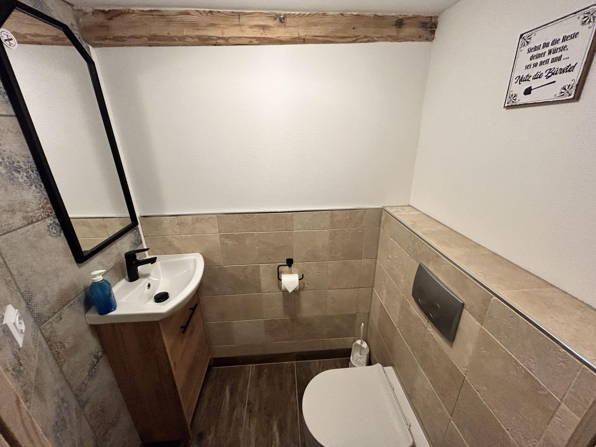 "Hexe", 6-room house 237 m2 on 2 levels, on the ground floor. Rustic and antique furnishings: living room, ceiling height 185 cm with Scandinavian wood stove and satellite TV (flat screen), DVD and DVD collection available. 1 room, ceiling height 185 cm with 1 double bed (180 cm, length 200 cm), satellite TV (flat screen). 1 room, ceiling height 185 cm with 1 bed (90 cm, length 200 cm), 1 double bed (180 cm, length 200 cm), satellite TV (flat screen). Kitchen (oven, dishwasher, 4 induction hot plates, toaster, kettle, microwave, electric coffee machine) with ceiling height 240 cm, Low door height 170 cm, dining table. Bath/WC, shower/WC, Sauna. Gas heating, underfloor heating. Upper floor: (steep stair) living/sleeping room, Low door height 180 cm ceiling height 190 cm with 1 double sofabed (140 cm, length 200 cm), Scandinavian wood stove, dining table and satellite TV (flat screen), DVD and DVD collection available. 1 room, Low door height 170 cm ceiling height 190 cm with 1 double bed (180 cm, length 200 cm), satellite TV (flat screen), DVD. 1 room, Low door height 180 cm ceiling height 190 cm with 1 bed (90 cm, length 200 cm), 1 double bed (180 cm, length 200 cm). Kitchen (oven, dishwasher, 4 ceramic glass hob hotplates, toaster, kettle, microwave, electric coffee machine) with ceiling height 240 cm, Low door height 175 cm, dining table. Shower/WC, sep. WC, Sauna. Gas heating, Electric fireplace. Patio, lawn 500 m2. Terrace furniture, barbecue (portable), deck chairs. Facilities: washing machine, dryer, safe, iron, hair dryer. Internet (WiFi, free). Parking (4 cars). Please note: non-smoking house. Maximum 3 pets/ dogs allowed. Smoke alarm. Desk with computer and printer. Infrared sauna and Finnish sauna. Outdoor hot tub.