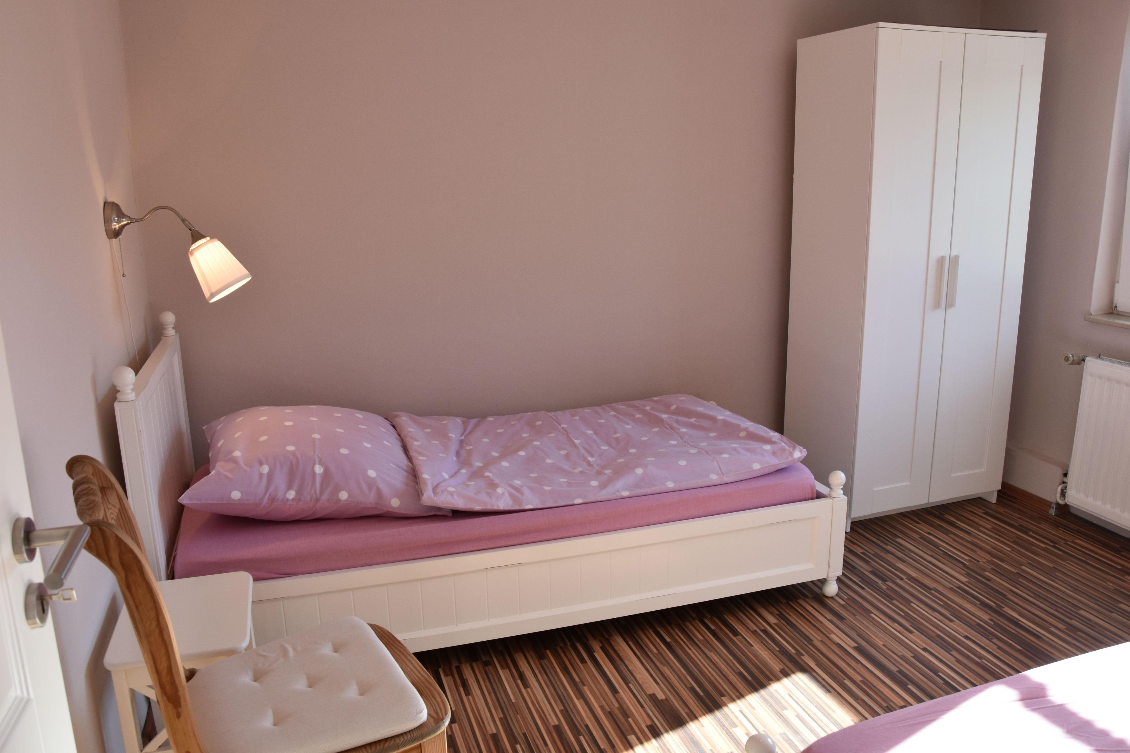 Das Kinderzimmer ist mit zwei Betten 180x90 cm ausgestattet. Die Dusche ist ebenerdig und 120x120 cm groß. Das Schlafzimmer ist hell und freundlich ausgestattet. Ein großes Doppelbett ist vorhanden.