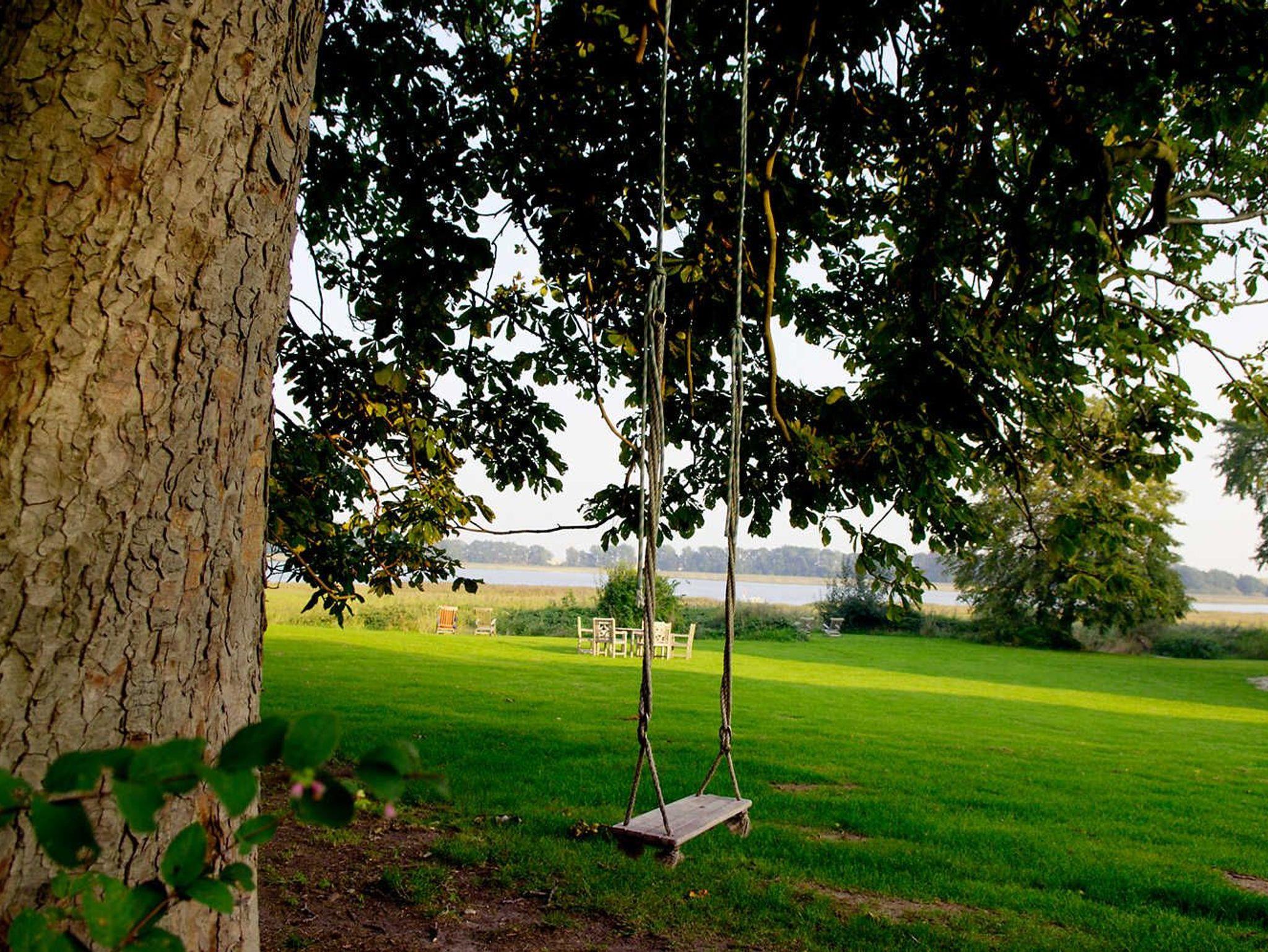 Der große Garten bietet den Ruhesuchenden und den Aktiven gleichermaßen einen perfekten Raum für vielseitige Aktivitäten: Verschiedene abgeschlossene Bereiche mit Liegestühlen und Tischen, eine große Aussichtsterrasse am Schilfgürtel, der Badesteg, der Grillbereich sowie eine Kinderspielecke mit Sandkiste, zwei Schaukeln und Fußballtoren stehen unseren Gästen zur freien Verfügung.