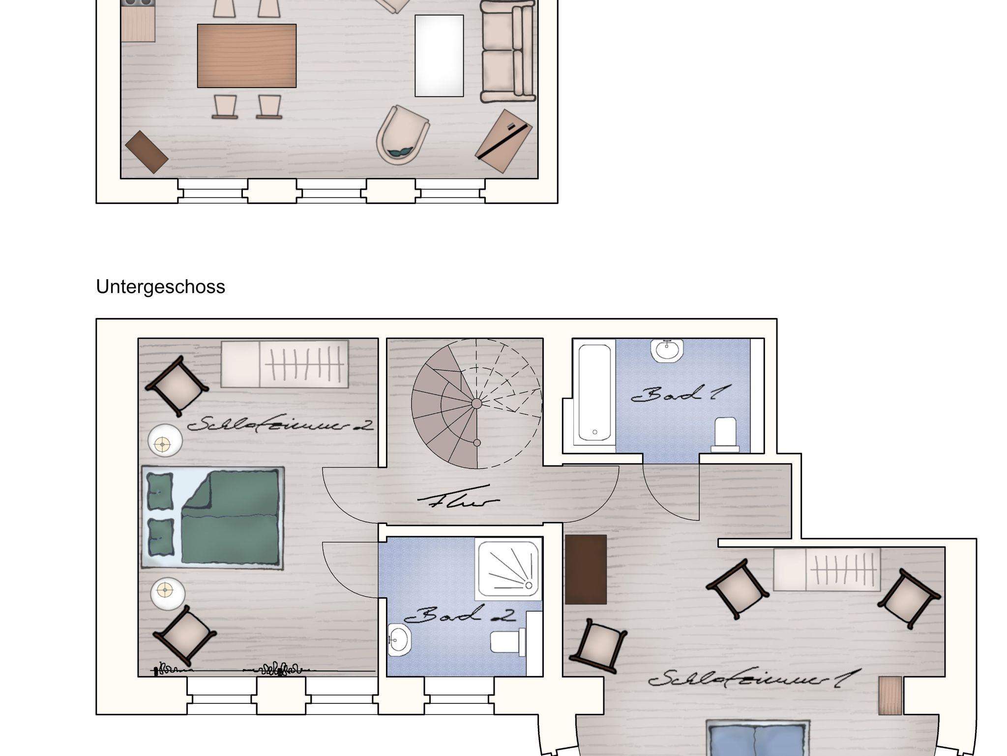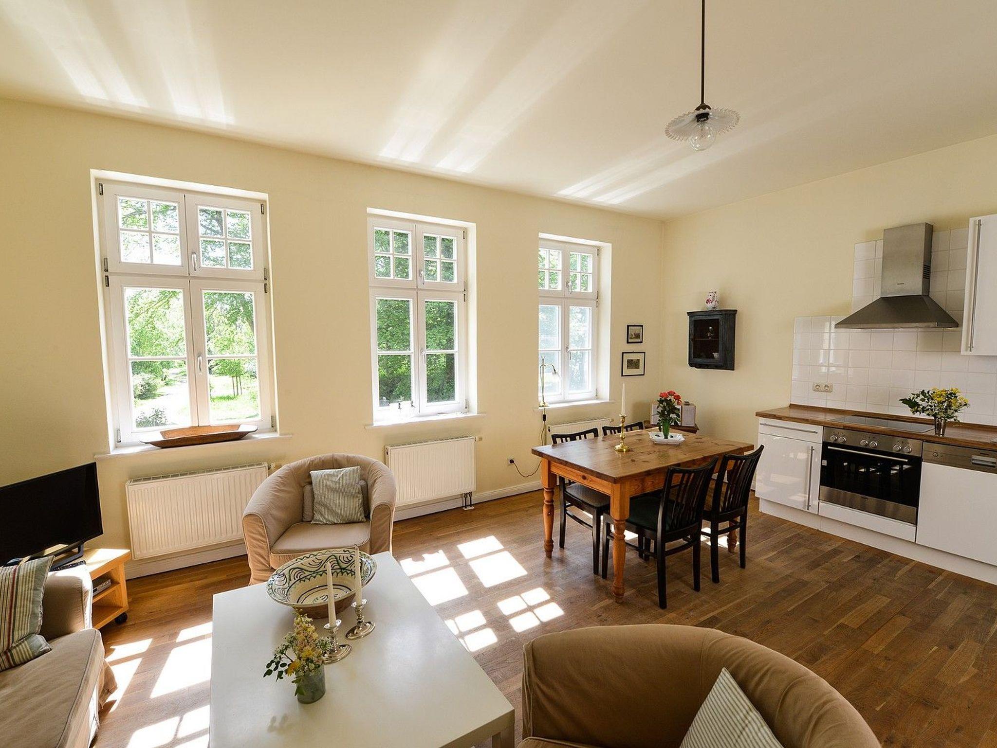 Die Ferienwohnung 2 des Gut Grubnow befindet sich im Erdgeschoss und im Souterrain des Gutshauses und erstreckt sich über zwei Etagen (Wendeltreppe). Die Wohnung für bis zu vier Personen und in einer Größe von 85 m² ist gemütlich eingerichtet und besteht aus drei Zimmern: Ein großes Wohnzimmer mit offener Küche (hochwertige Siemens-Geräte) und schönen südlichen Blick auf den Garten, zwei großzügige Schlafzimmer mit jeweils einem Doppelbett und zwei separaten Badezimmern (eins davon mit Badewanne, eins mit Dusche, beide mit WC).