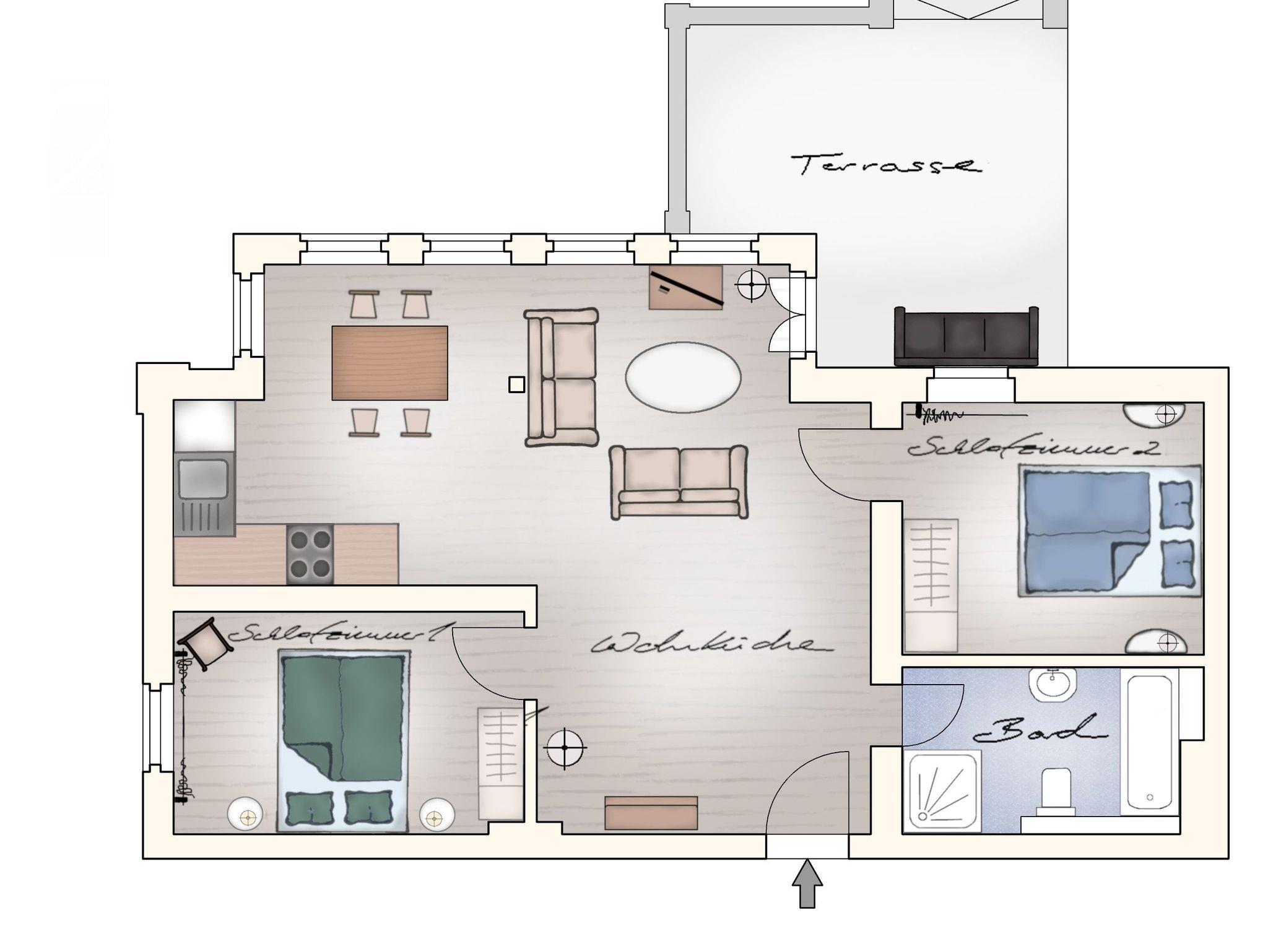 Die Ferienwohnung Nr. 4 befindet sich im ersten Obergeschoss des Gutshauses. Die Wohnung für bis zu vier Personen und in einer Größe von 72 m² ist mit Liebe zum Detail eingerichtet und besteht aus drei Zimmern: Ein großes Wohnzimmer mit offener Küche (hochwertige Siemens-Geräte) und schönem Blick auf den Garten und das Wasser, zwei Schlafzimmer mit jeweils einem Doppelbett und ein Badezimmer mit separater Badewanne und Dusche. Aus dem Wohnzimmer führt eine Tür auf die große Terrasse, die einen sehr schönen Blick auf den Garten und das Wasser bietet und über eigene Gartenmöbel aus Teak-Holz verfügt. Die Böden der Ferienwohnung bestehen aus Eichen-Parkett. .