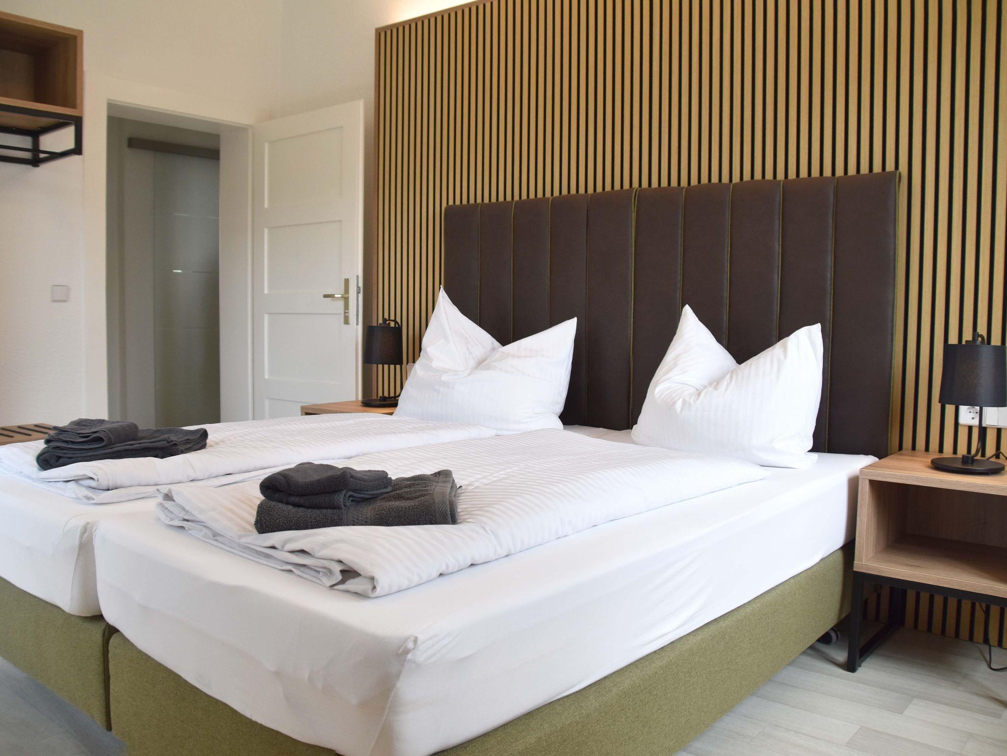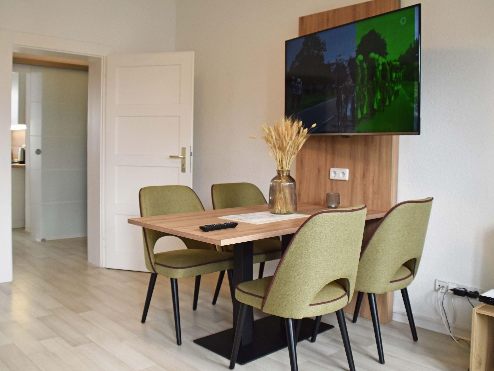 Die Gästewohnung in der Karl-Marx-Str. 42 hat 1 Wohnzimmer, 1 Schlafzimmer, 1 Kinderzimmer, 1 Küche und 1 Bad mit Dusche. Sie hat eine Wohnfläche von 60m² bietet Platz für bis zu 5 Personen, ist komplett eingerichet und verfügt über ein Doppelbett im Schlafzimmer, 1 Schlafsofa im Wohnzimmer, ein Einzelbett im 2.Schlafzimmer sowie TV und WLAN. Zudem befinden sich im Keller des Hauses eine Waschmaschine und ein Trockner. In unmittelbarer Nähe befindet sich unser hauseigenes Restaurant und Café Wilhelm