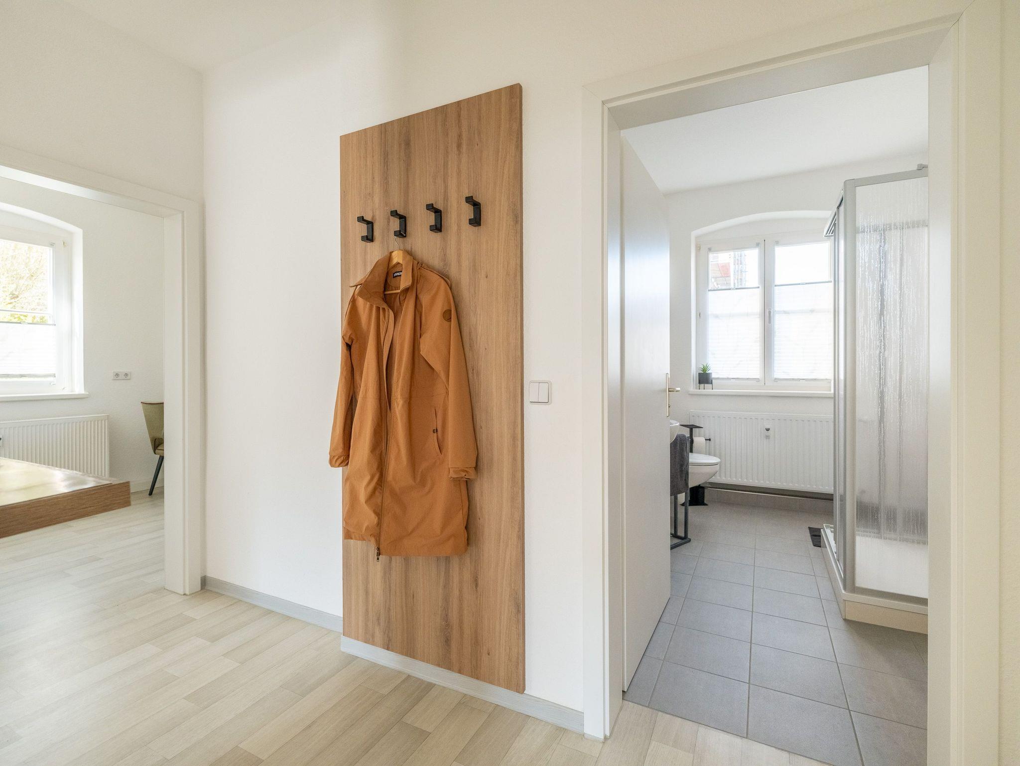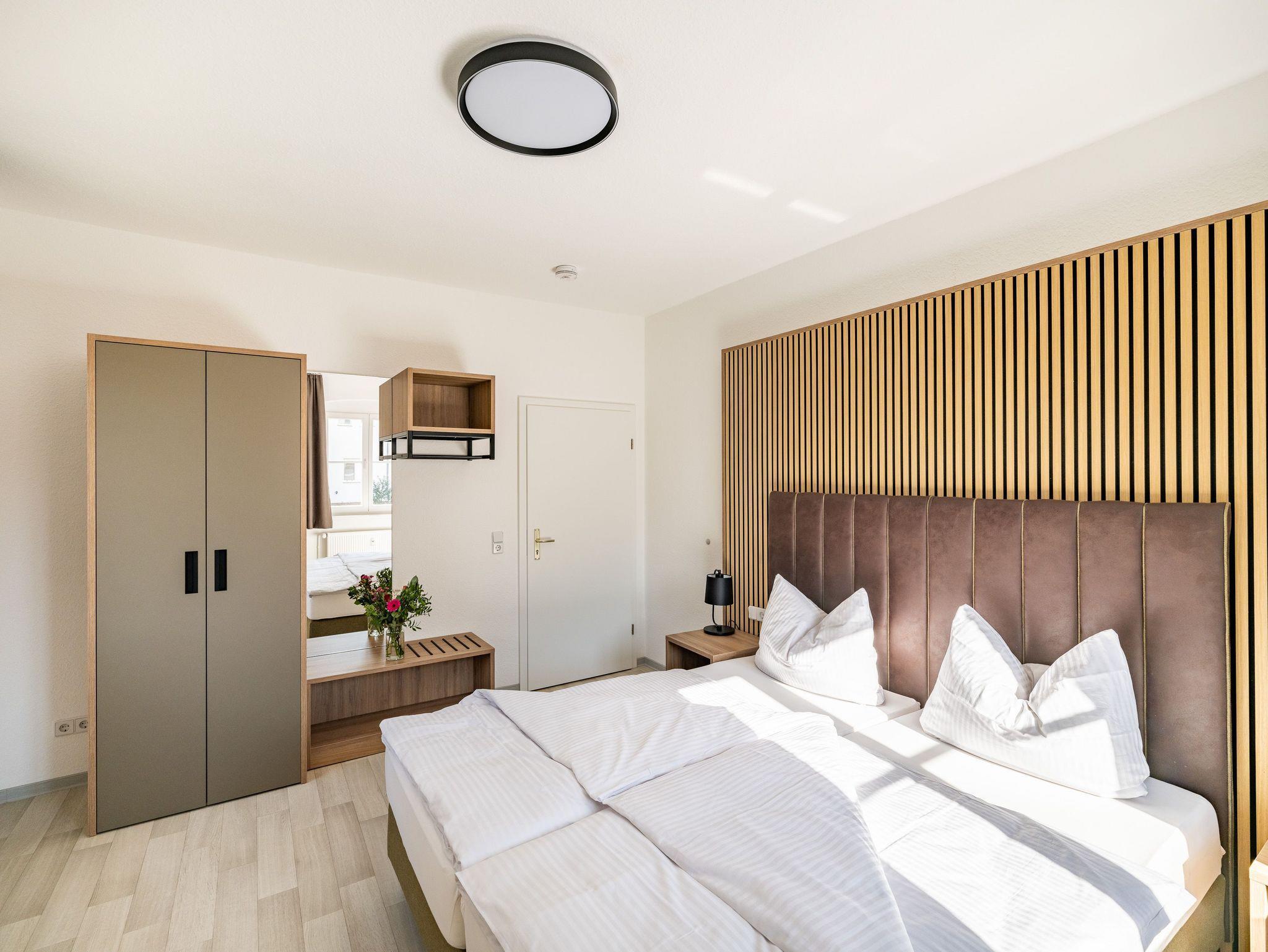 Die Gästewohnung in der Karl-Marx-Str. 42 hat 1 Wohnzimmer, 1 Schlafzimmer, 1 Kinderzimmer, 1 Küche und 1 Bad mit Dusche. Sie hat eine Wohnfläche von 60m² bietet Platz für bis zu 5 Personen, ist komplett eingerichet und verfügt über ein Doppelbett im Schlafzimmer, 1 Schlafsofa im Wohnzimmer, ein Einzelbett im 2.Schlafzimmer sowie TV und WLAN. Zudem befinden sich im Keller des Hauses eine Waschmaschine und ein Trockner. In unmittelbarer Nähe befindet sich unser hauseigenes Restaurant und Café Wilhelm