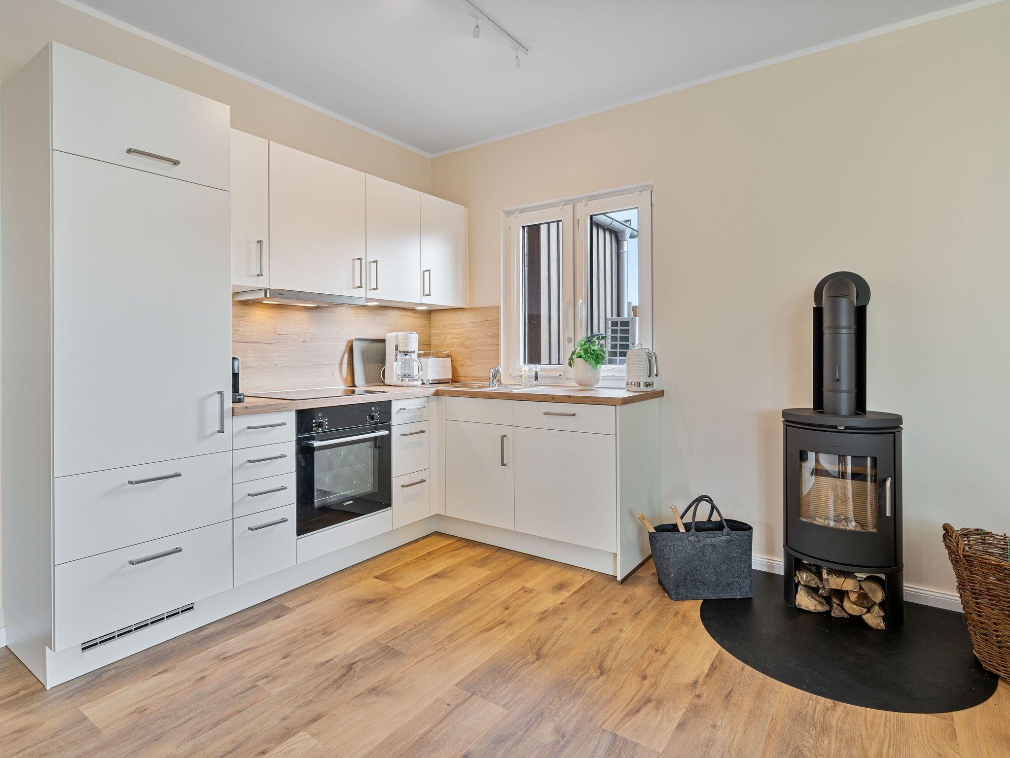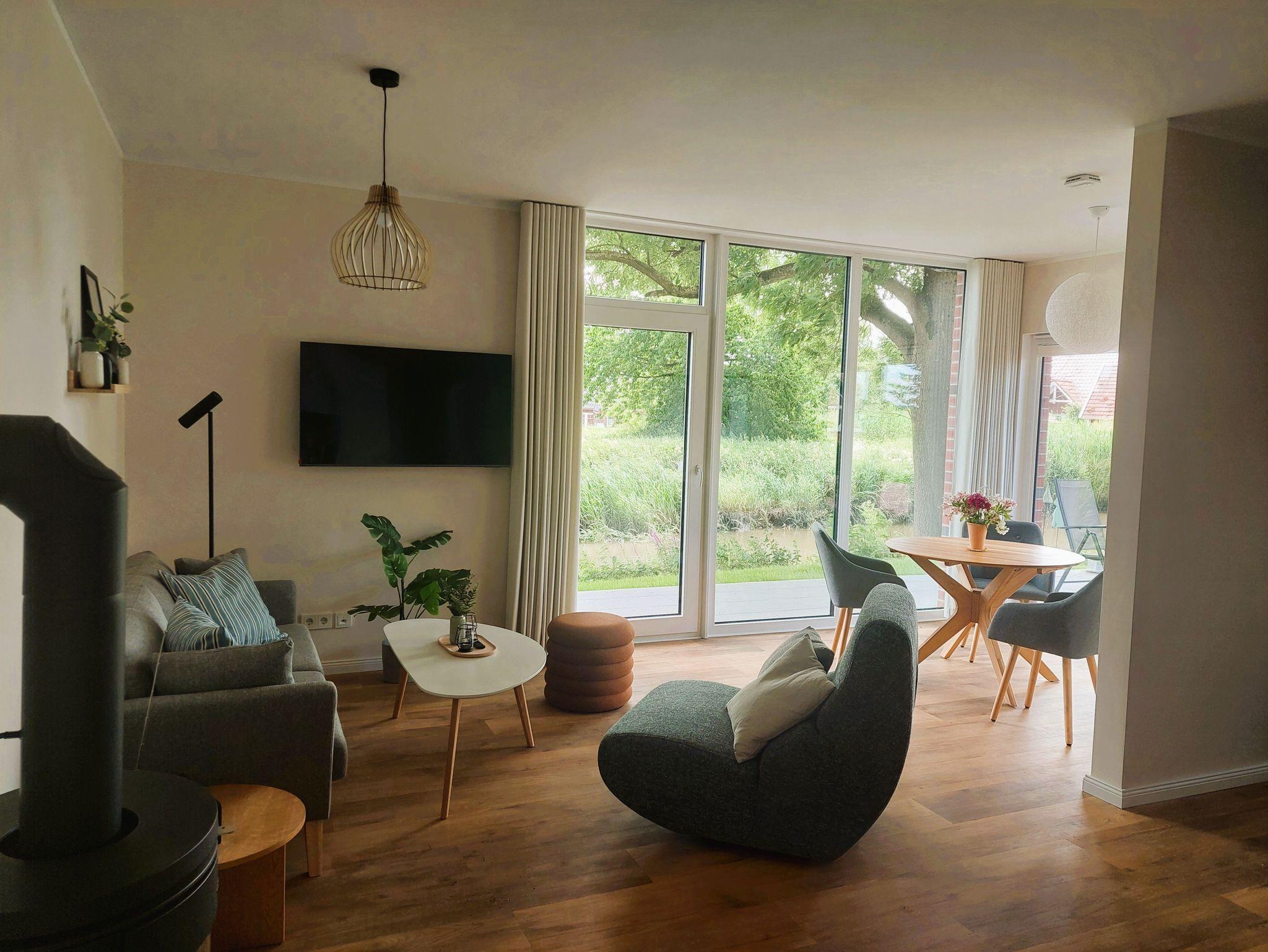 • Wohnraum mit offener Küche, Smart-TV, Radio, Kaminofen, 2 Terrassentüren