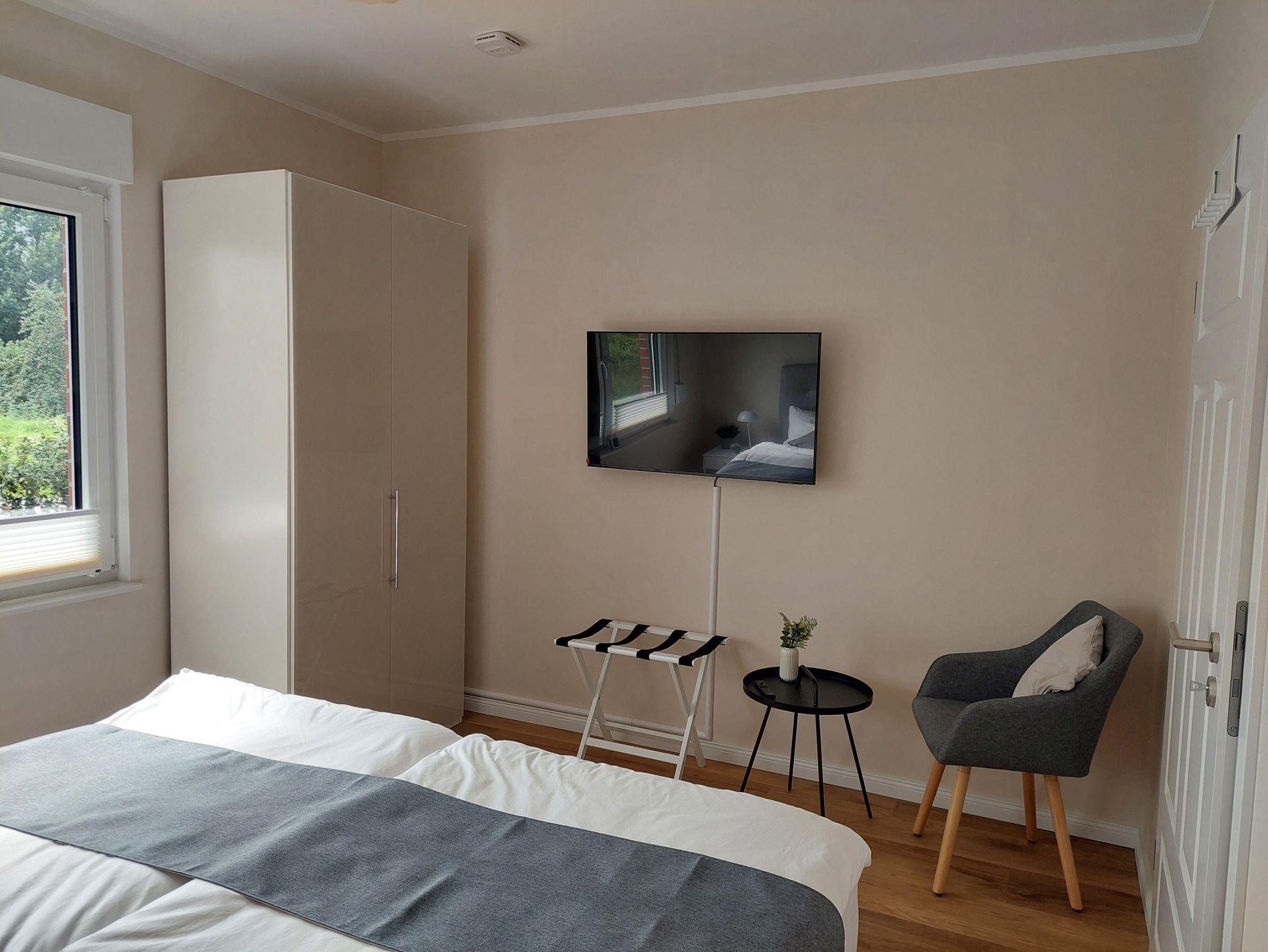 • Schlafzimmer mit Boxspring-Doppelbett (180x200), Smart-TV, Plissees als Sichtschutz, Rolladen zur Verdunkelung