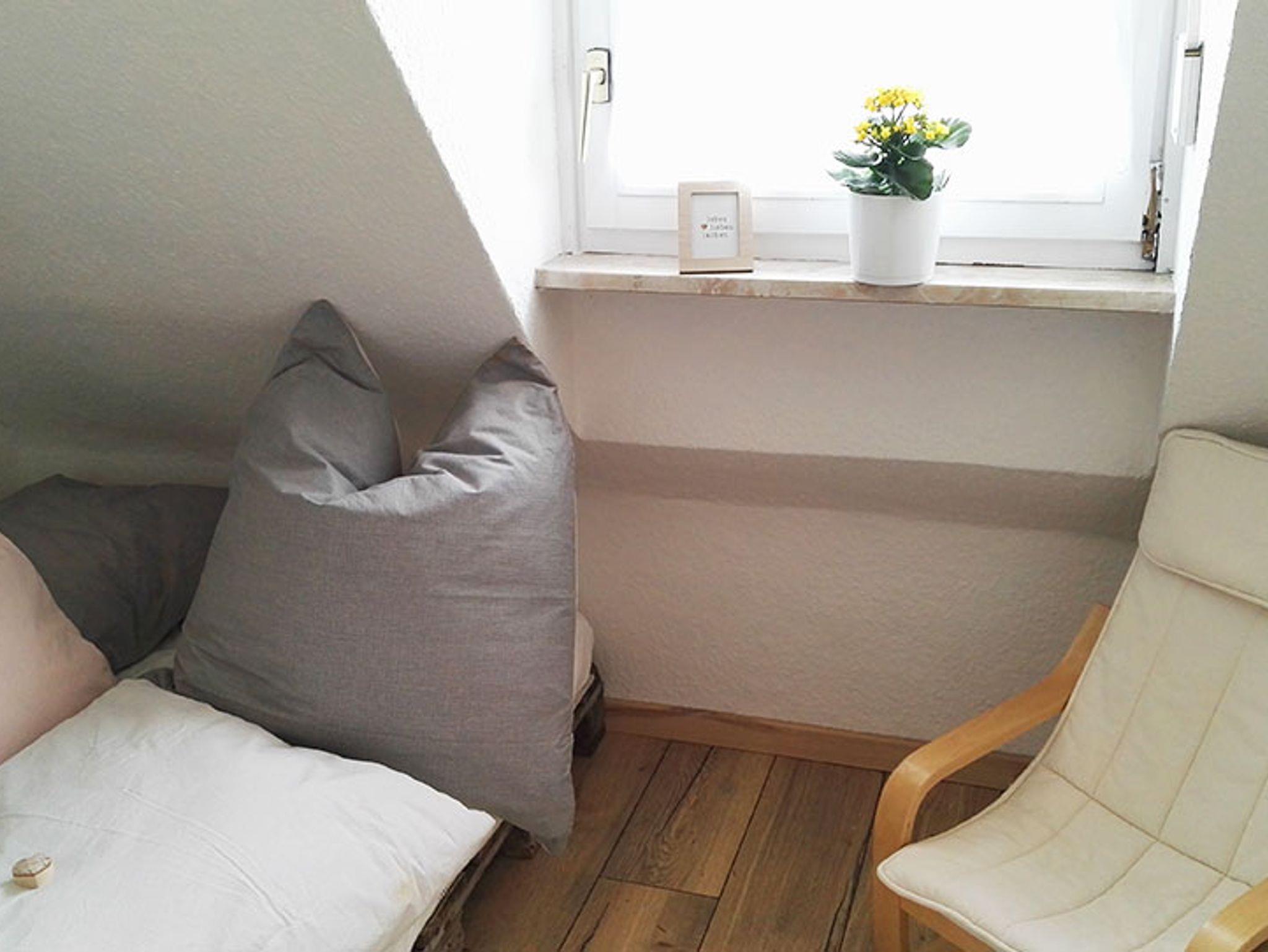 Über eine Holztreppe (Achtung Original-Treppe: kurze Trittstufen + Holz verursacht leichte Geräusche) erreichen Sie das Obergeschoss mit einem kleinen, aber feinen Kinderzimmer (ca. 6 m²). Dort steht „jungen und auch kleinsten Besuchern“ ein selbstgebautes Palettenbett (120 x 190 cm) zur Verfügung, was zum Schlafen aber auch tagsüber zum Lesen oder entspannen einlädt. Natürlich dürfen hier auch zwei Erwachsene träumen (falls Ihnen die Liegefläche zu knapp ist: ein Futonbett ist -auf Wunsch- zum Palettenbett zustellbar, so dass sich eine Liegefläche von 199 x 190 cm ergibt). Es befindet sich in diesem Zimmerchen kein Schrank.