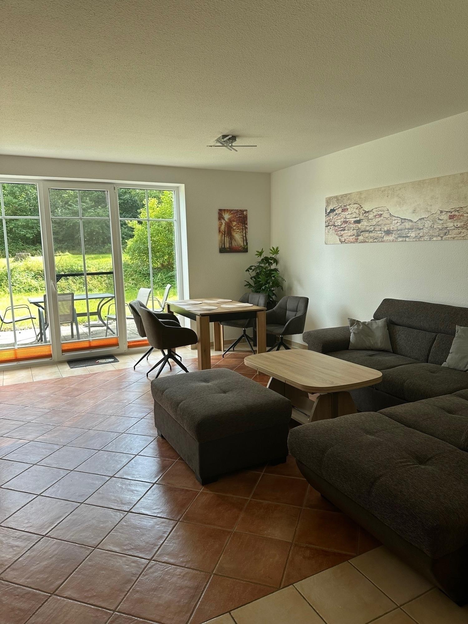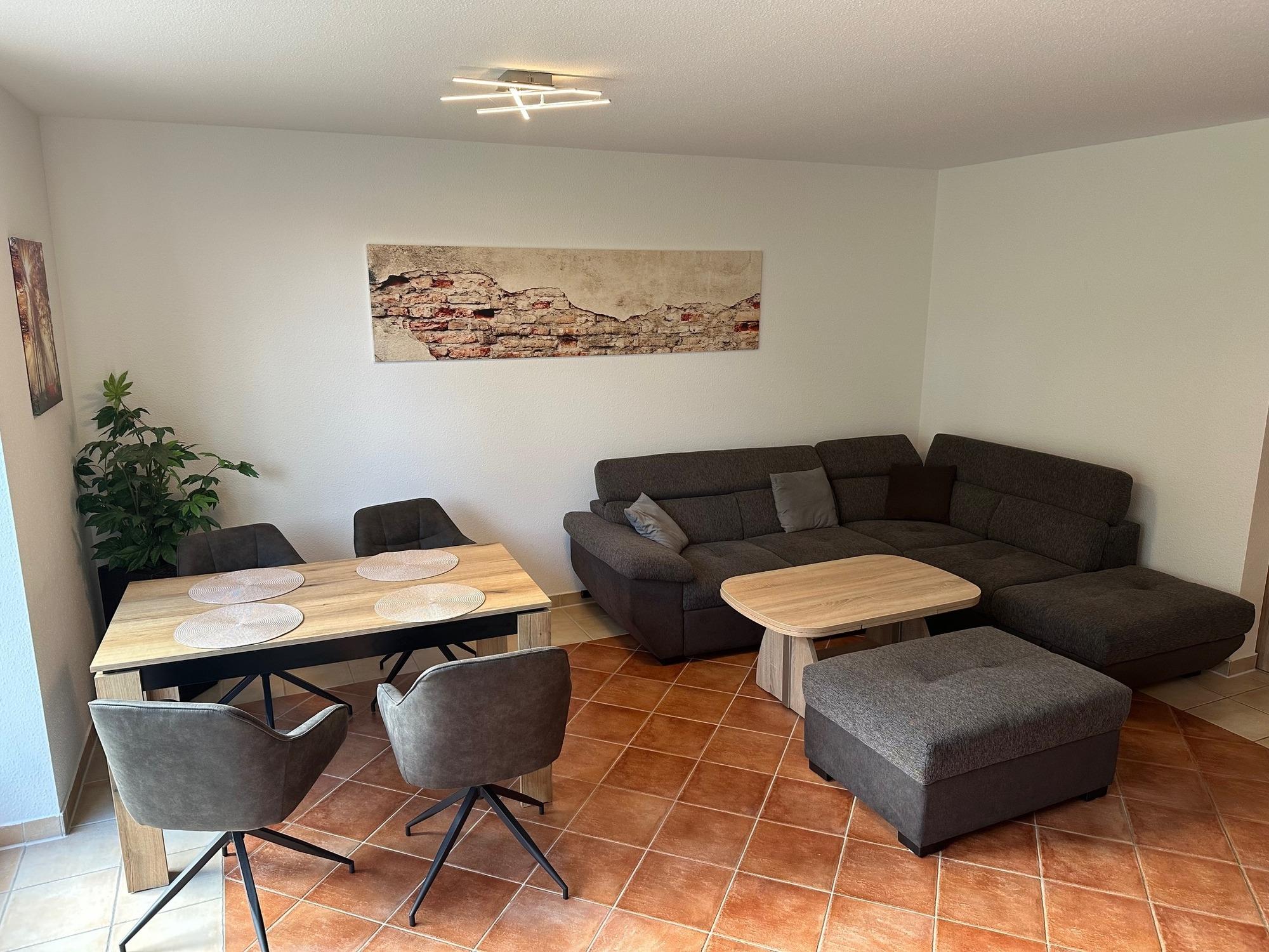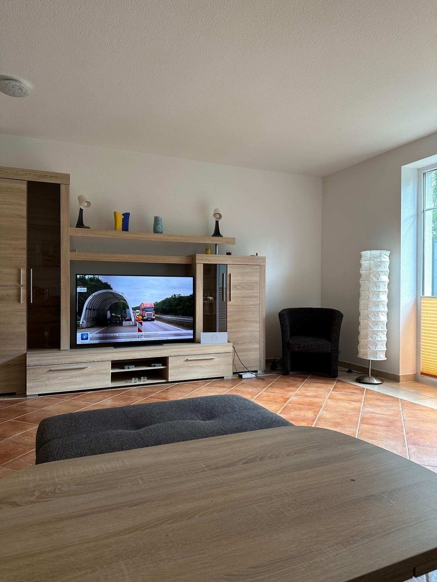 - ein helles Wohnzimmer mit gemütlicher Sitzecke und TV