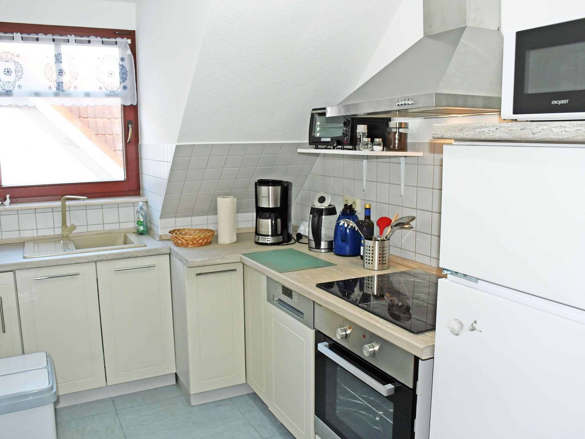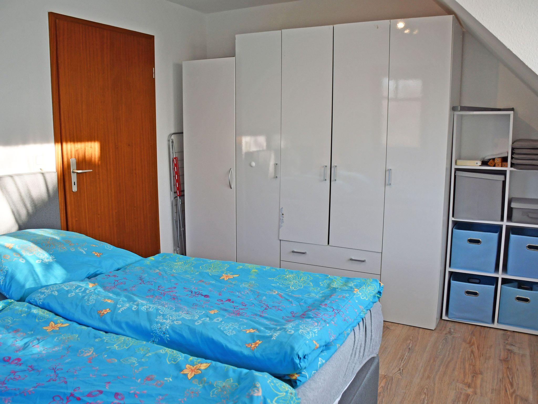 Die Unterkunft im 1. OG bietet auf ca.60qm einen Wohn-/Essbereich mit einem kleinen Eingangsbereich mit Garderobe sowie 2 Balkone (Westseite). In der angrenzenden Küche mit guter Ausstattung können Sie für leibliches Wohl sorgen. Ein kleiner Flur führt zum Tageslichtbad mit Dusche sowie ins Schlafzimmer mit einem gemütlichen Doppelbett, Schrank und einem kleinen Balkon (Westseite). Außerdem gelangen Sie ins zweite Schlafzimmer mit zwei Einzelbetten sowie französischem Balkon.