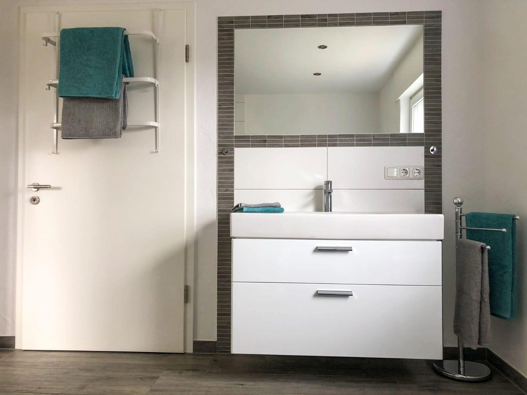 - Das Badezimmer mit ebenerdiger Dusche, WC Waschtisch, Spiegel, Waschmaschine und Wäscheständer.
