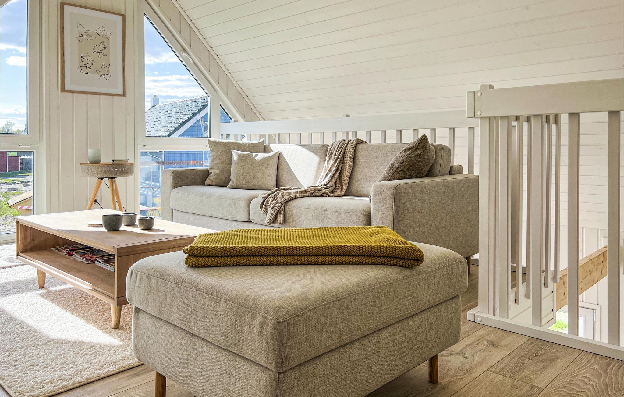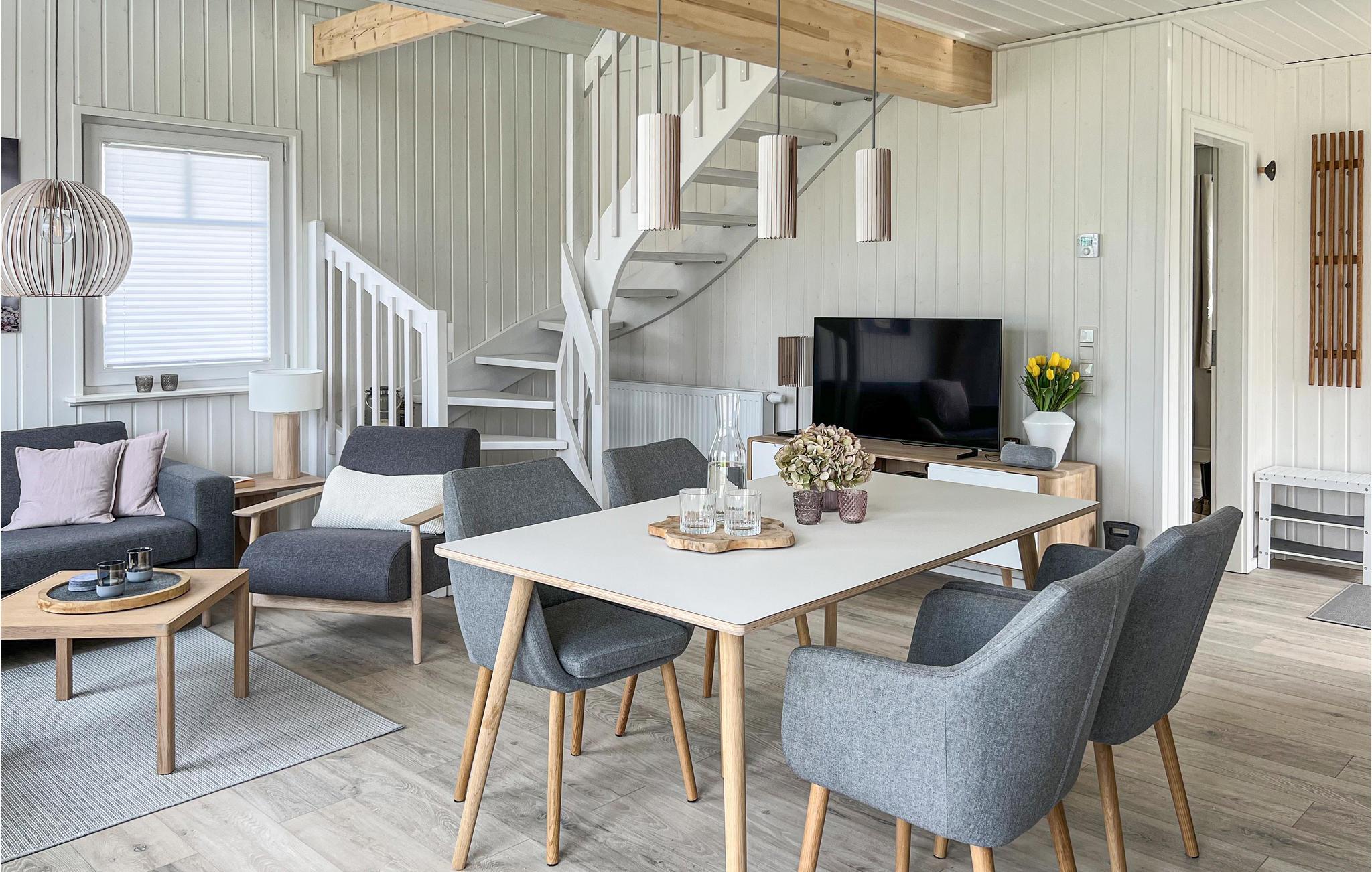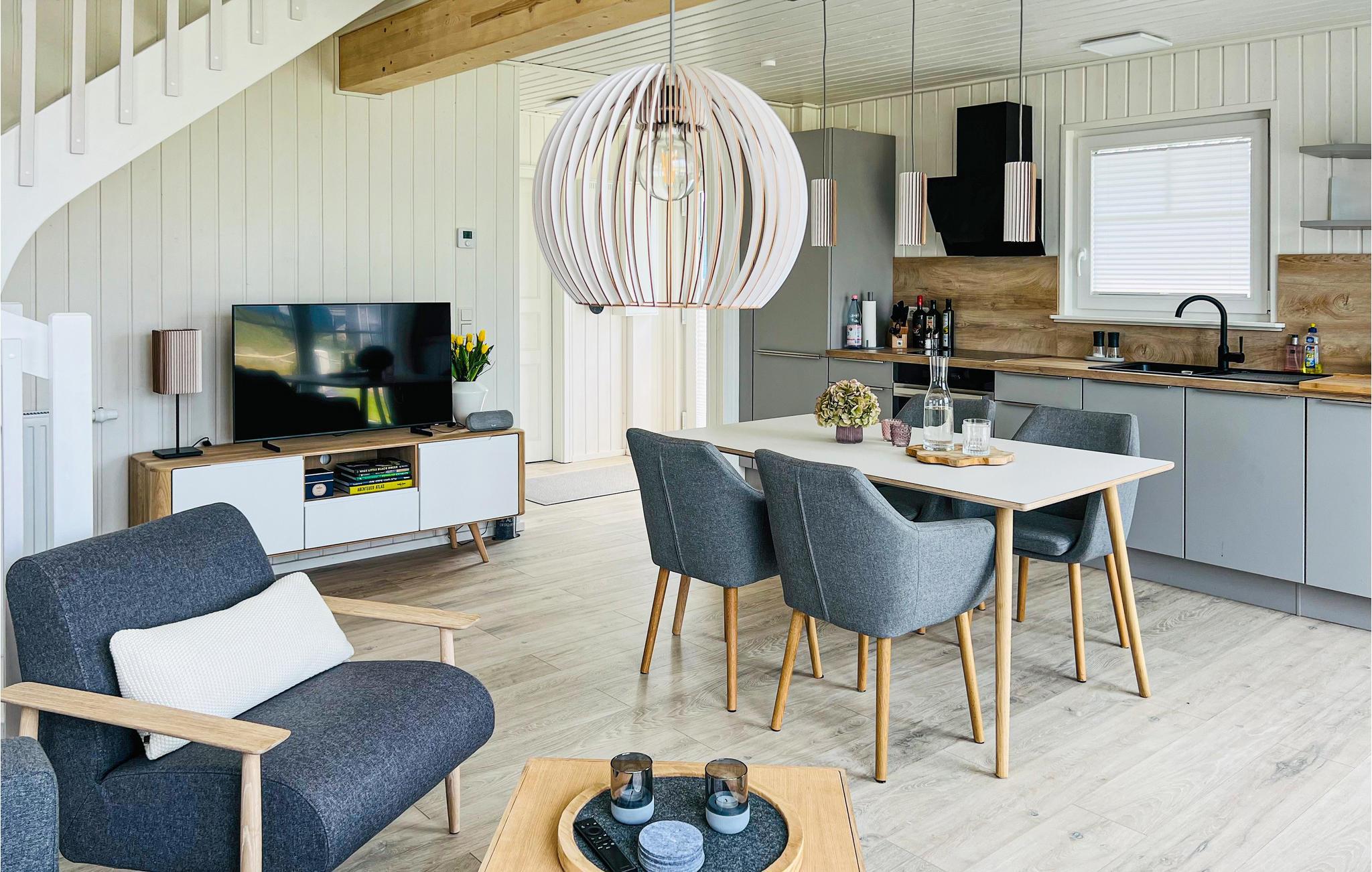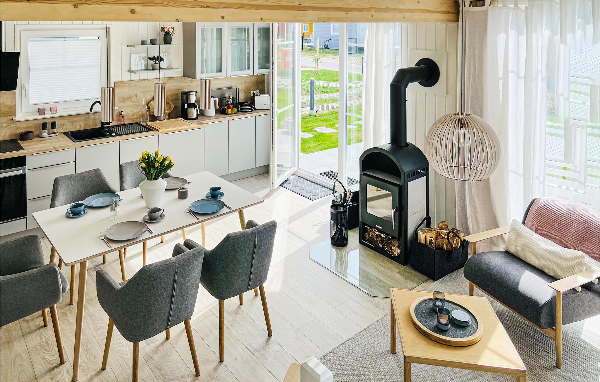 Glæd jer til et skønt ophold i jeres stilfulde skandinavisk designede feriehus. Gulv-til-loft-vinduer i den lyse og indbydende stue tilbyder en fantastisk udsigt over haven og området. Sæt jer godt til rette i den komfortable sofa eller lænestole og varm jer ved brændeovnen på køligere dage. Tilbered lækre retter i det moderne køkken og nyd dem ved spisebordet, perfekt til sammenkomster. Den åbne hems på øverste etage giver ekstra plads til afslapning, læsning eller dagdrømme.