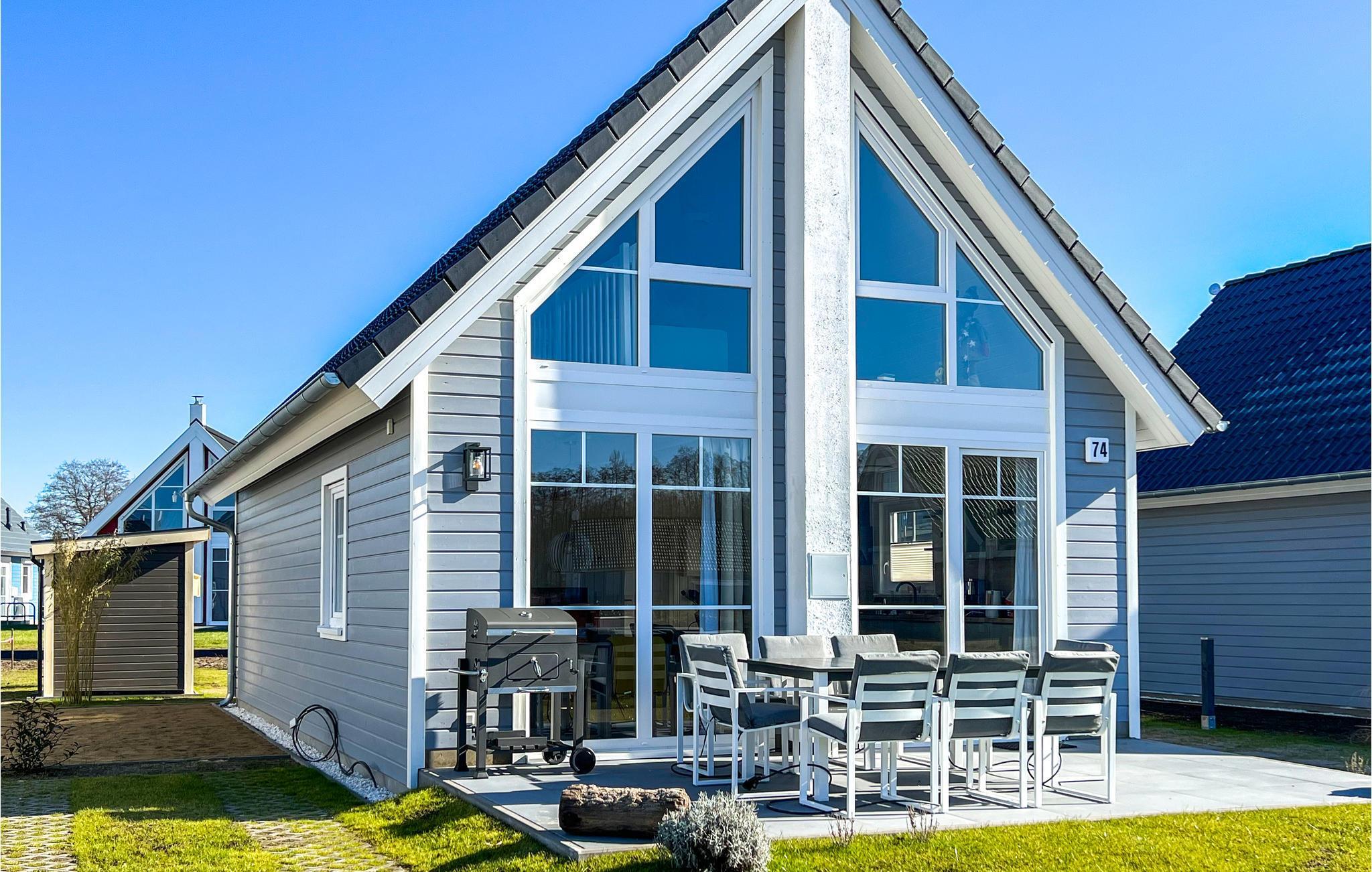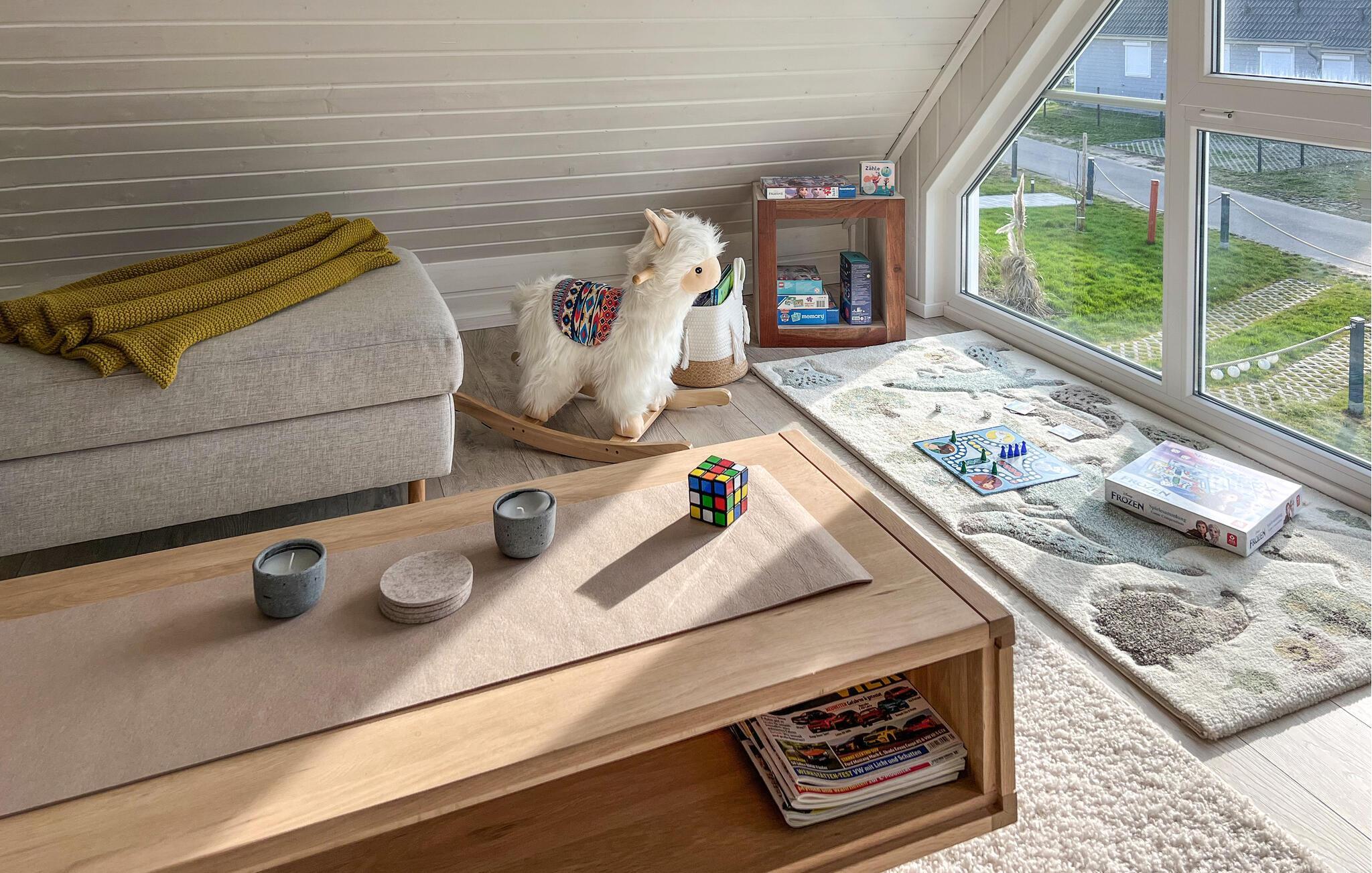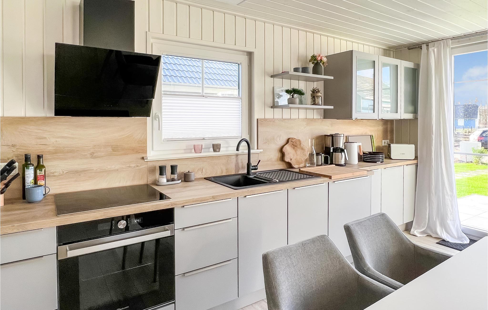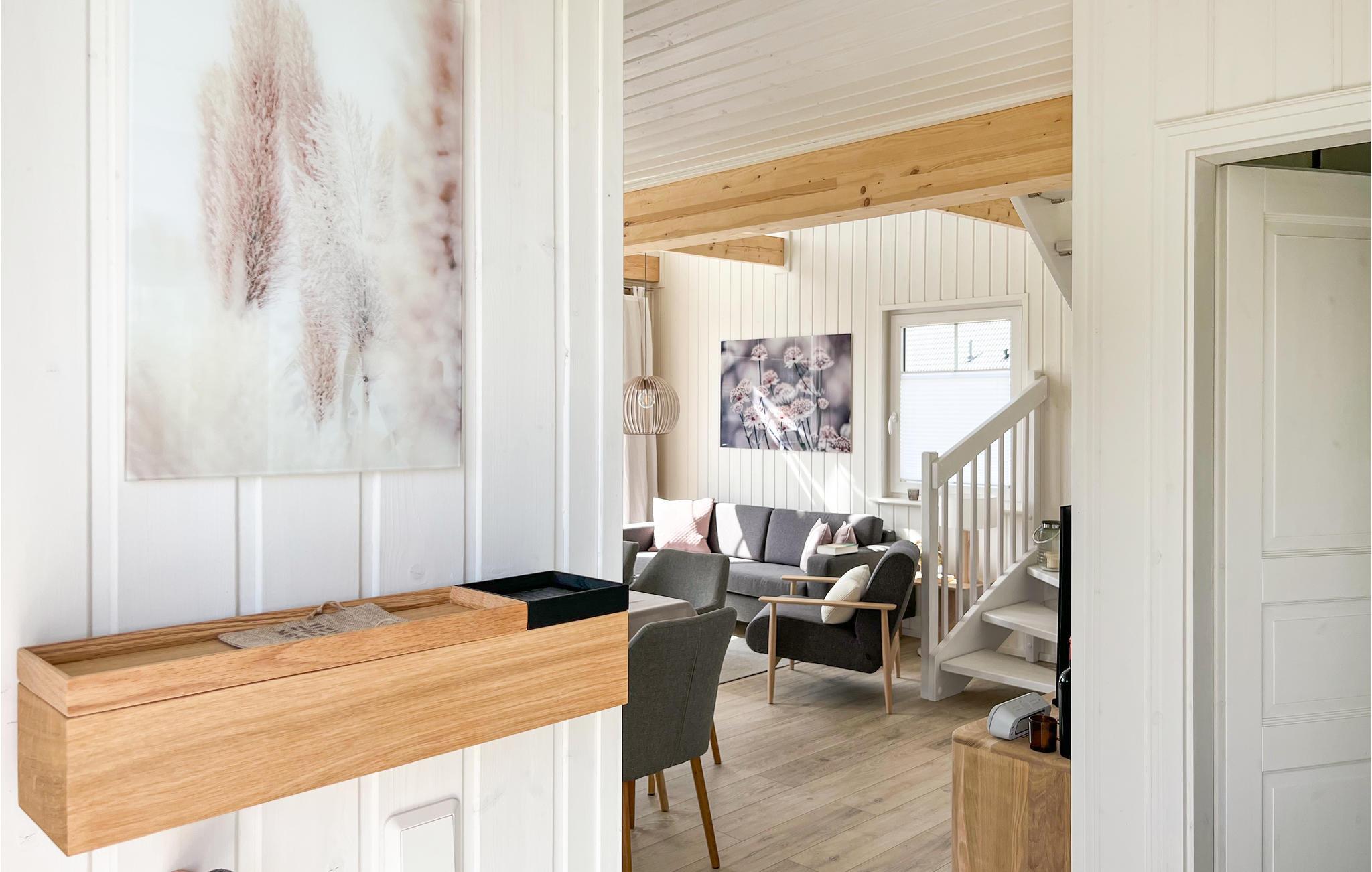 Glæd jer til et skønt ophold i jeres stilfulde skandinavisk designede feriehus. Gulv-til-loft-vinduer i den lyse og indbydende stue tilbyder en fantastisk udsigt over haven og området. Sæt jer godt til rette i den komfortable sofa eller lænestole og varm jer ved brændeovnen på køligere dage. Tilbered lækre retter i det moderne køkken og nyd dem ved spisebordet, perfekt til sammenkomster. Den åbne hems på øverste etage giver ekstra plads til afslapning, læsning eller dagdrømme.