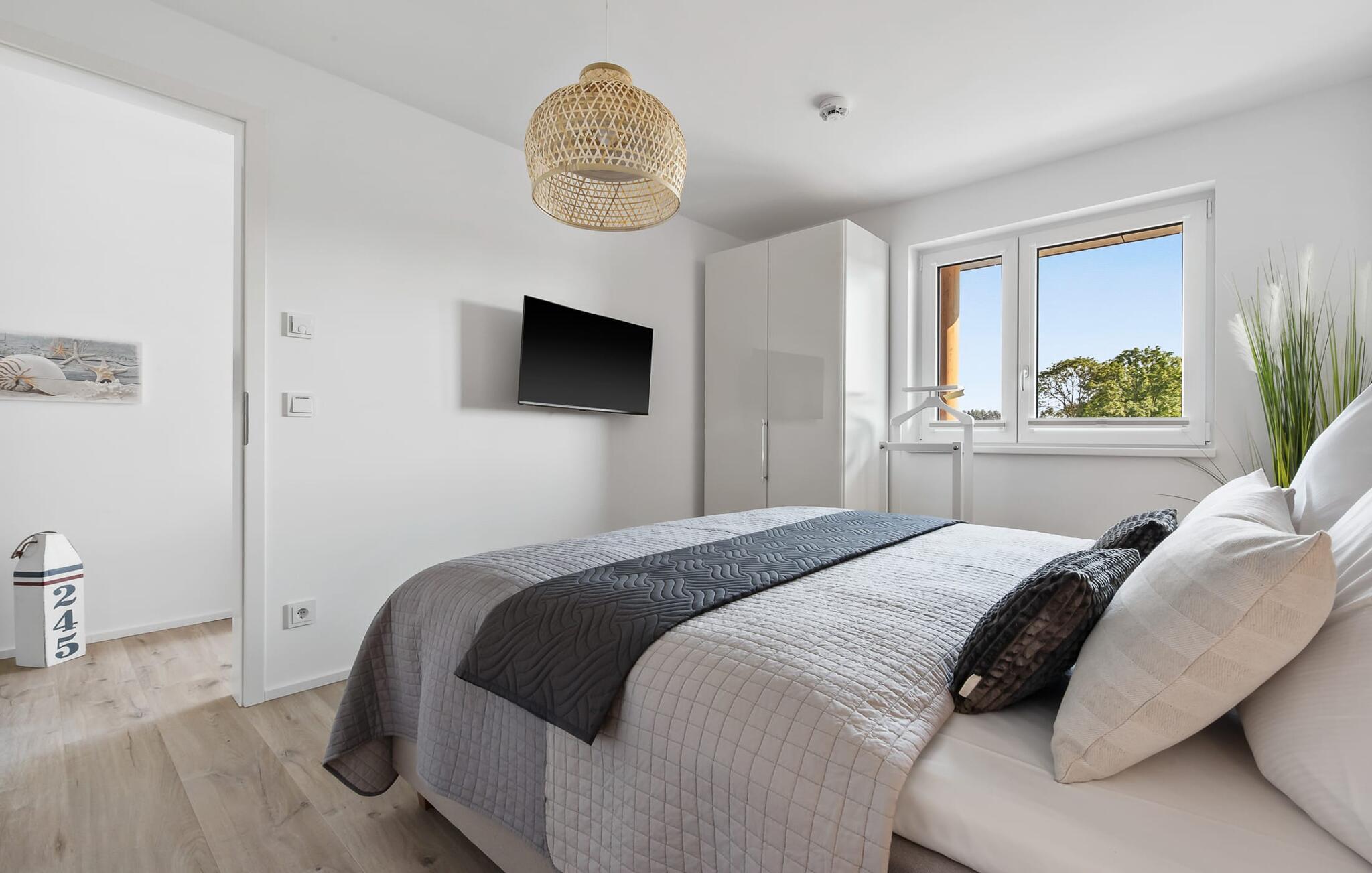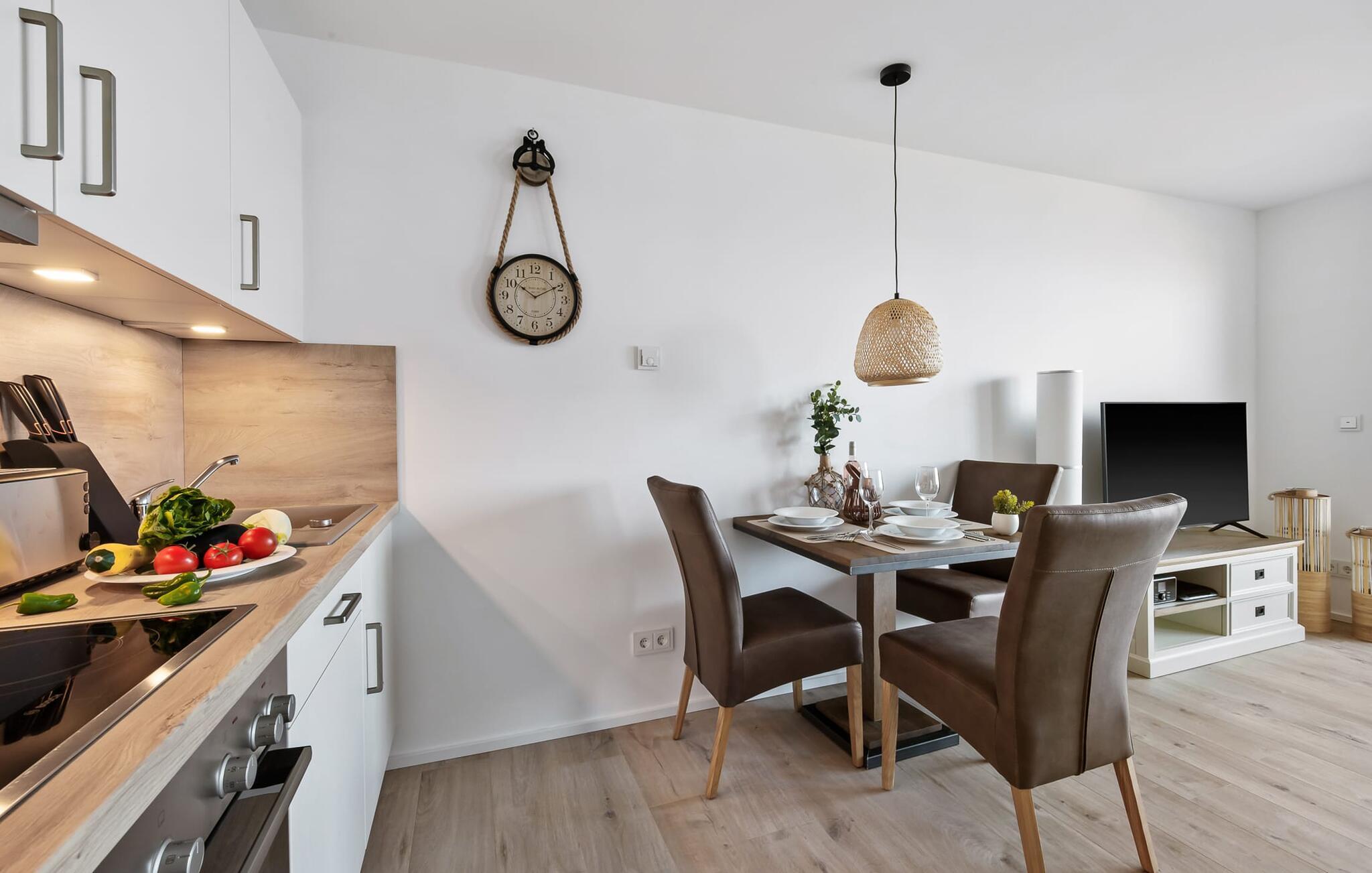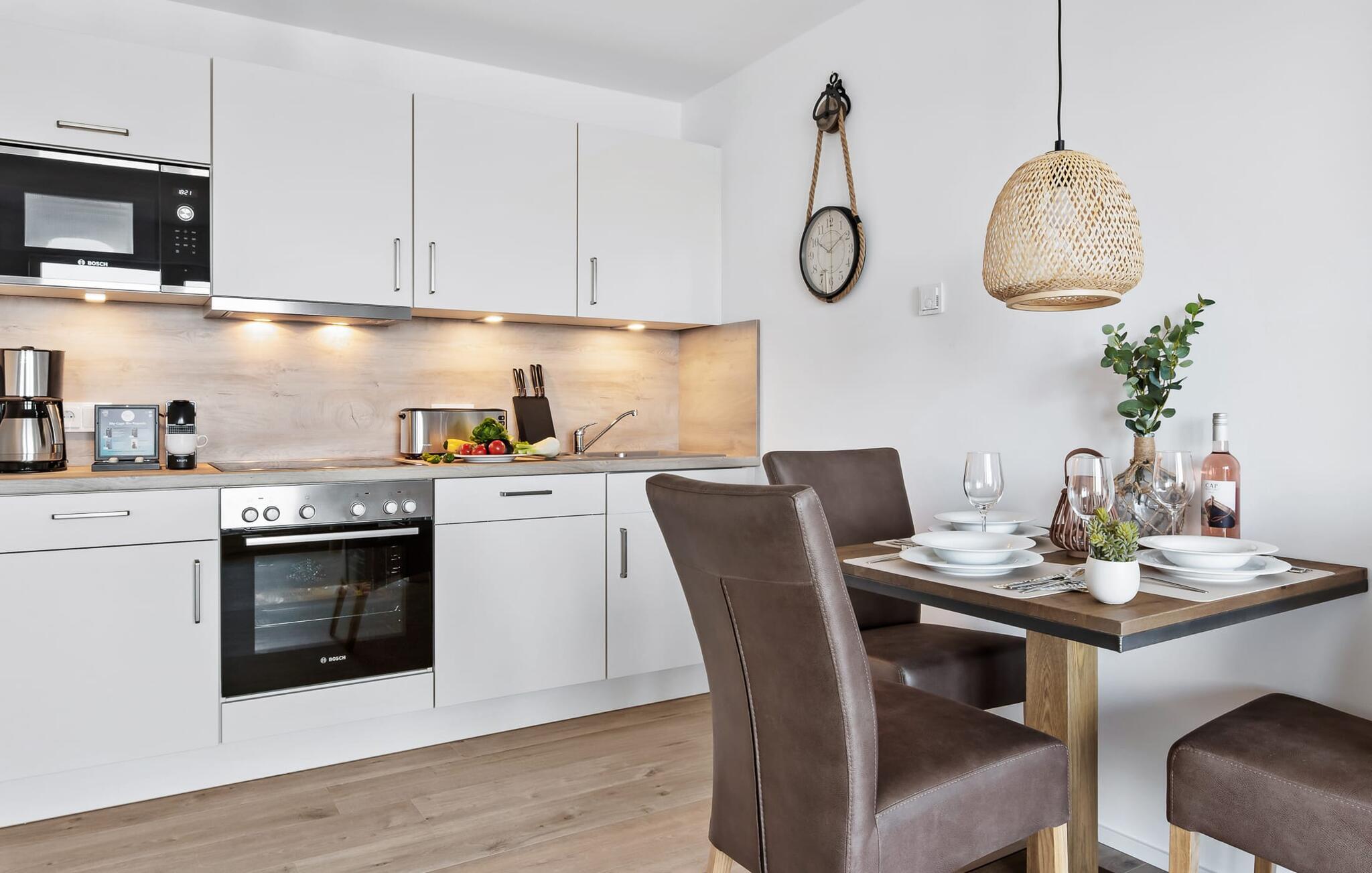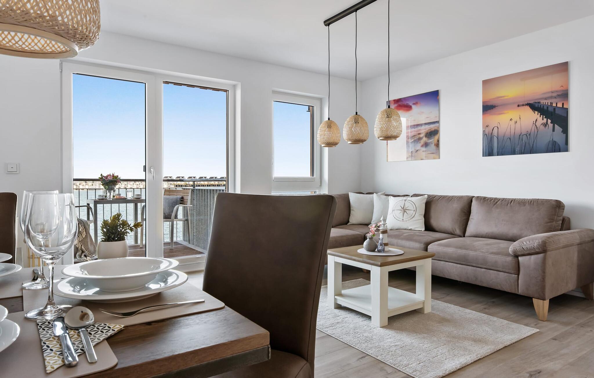 Havnebiograf i fuld effekt: I kan nyde en betagende HAVNEUDSIGT over feriestedets lystbådehavn, østersøfjorden Slien, vores flydende huse og Schimmelünde fyrtårn. Afslut dagen med en af jeres yndlingsromaner ledsaget af en billedskøn solnedgang. Den stilfuldt indrettede ferielejlighed nær vandet ligger direkte på havnepromenaden i OstseeResort Olpenitz og byder på de bedste muligheder for at gå en tur med et voksende udvalg og korte afstande til indkøb. Sandstranden Weidefelder kan også nås hurtigt og giver mulighed for lange gåture på ethvert tidspunkt af året. Lejlighedens eksklusive indretning og udstyr, såsom den vellykkede rumlige forbindelse af det moderne tekøkken til den eksklusive opholdsstue, understreger den hyggelige atmosfære i de rolige omgivelser. I kan se både passere forbi ved indsejlingen til Østersøen fra hele opholds-/spiseområdet og balkonen. EN HARBOR HAVUDSIGT, der er uden sidestykke. Når det kommer til lækre feriemåltider, lader det fuldt udstyrede køkken intet tilbage at ønske. Så nyd de færdige lækkerier på altanen eller start en hyggelig grillaften. Ferielejligheden har soveværelse med dobbeltseng. Her finder I endnu et TV. Det smukke badeværelse har en moderne bruseniche i gulvniveau, en vaskemaskine og et stort spejl. Til lejligheden hører parkeringsplads, hvorfra lejligheden på 1. sal kan nås nemt og barrierefrit via elevator. Vores yndlingssted: Fra balkonen med udsigt til himlen kan I sætte fødderne op og, bevæbnet med en bog, nyde solnedgangen med lyden af havet... Bemærk venligst: OstseeResort Olpenitz er meget populært, og der bygges fortsat i parken. Ikke desto mindre kan I se frem til en 5-stjernet standard og et førsteklasses ophold. Byggeaktiviteterne kommer ikke til at forstyrre jer på ferien, og derfor gives der ikke yderligere afslag i prisen.