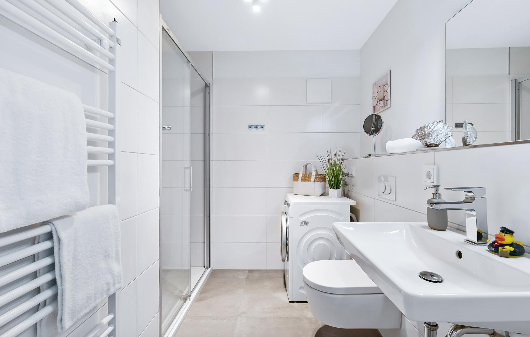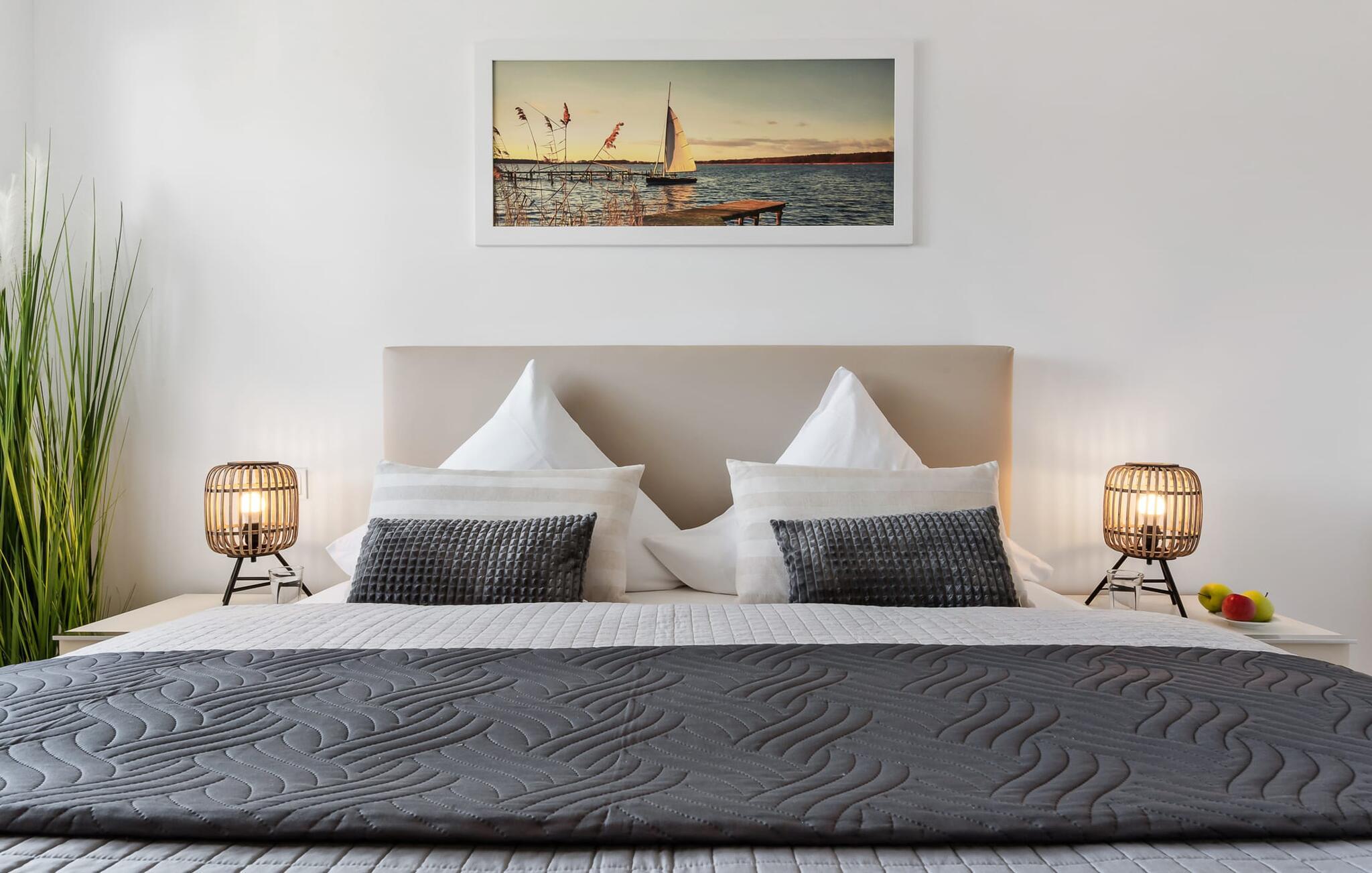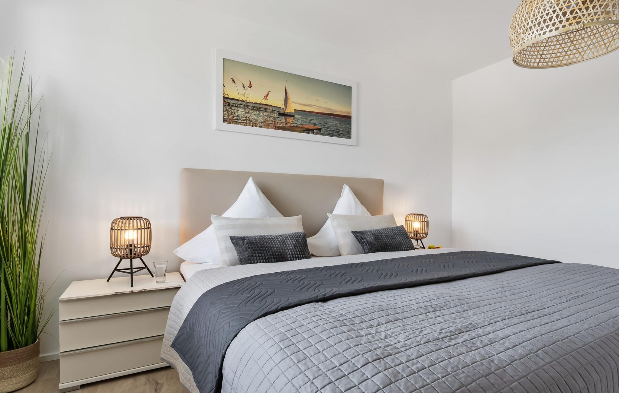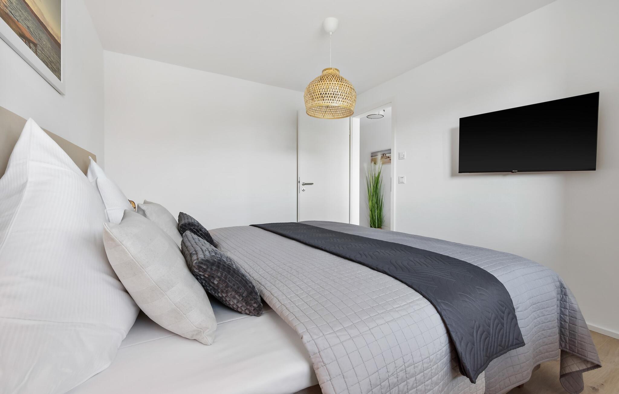 Havnebiograf i fuld effekt: I kan nyde en betagende HAVNEUDSIGT over feriestedets lystbådehavn, østersøfjorden Slien, vores flydende huse og Schimmelünde fyrtårn. Afslut dagen med en af jeres yndlingsromaner ledsaget af en billedskøn solnedgang. Den stilfuldt indrettede ferielejlighed nær vandet ligger direkte på havnepromenaden i OstseeResort Olpenitz og byder på de bedste muligheder for at gå en tur med et voksende udvalg og korte afstande til indkøb. Sandstranden Weidefelder kan også nås hurtigt og giver mulighed for lange gåture på ethvert tidspunkt af året. Lejlighedens eksklusive indretning og udstyr, såsom den vellykkede rumlige forbindelse af det moderne tekøkken til den eksklusive opholdsstue, understreger den hyggelige atmosfære i de rolige omgivelser. I kan se både passere forbi ved indsejlingen til Østersøen fra hele opholds-/spiseområdet og balkonen. EN HARBOR HAVUDSIGT, der er uden sidestykke. Når det kommer til lækre feriemåltider, lader det fuldt udstyrede køkken intet tilbage at ønske. Så nyd de færdige lækkerier på altanen eller start en hyggelig grillaften. Ferielejligheden har soveværelse med dobbeltseng. Her finder I endnu et TV. Det smukke badeværelse har en moderne bruseniche i gulvniveau, en vaskemaskine og et stort spejl. Til lejligheden hører parkeringsplads, hvorfra lejligheden på 1. sal kan nås nemt og barrierefrit via elevator. Vores yndlingssted: Fra balkonen med udsigt til himlen kan I sætte fødderne op og, bevæbnet med en bog, nyde solnedgangen med lyden af havet... Bemærk venligst: OstseeResort Olpenitz er meget populært, og der bygges fortsat i parken. Ikke desto mindre kan I se frem til en 5-stjernet standard og et førsteklasses ophold. Byggeaktiviteterne kommer ikke til at forstyrre jer på ferien, og derfor gives der ikke yderligere afslag i prisen.