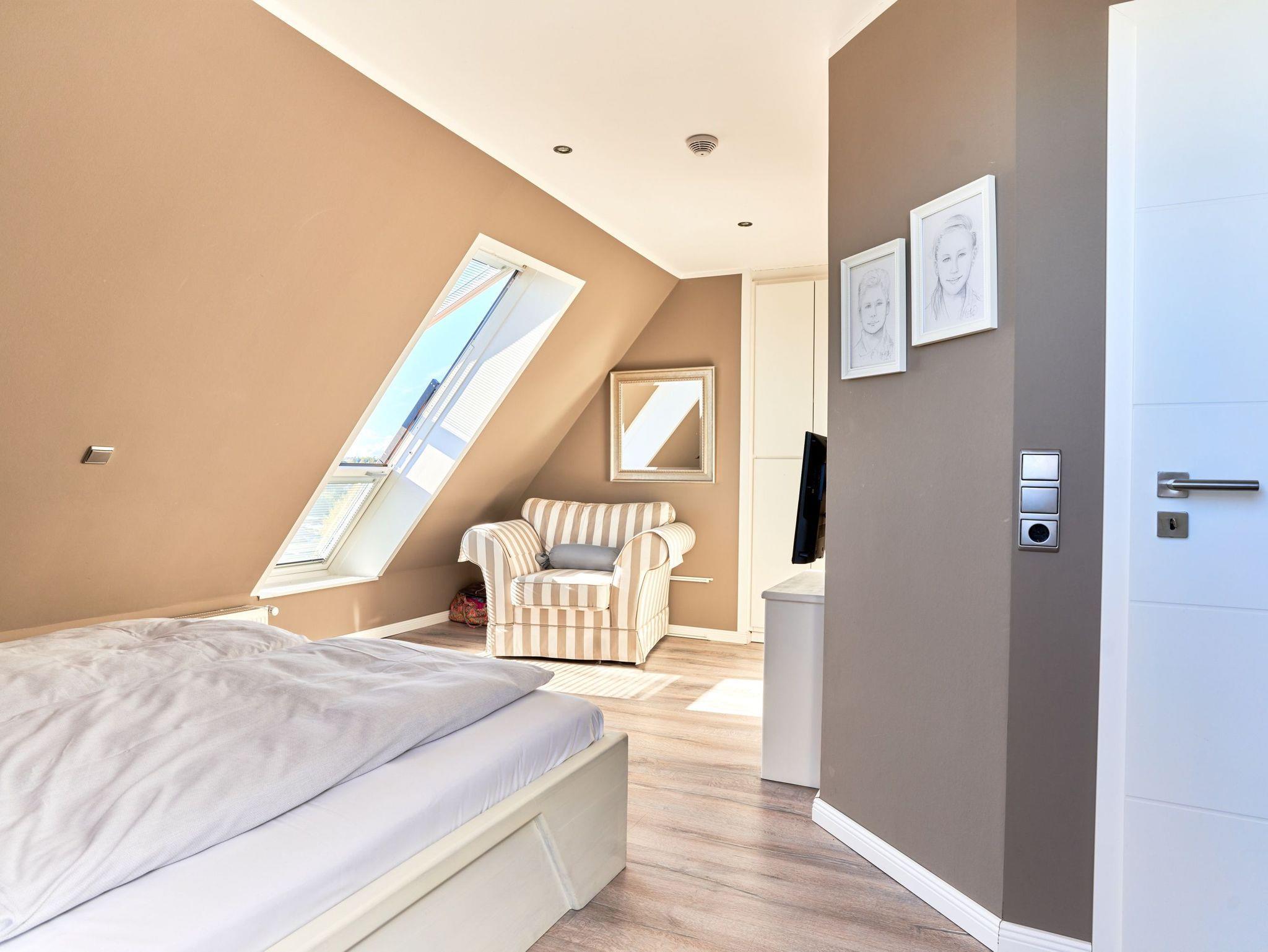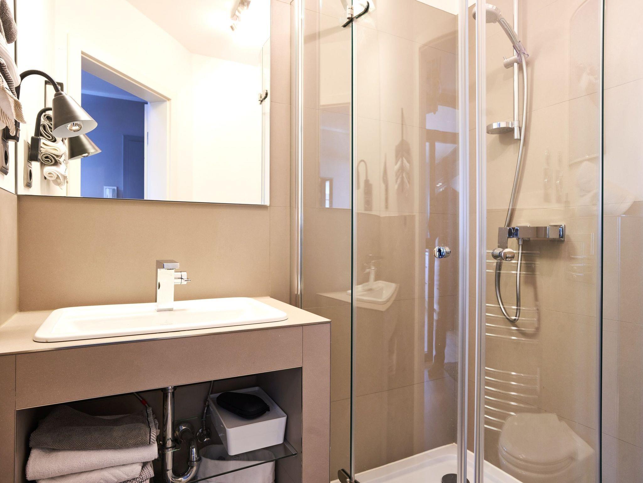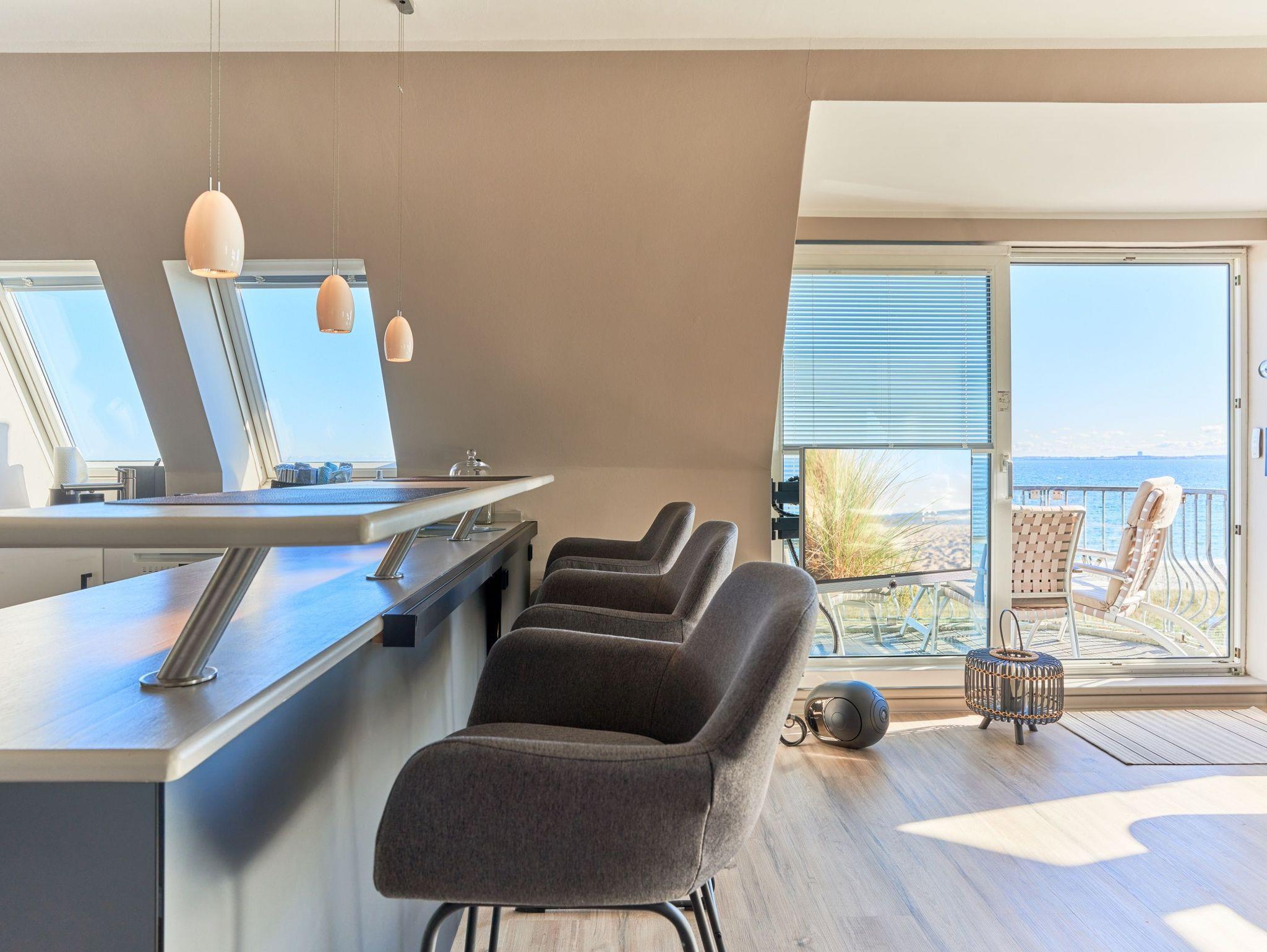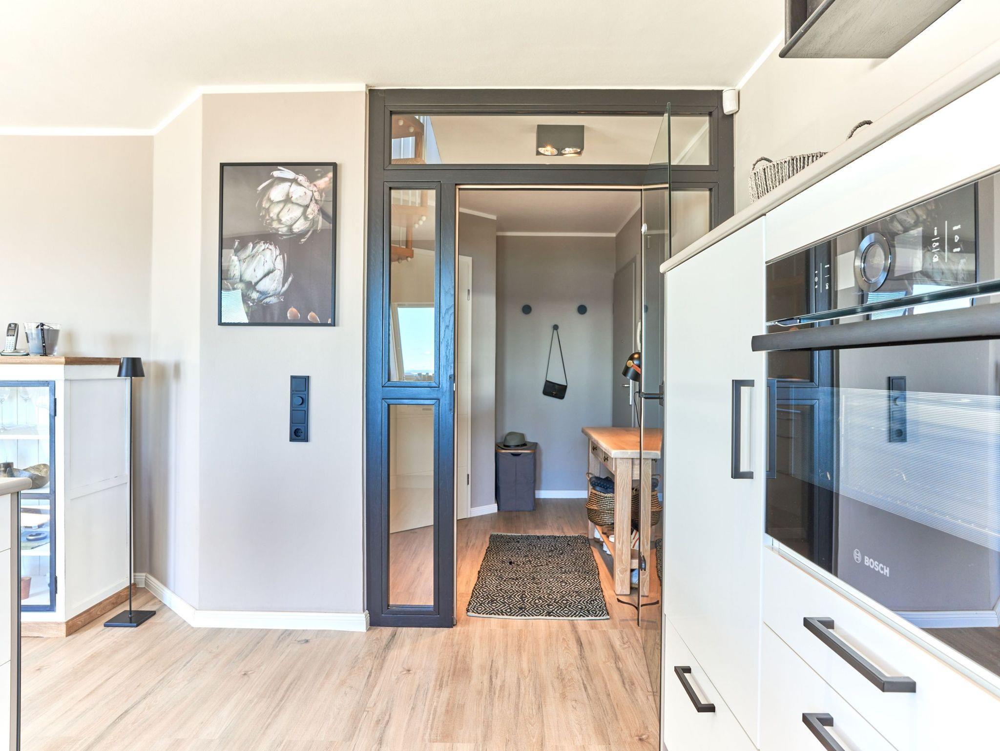 Die ca. 60 m² Ferienwohnung verteilt sich auf zwei Ebenen. In unteren Teil empfängt Sie ein kleiner Flurbereich bis Sie dann den Wohn-/Essbereich mit ansprechender Wohnzimmergarnitur und Flachbildfernseher, mit offener Küche und Essecke betreten. Die Panoramafenster bieten einen atemberaubenden Blick auf die Ostsee und die ganze Lübecker Bucht. Toller Esstresen sowie eine hochwertige Küchenzeile - hier werden Sie mit einem hohen Anspruch verwöhnt: Thermomix, Kaffee- sowie Nespresso-Maschine, Induktionsherd mit Kochfeldabzug, Mikowelle, Backofen, Spülmaschine und vieles mehr. Über eine Wendeltreppe gelangen Sie in das Schlafzimmer und einem weiteren Duschbad. Ein Einbauschrank und ein Sideboard bieten Platz für Ihre Kleidung. Besonderes Highlight hier: beide Fenster lassen sich mit weinigen Handgriffen zu einem ausklappbaren Balkon umgestalten. Ostseeblick pur!