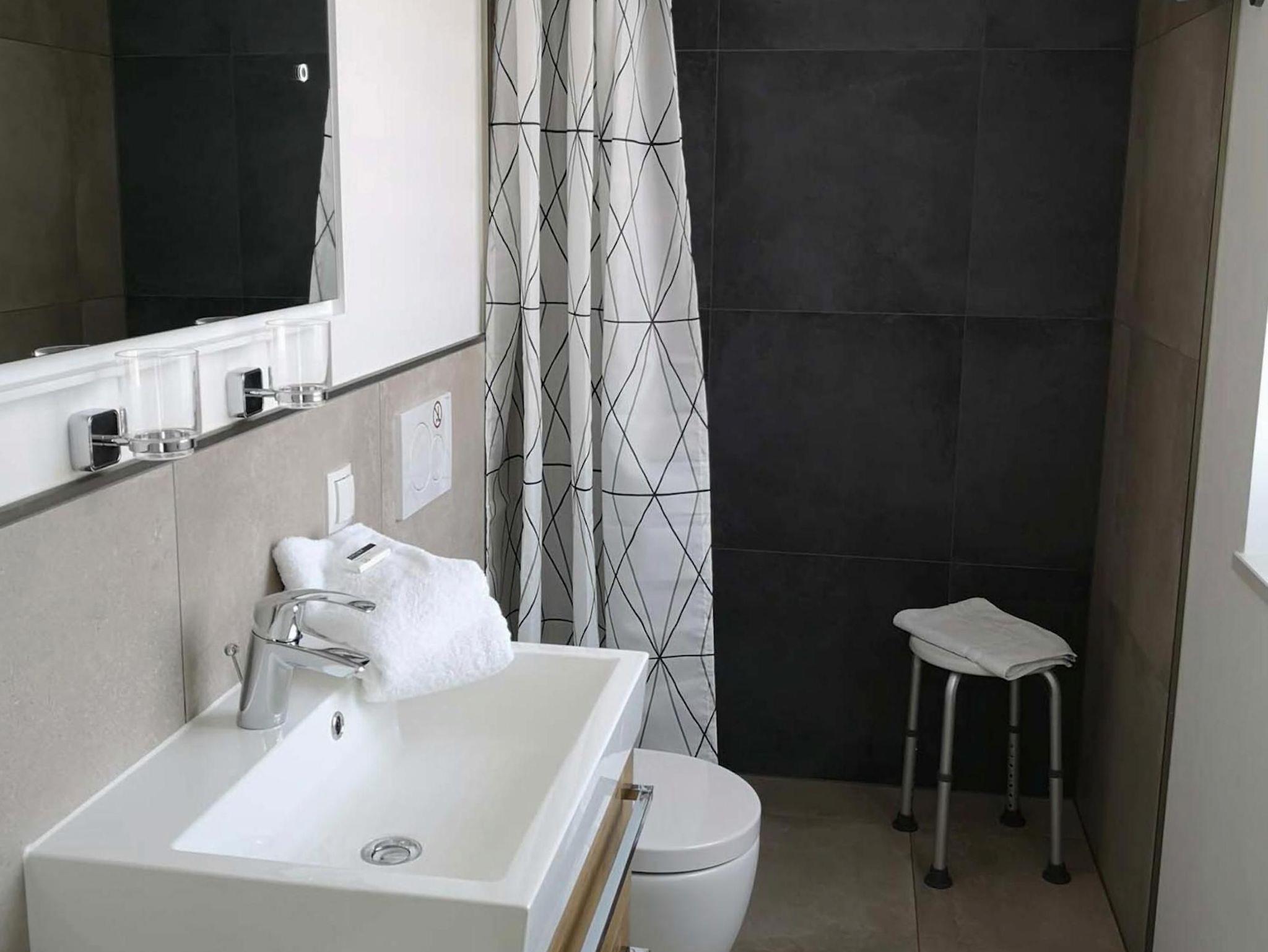 Besonders das ebenerdige Schlafzimmer und Badezimmer mit begehbarer Dusche und Vorhang eignen sich für Senioren oder Menschen mit Einschränkungen.