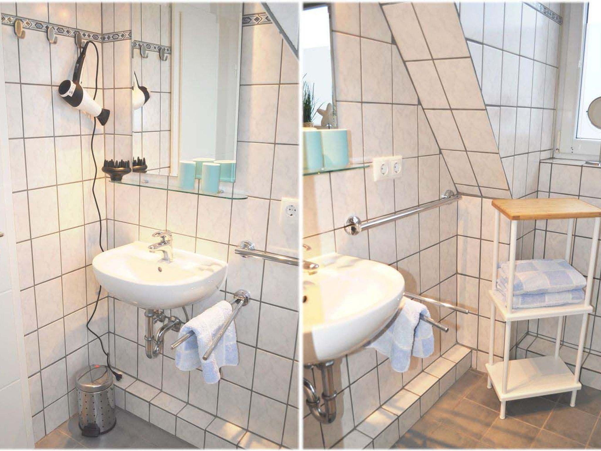 Bad 1: Dusche, Duschkabine, Fön, Handtuchhalter, Kosmetikspiegel, Regal, Spiegel, Waschbecken, WC