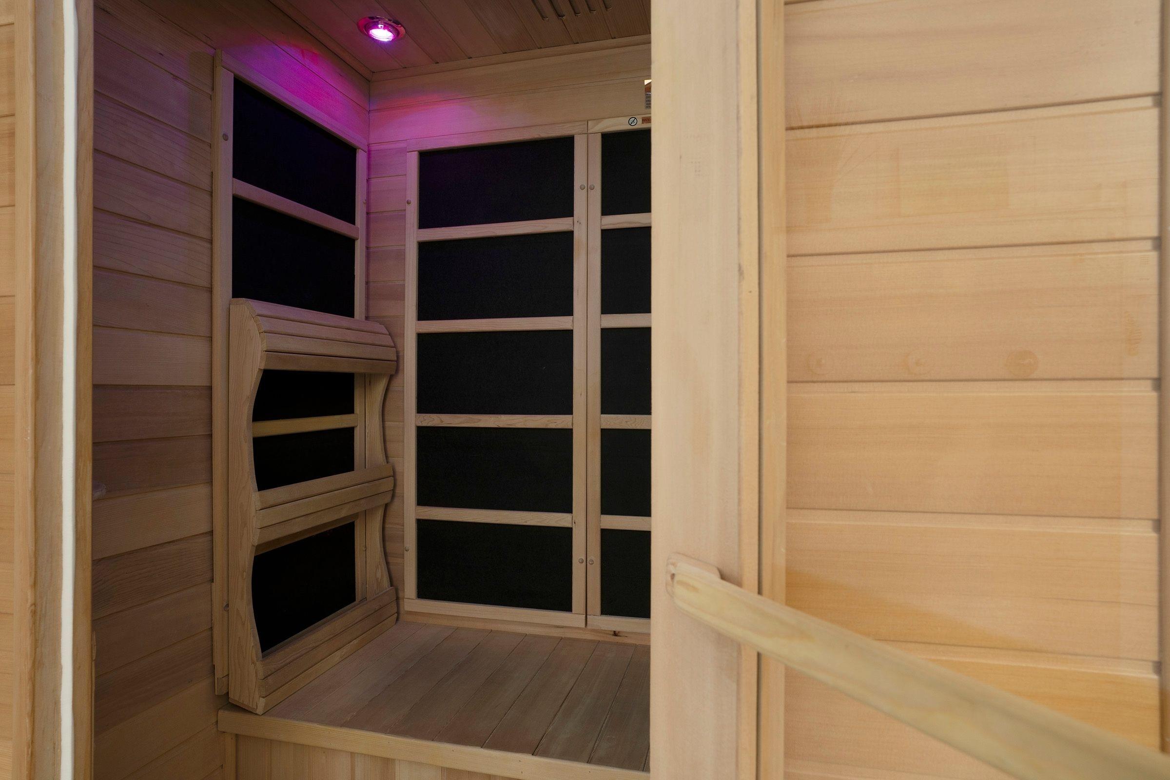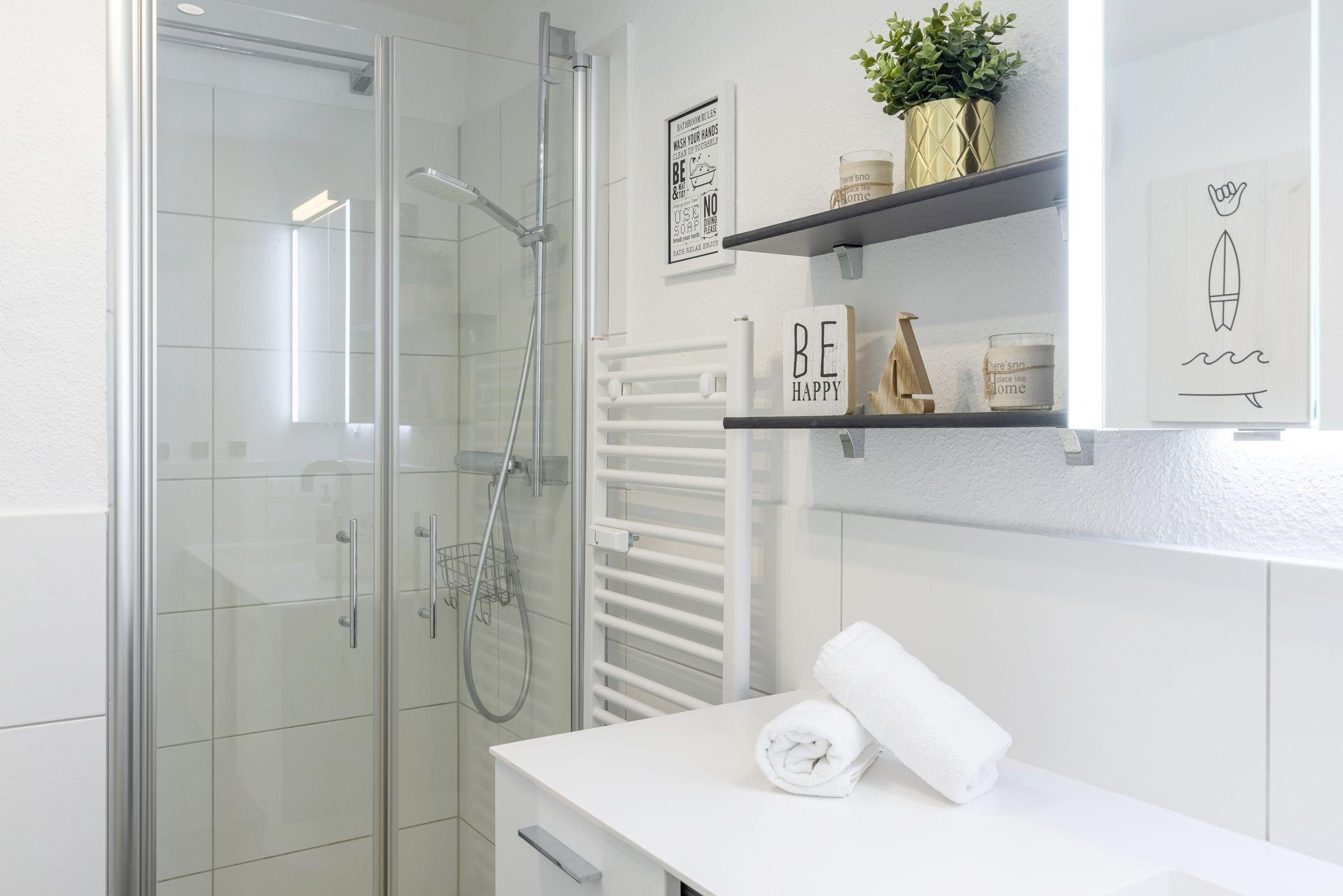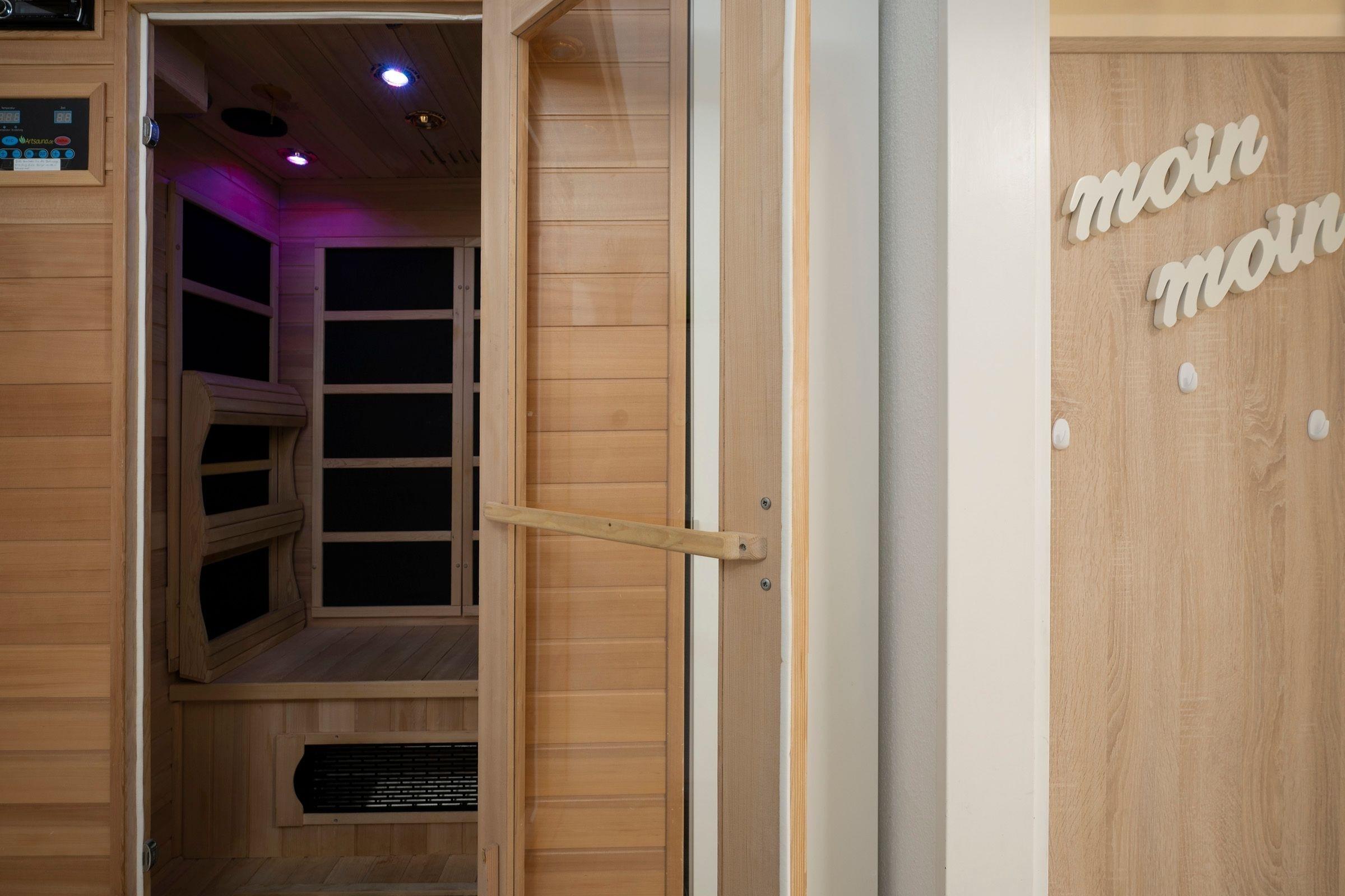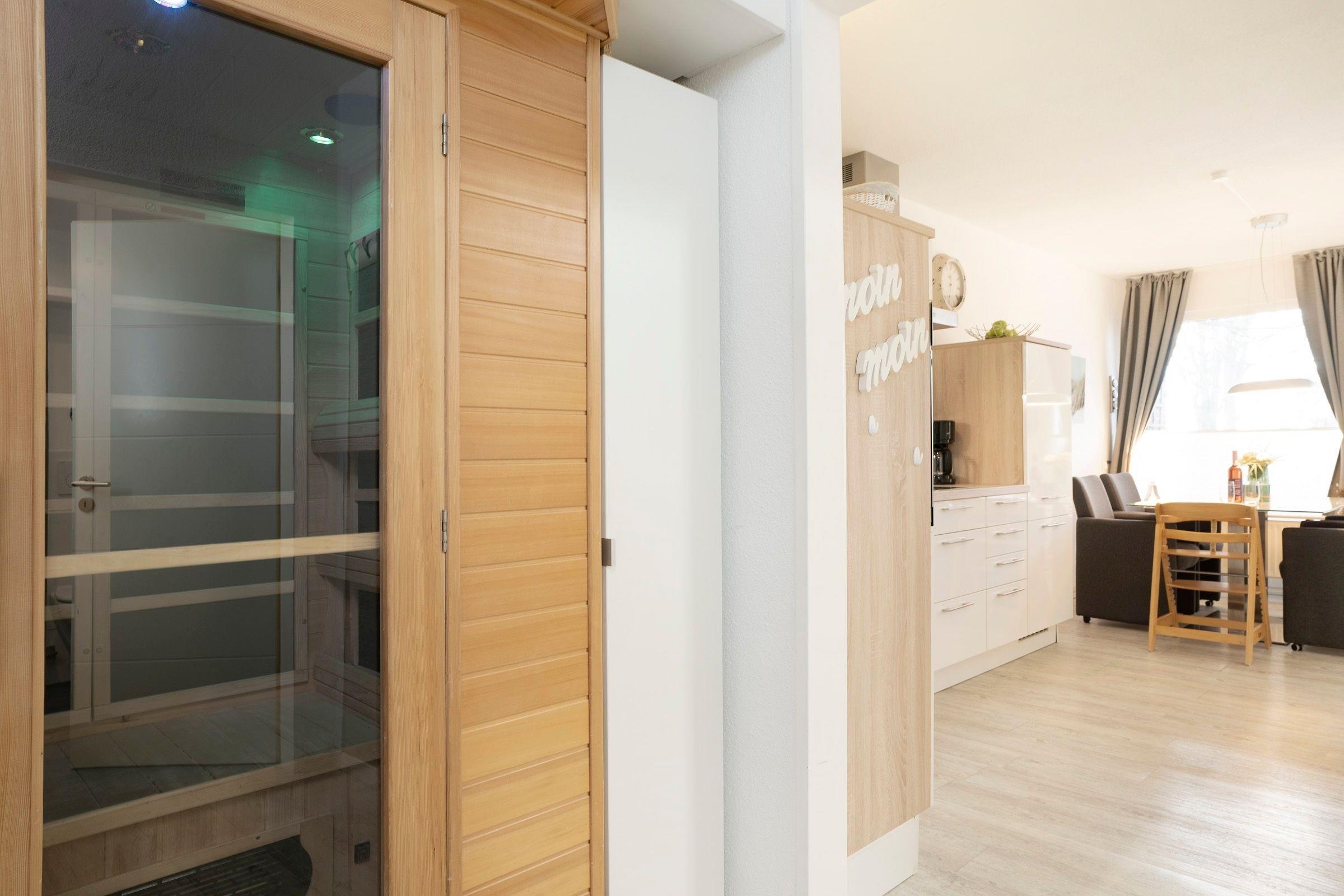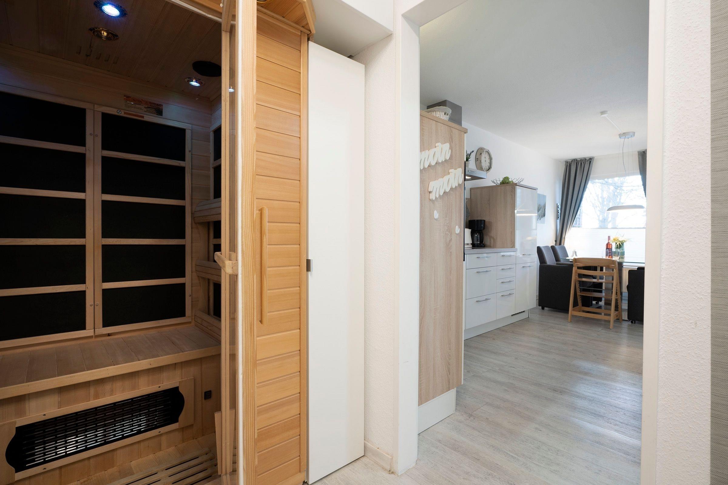 Entzückend eingerichtet ist das kleine innenliegende Schlafzimmer mit Doppelbett (2x80x200cm), Kleiderschrank und Flat-TV. Angenehmes Tageslicht scheint durch die 2 Sprossenfenster zum Wohnzimmer, Rollos sind zum Verdunkeln angebracht. Genießen Sie nach einem langen Strandspaziergang, gerade im Herbst und Winter, einen wohlig warmen Saunagang. Die Sauna können Sie gegen Gebühr nutzen (aufheizbar bis 60 Grad). Direkt gegenüber der Sauna vom Flur liegt das moderne Badezimmer mit WC, Dusche inklusive SmartActive Brausekopf und unterschiedlichen Strahlarten, Handtuchwärmer, Spiegelschrank und Föhn.