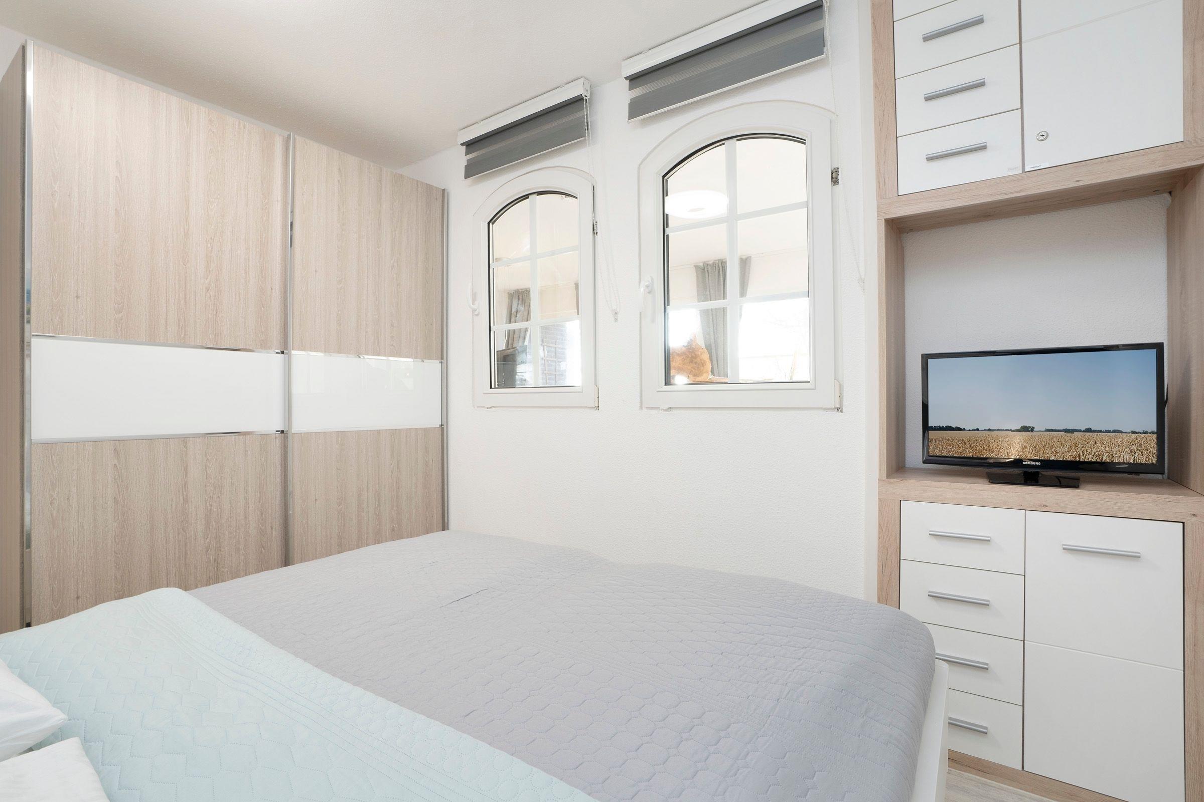 Schlafzimmer: 1 Doppelbett (2x 80x200 cm), TV, Kleiderschrank, kein Platz für ein Kinderreisebett vorhanden