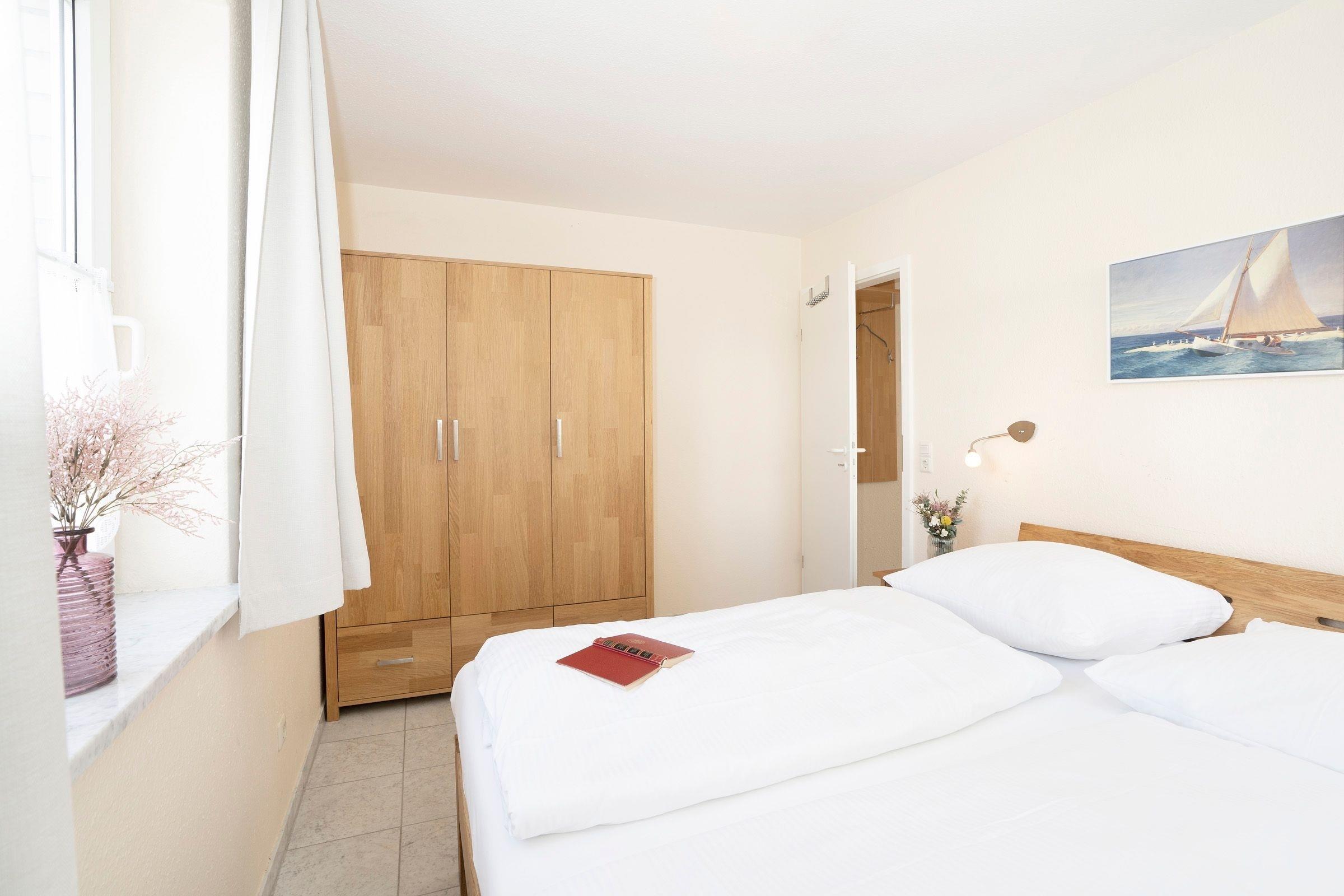 Schlafzimmer: Doppelbett (2x 80x200 cm), Platz für Kinderreisebett vorhanden, Kleiderschrank, Verdunklungsvorhänge