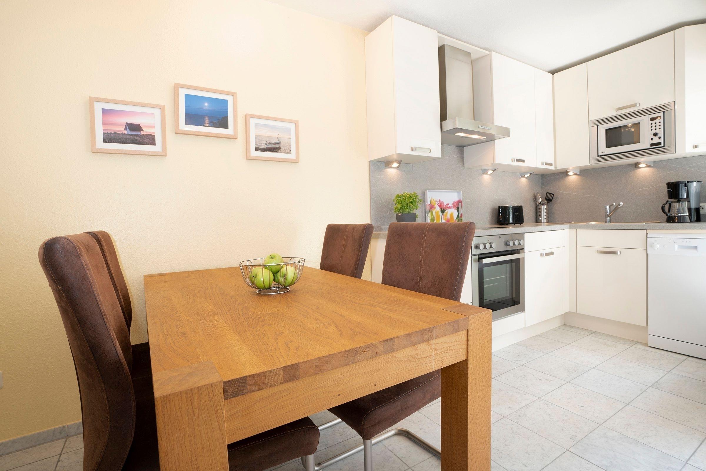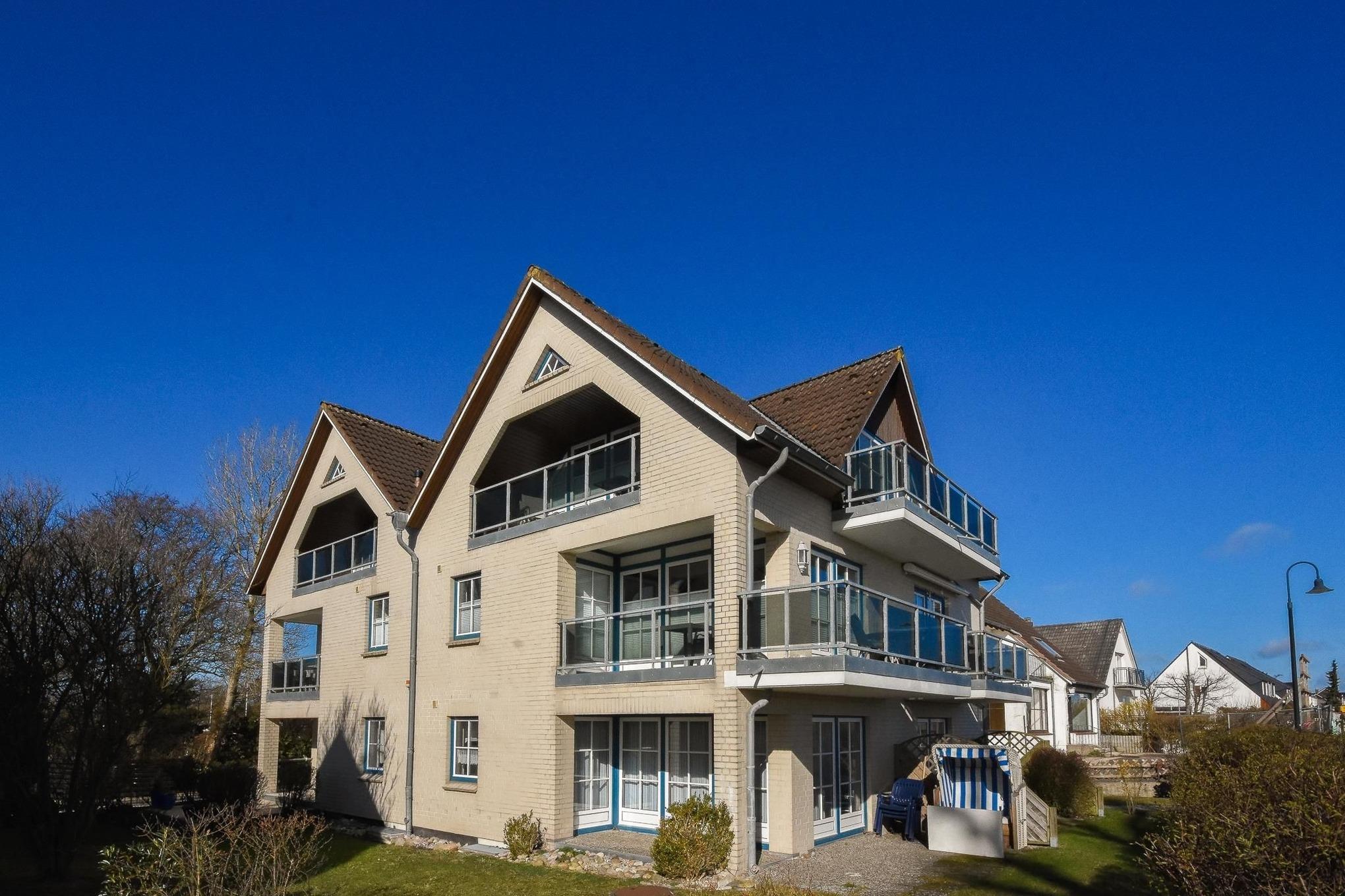 Es ist modern und sehr geschmackvoll eingerichtet. Das Appartement liegt in der 1. Etage und verfügt über einen Balkon mit seitlichem Meerblick sowie Gartenmöbeln. Im Wohnraum befindet sich eine Schlafcouch (140x200 cm) für 2 Personen. Außerdem befinden sich hier ein TV-Gerät, ein DVD-Player und eine Stereoanlage. Die neue komfortable Küchenzeile (Backofen, Mikrowelle, Cerankochfeld, Geschirrspüler, Kaffeemaschine, Wasserkocher, Toaster) ist mit dem Essplatz im Wohnraum integriert. Das Schlafzimmer ist mit einem Doppelbett (2x 80x200 cm) und einem Kleiderschrank möbliert. Duschbad/WC.