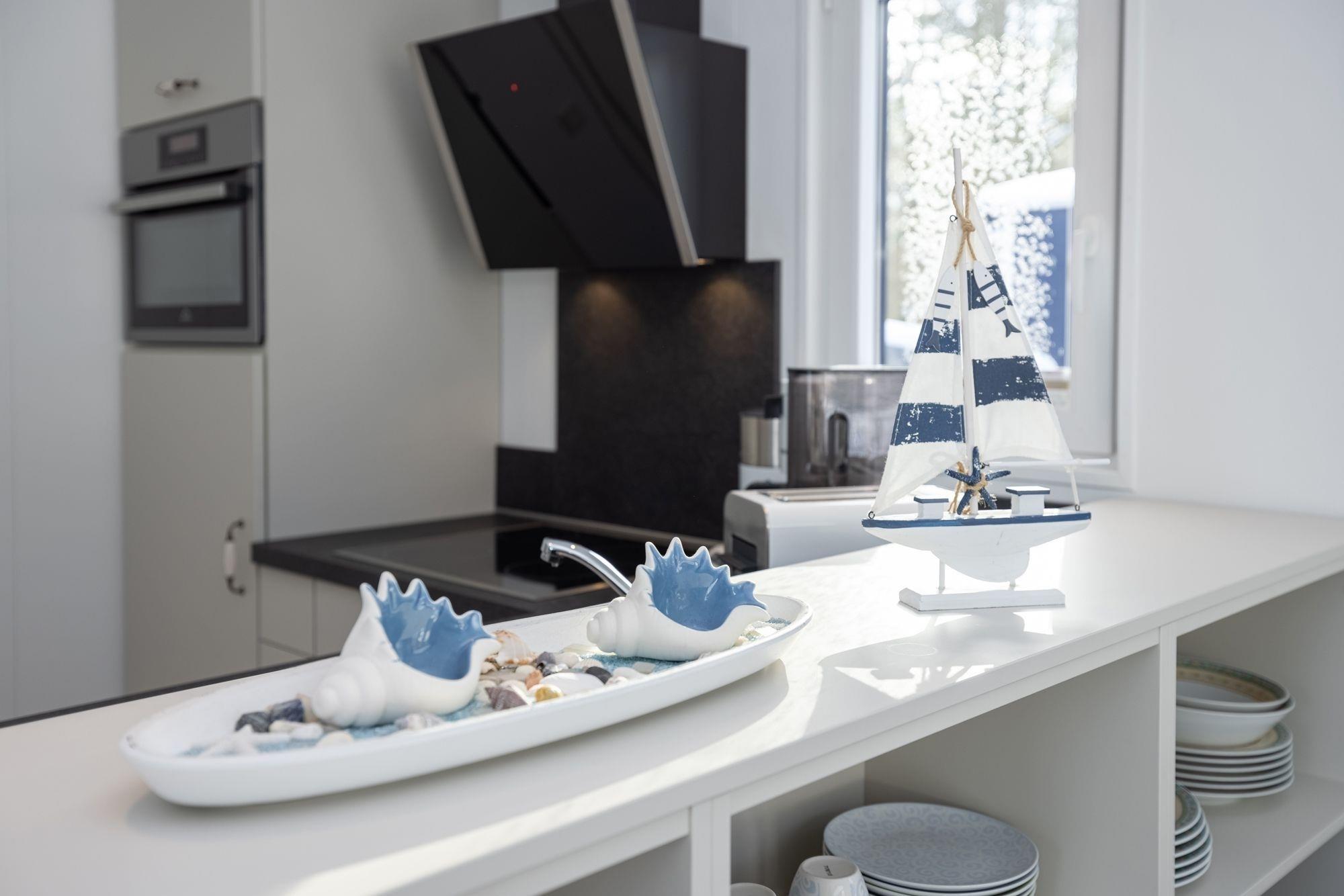 Das Ferienhaus ist liebevoll eingerichtet und verströmt mit hellen Farben und maritimen Details einen lässig-nordischen Charme. Der lichtdurchflutete, offene Wohnbereich ist hell und gemütlich und bietet mit einem komfortablen Sofa und einem Essplatz für vier Personen einen tollen Aufenthaltsraum für die ganze Familie. Flatscreen-TV mit Soundbar, Blu-Ray-Player, Internet- und DAB Plus Radio sowie ein kostenfreier WLAN-Anschluss bieten Unterhaltung auch an Regentagen. Die angrenzende Küche ist in den Wohnraum integriert und bietet Annehmlichkeiten wie Ceranherd, Mikrowelle (Kombigerät mit Backofenfunktion), Spülmaschine und Kaffeevollautomat. Das tageslichthelle Badezimmer ist stilvoll mit beleuchtetem Spiegelschrank, WC, Dusche mit niedrigem Einstieg und Handtuchheizung ausgestattet. In einem Schlafzimmer sorgt ein hochwertiges Boxspringbett (180x200 cm) für erholsamen Schlaf, im Kleiderschrank ist reichlich Stauraum für Ihre Feriengarderobe vorhanden. Das zweite Schlafzimmer ist mit zwei getrennt stehenden Einzelbetten (je 90x200 cm) und Kleiderschrank möbliert. Plissees sorgen in den Schlafräumen für angenehme Verdunklung.