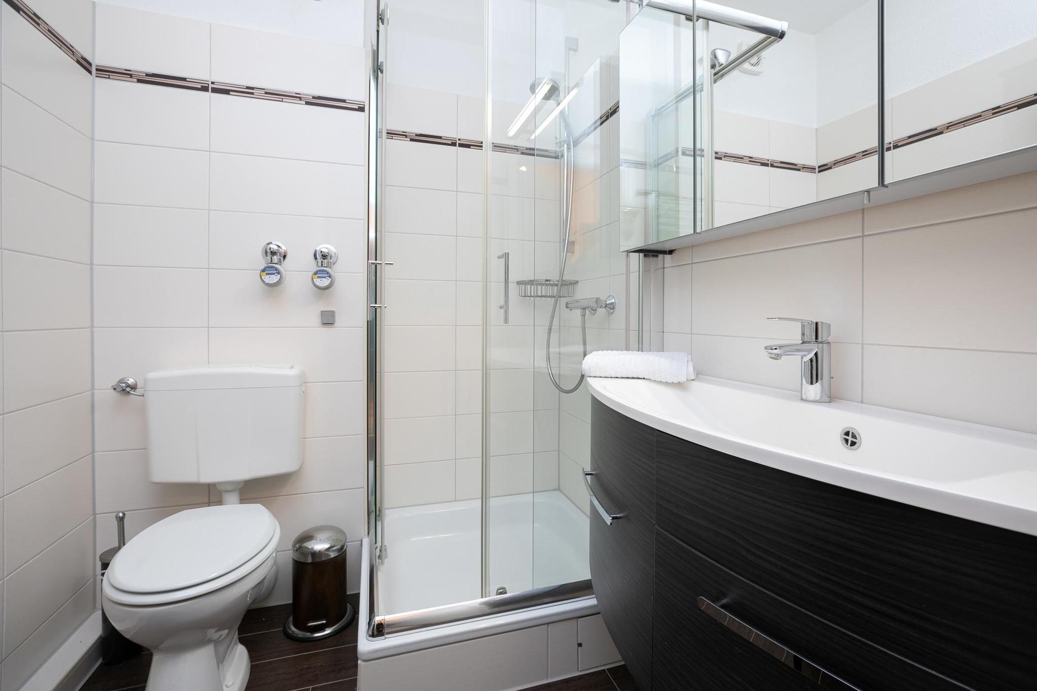 Das Wohnzimmer überzeugt mit hellen und freundlich Farben, ausgestattet mit TV, Internetradio und einem komfortablem Schlafsofa (160x200 cm) mit Federkernmatratze, ist hier Platz für 2 weitere Schlafplätze. Von hier gelangen Sie in die separate Küche, die mit Ceranherd, Backofen, Kühlschrank und Spülmaschine keine Wünsche offen lässt. Außerdem verschafft Ihnen das Wohnzimmer Zutritt zum überdachten und möblierten Balkon, wo Sie den sonnenreichen Tag bei einem Glas Wein ausklingen lassen können. Für schlafreiche und erholsame Nächte sorgt das Doppelbett (2x 80x190 cm) im Schlafzimmer, hier steht außerdem ein Kleiderschrank für alle neu geshoppten und mitgebrachten Urlaubsklamotten. Vervollständigt wird dieses Feriendomizil mit einem modernen Badezimmer mit Dusche, WC und Fön.