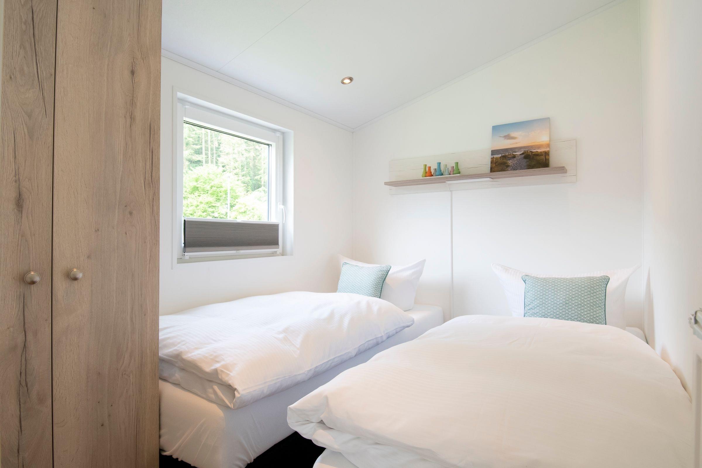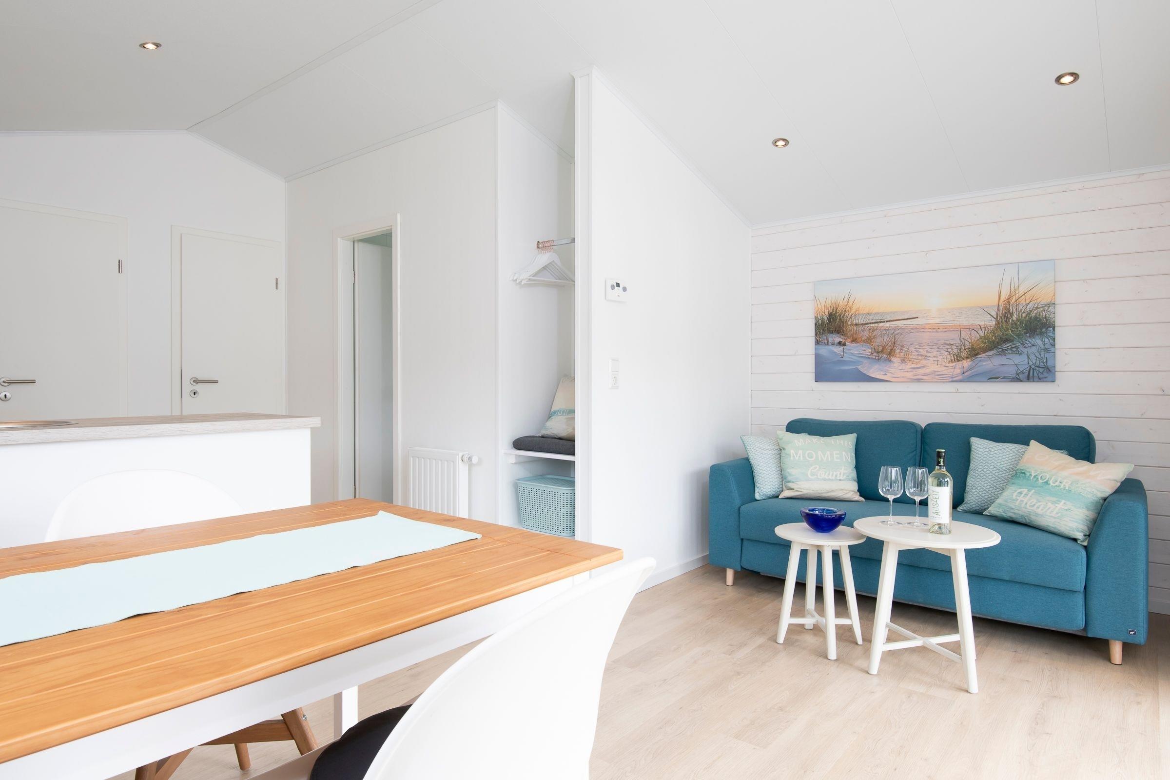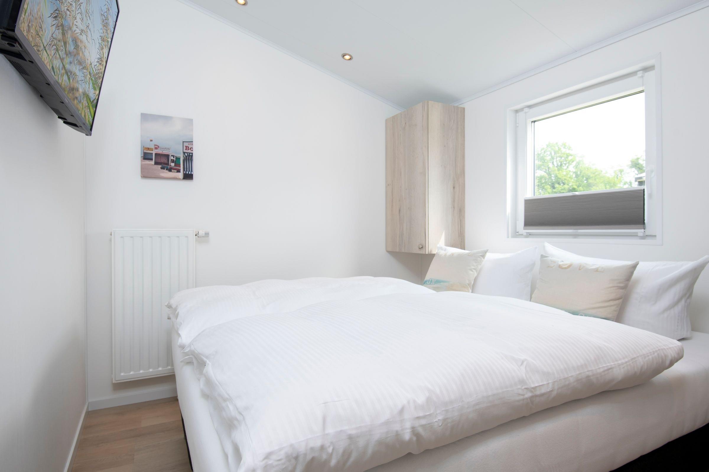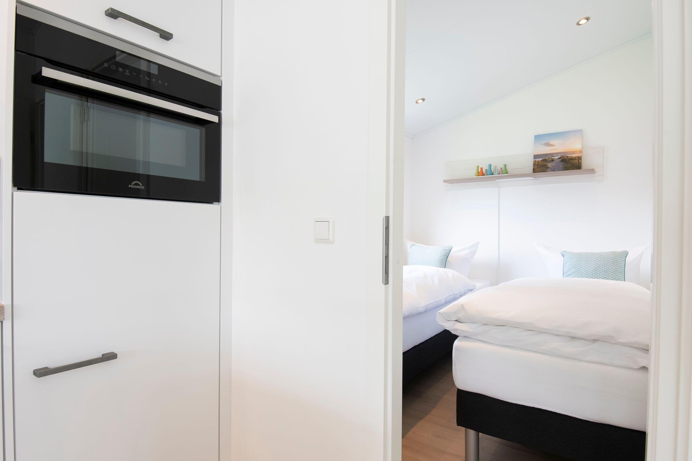 Die gesamte Raumaufteilung ist bis ins kleinste Detail durchdacht. Der kombinierte Wohn- und Essbereich verfügt über ein bequemes Sofa und über einen Esstisch, der ausreichend Platz für bis zu 4 Personen bietet. Die zum Wohnbereich offene Küche mit hellen Fronten lädt zu gemeinsamen Kochabenden mit der Familie oder Freunden ein. In der Küche sind alle Notwendigkeiten wie z. B. ein Kühlschrank, eine Mikrowelle (Kombigerät mit Backofenfunktion) und auch ein Geschirrspüler vorhanden. Eine Kaffee-Kapselmaschine (Nespresso) sorgt für den täglichen Kaffeegenuss morgens beim Frühstück oder nachmittags zum Kuchen. Ein Schlafzimmer empfängt Sie mit einem komfortablen Doppelbett (2x 80x200 cm), einem Kleiderschrank und einem Fernseher. Im anderen Schlafzimmer befinden sich zwei getrennt stehende Einzelbetten (je 80x200 cm) und ein Kleiderschrank. Die Fenster in beiden Schlafzimmern lassen sich mit Plissees angenehm verdunkeln. Im kleinen, hell gefliesten Badezimmer mit Fenster sind eine Dusche und Ablagemöglichkeiten für Ihre Badutensilien vorhanden. Ein beheizbarer Handtuchhalter sorgt für zusätzlichen Komfort. Ein Highlight dieser Ferienunterkunft ist die möblierte, überdachte Terrasse mit Grill, auf der Sie Ihren Urlaub in vollen Zügen genießen können. Der WLAN-Anschluss ist für Sie selbstverständlich inklusive.