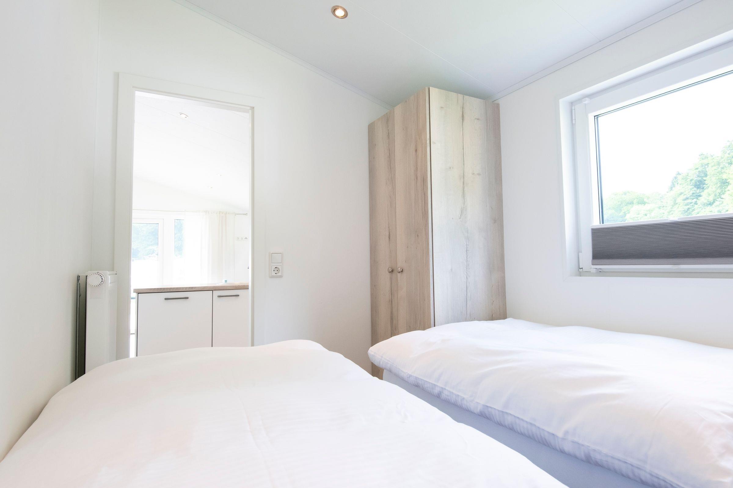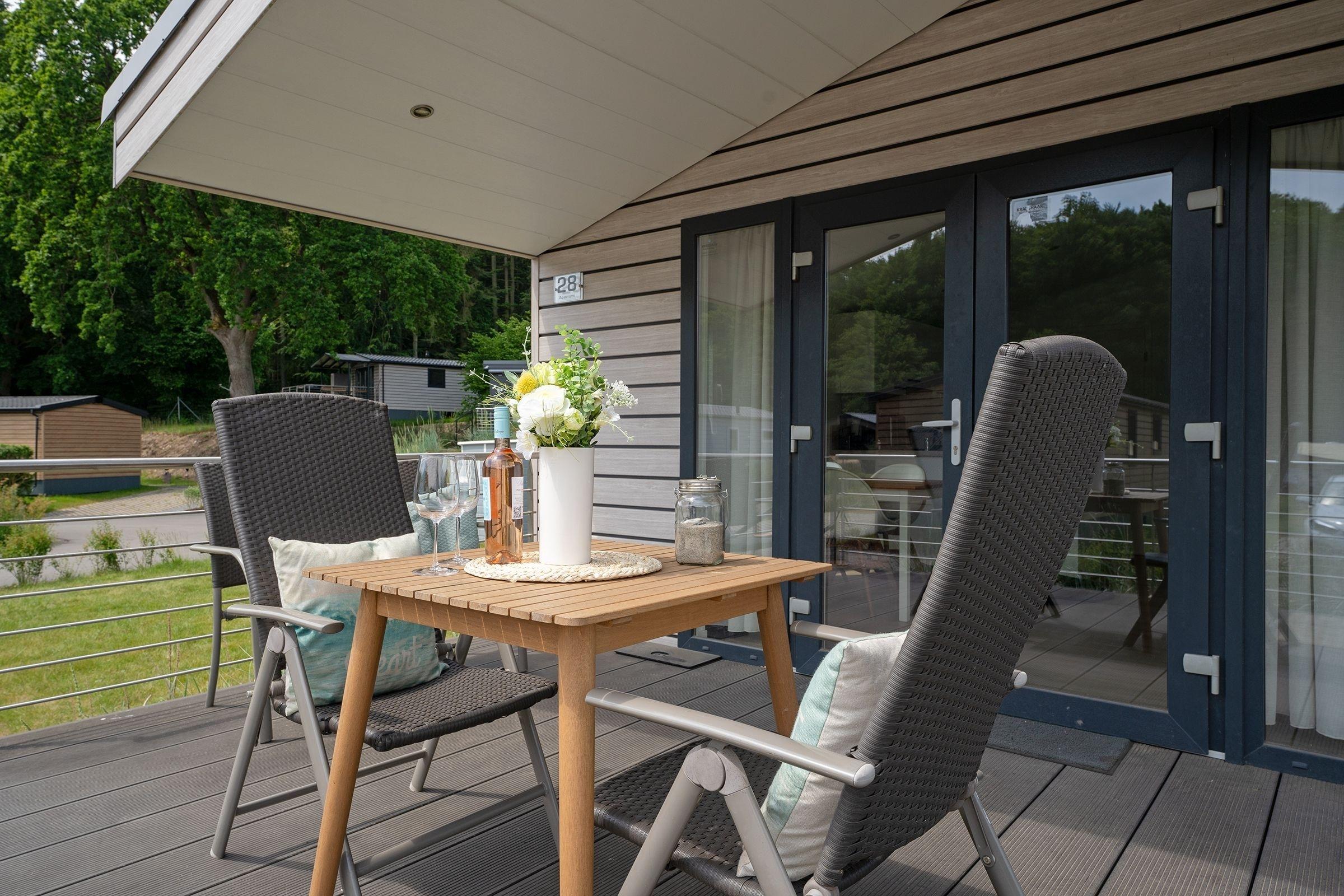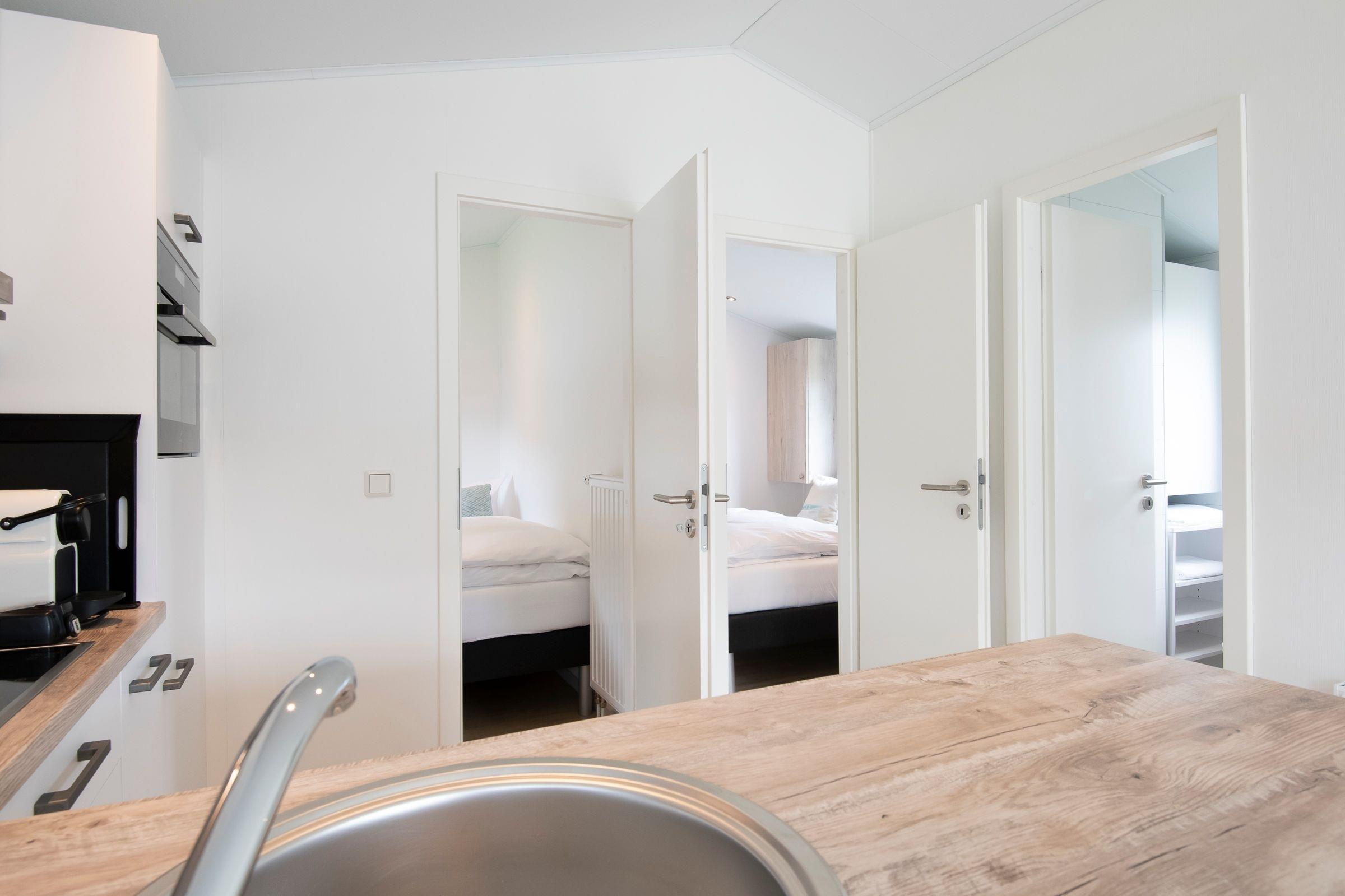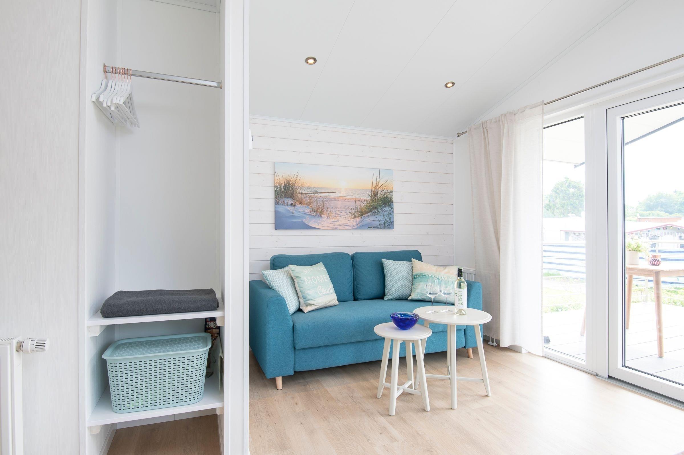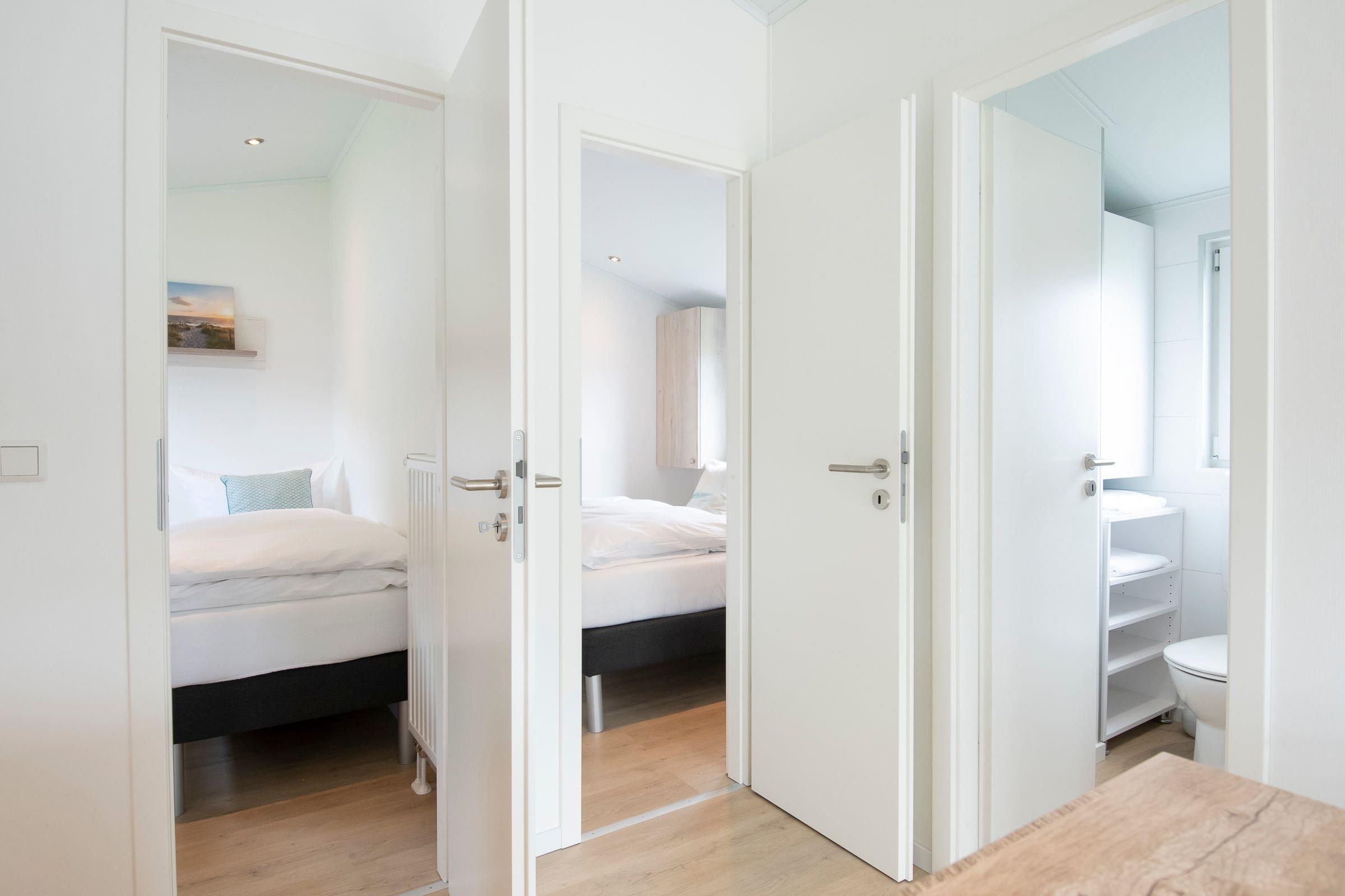 Die gesamte Raumaufteilung ist bis ins kleinste Detail durchdacht. Der kombinierte Wohn- und Essbereich verfügt über ein bequemes Sofa und über einen Esstisch, der ausreichend Platz für bis zu 4 Personen bietet. Die zum Wohnbereich offene Küche mit hellen Fronten lädt zu gemeinsamen Kochabenden mit der Familie oder Freunden ein. In der Küche sind alle Notwendigkeiten wie z. B. ein Kühlschrank, eine Mikrowelle (Kombigerät mit Backofenfunktion) und auch ein Geschirrspüler vorhanden. Eine Kaffee-Kapselmaschine (Nespresso) sorgt für den täglichen Kaffeegenuss morgens beim Frühstück oder nachmittags zum Kuchen. Ein Schlafzimmer empfängt Sie mit einem komfortablen Doppelbett (2x 80x200 cm), einem Kleiderschrank und einem Fernseher. Im anderen Schlafzimmer befinden sich zwei getrennt stehende Einzelbetten (je 80x200 cm) und ein Kleiderschrank. Die Fenster in beiden Schlafzimmern lassen sich mit Plissees angenehm verdunkeln. Im kleinen, hell gefliesten Badezimmer mit Fenster sind eine Dusche und Ablagemöglichkeiten für Ihre Badutensilien vorhanden. Ein beheizbarer Handtuchhalter sorgt für zusätzlichen Komfort. Ein Highlight dieser Ferienunterkunft ist die möblierte, überdachte Terrasse mit Grill, auf der Sie Ihren Urlaub in vollen Zügen genießen können. Der WLAN-Anschluss ist für Sie selbstverständlich inklusive.