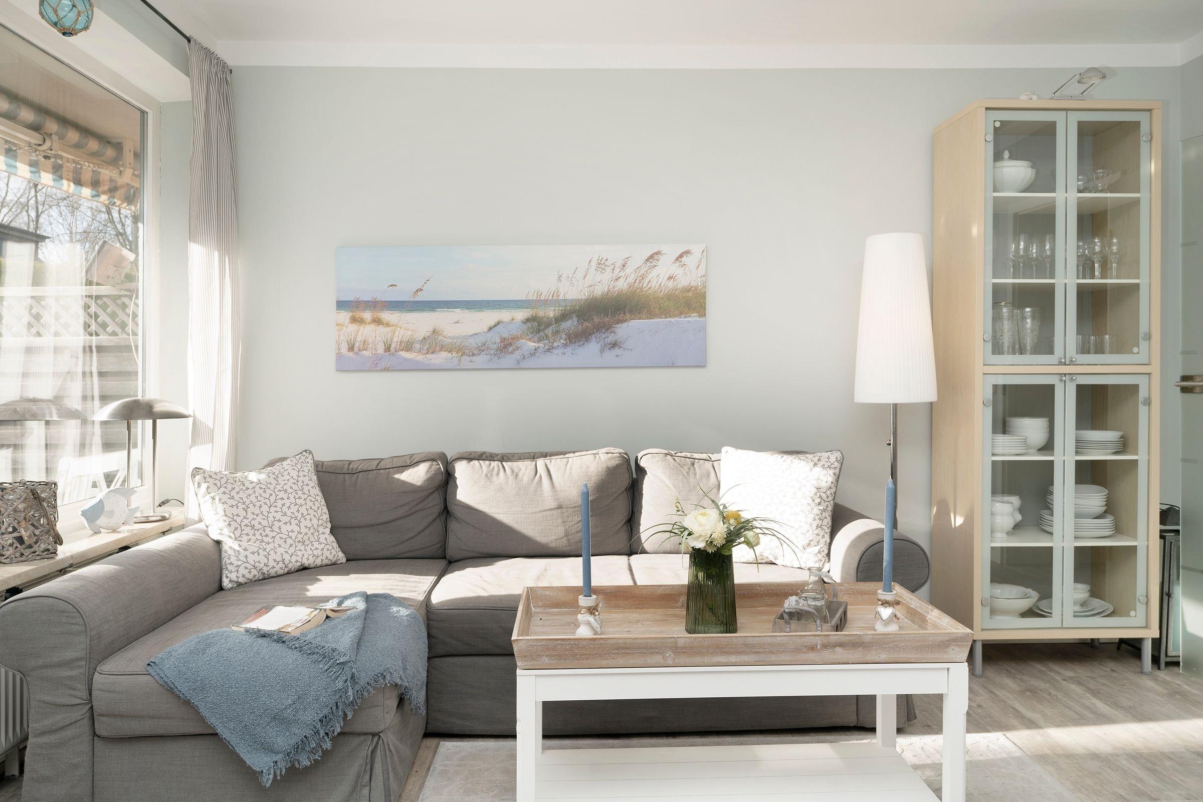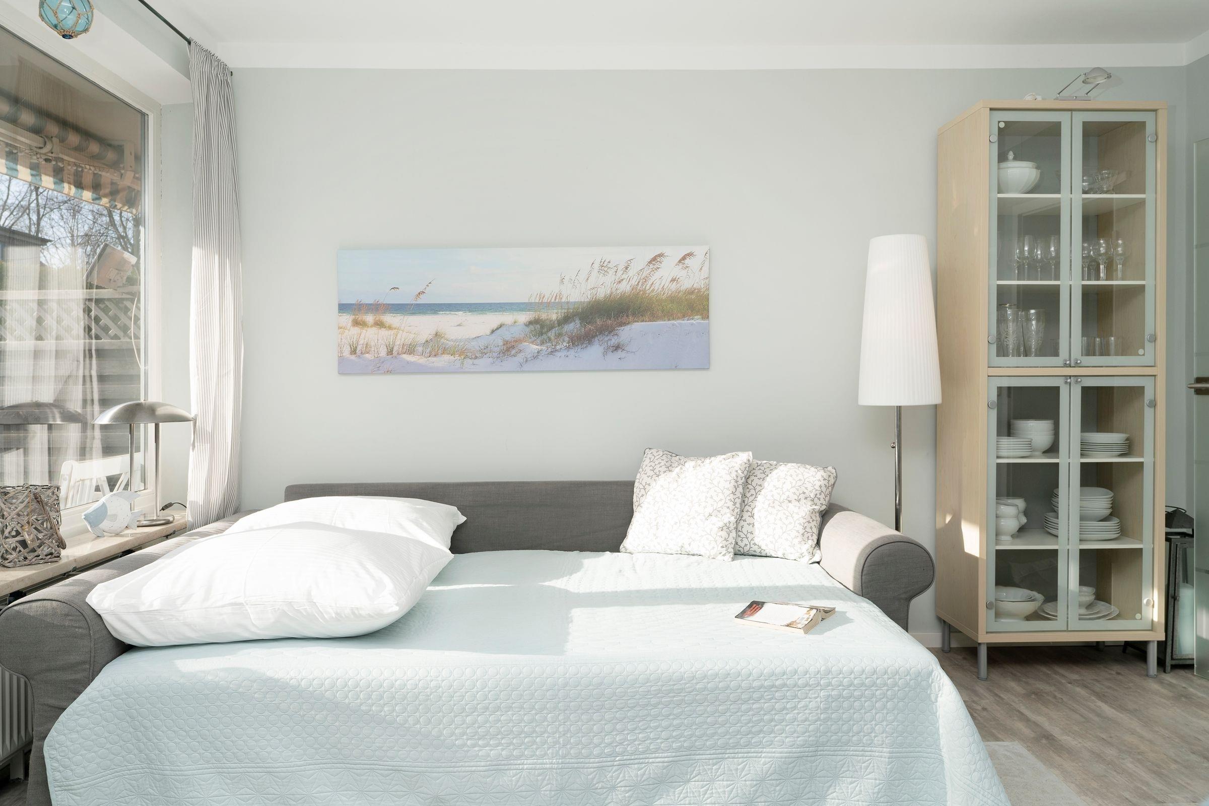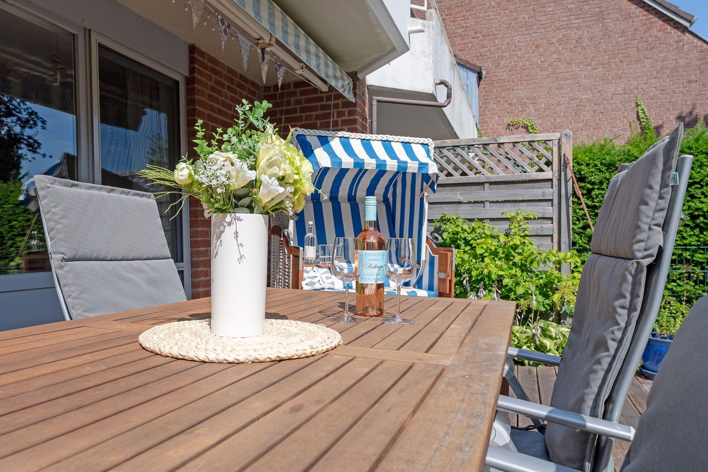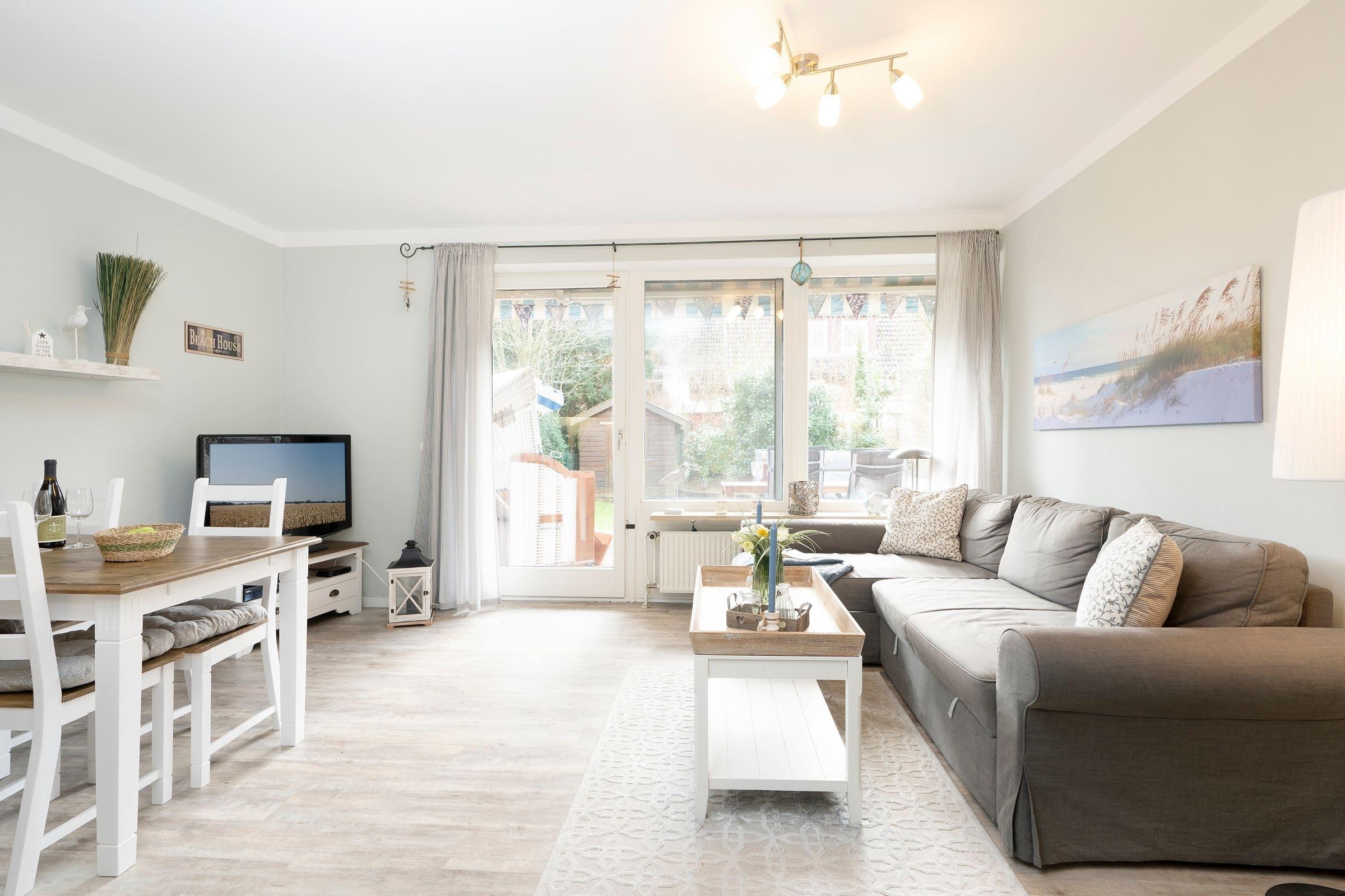Hell und modern empfängt Sie Ihr Urlaubsdomizil mit dem geräumigen Wohnbereich. Die große Couch kann bei Bedarf in einen weiteren Schlafplatz (160x200 cm) verwandelt werden. Highlight dieser Unterkunft ist die ca. 20 m² große Südterrasse mit Strandkorb und kleinem Gartenstück zur Eigennutzung. Die in den Wohnbereich integrierte Küche ist mit allem ausgestattet, was Sie zum Zubereiten Ihrer Mahlzeiten benötigen. Diese können Sie anschließend am angrenzenden Esstisch gemeinsam einnehmen.