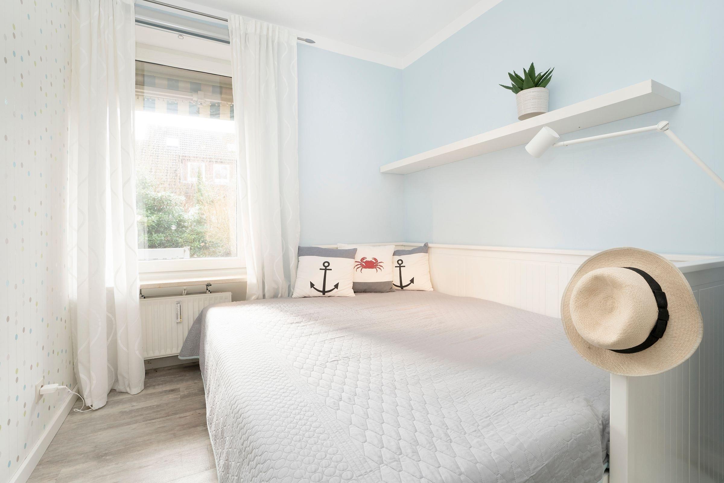 Schlafzimmer 1: 1 Boxspringbett (180x200 cm), Kleiderschrank, Verdunkelung: blickdichte Vorhänge, Rolladen, kein Platz für ein Babybett