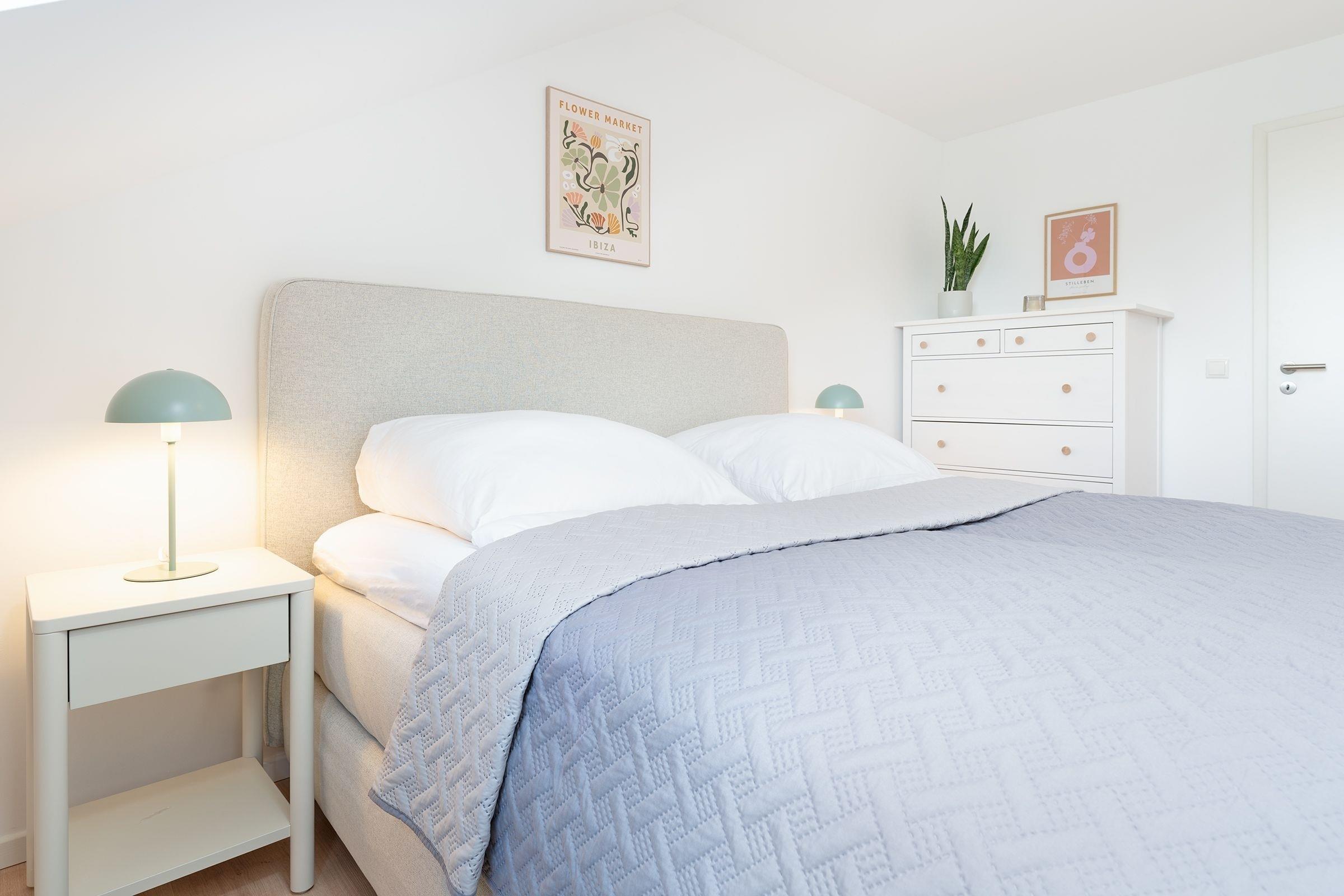 Schlafzimmer 2: 1 Boxspringbett (180 x 200 cm), Kommode, Verdunkelung: Vorhang, Platz für Babybett vorhanden