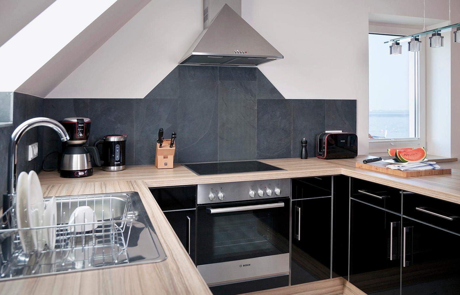 Die klug eingeplante Küche ist nicht nur optisch ein Leckerbissen. Man kann bei der Vorbereitung seinen Blick entspannt über die Ostsee bis nach Neustadt und Mecklenburg schweifen lassen – oder die Illumination des ca. 40 m² großen Multifunktionsraums durch die letzte Abendsonne genießen. Zwischen Ess- und Wohnbereich steht als Raumteiler ein maßgefertigter Kleiderschrank zur Aufnahme Ihrer Reiseutensilien bereit.