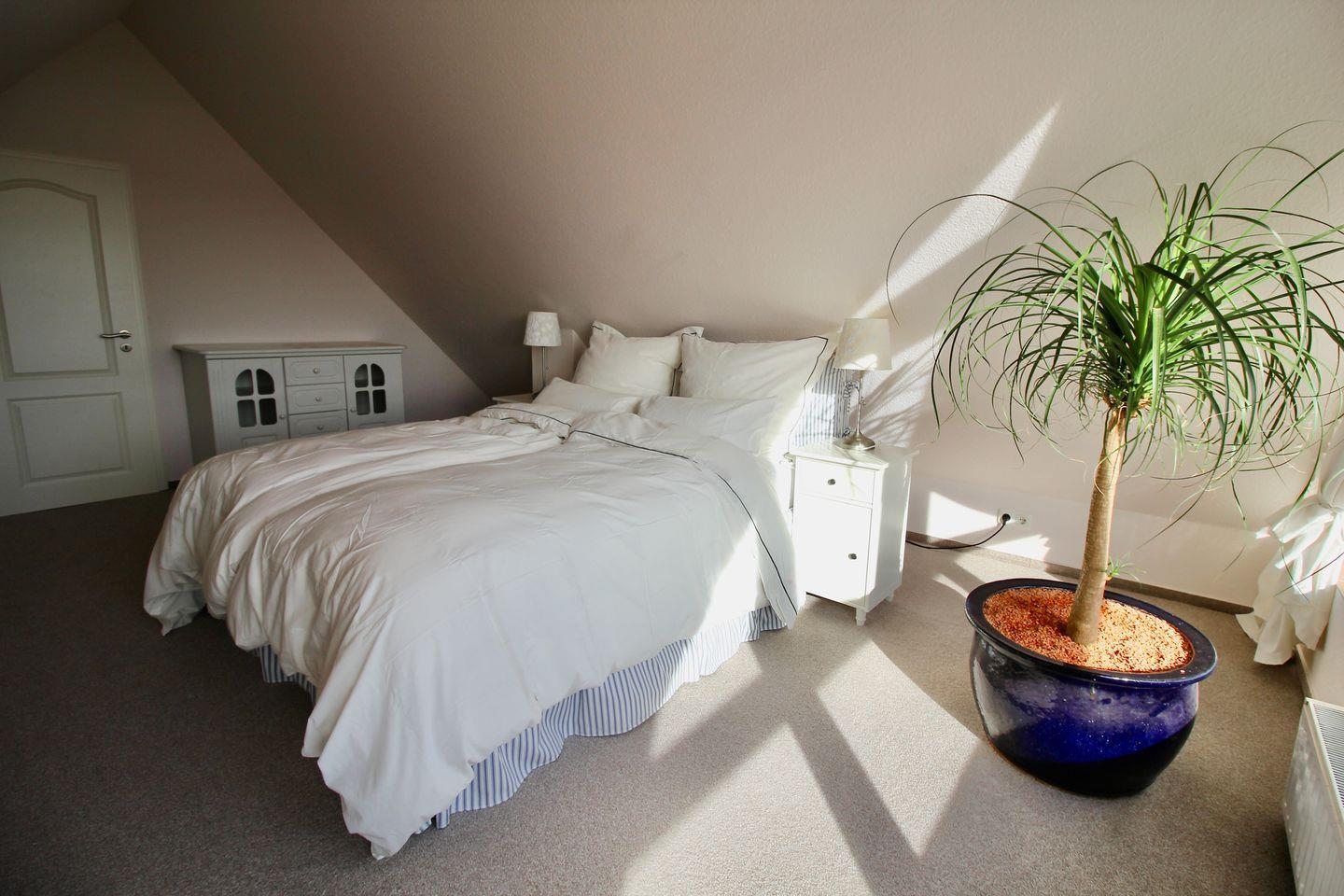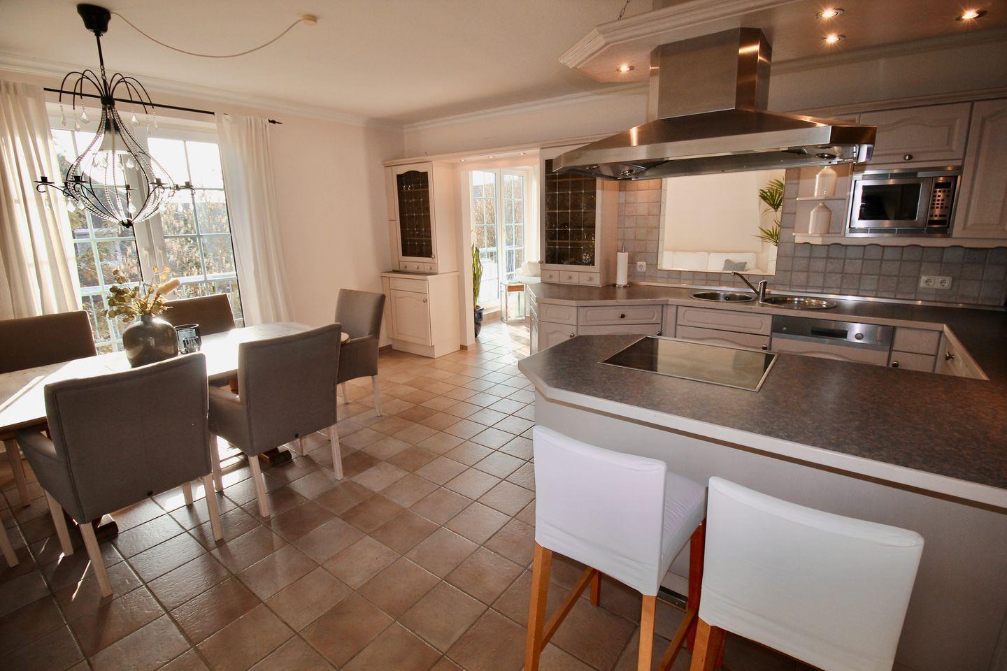 Die großzügige Wohnfläche von über 120 Quadratmetern erstreckt sich über fünf Zimmer, darunter ein Wohn-/Esszimmer und vier Schlafzimmer, wobei sich das vierte Schlafzimmer in der Galerie befindet. Das lichtdurchflutete und geräumige Wohn-/Esszimmer mit einer offenen, im amerikanischen Stil gestalteten Küche liegt im 1. Obergeschoss des Zweifamilienhauses. An einem großen Esstisch können Sie leckere gemeinsame Mahlzeiten und lange Spielabende genießen. Im komfortablen Sofabereich können Sie entspannte Fernseh- oder DVD-Abende verbringen. Vom Wohnzimmer aus gelangen Sie auf den großzügigen Balkon mit einem großen Esstisch und zwei Sitzbänken. Zwei Sonnenstühle laden zum Sonnenbaden ein. Der Eingangsbereich mit Garderobenschrank und großem Spiegel, zwei Schlafzimmer mit Doppelbetten (160 x 200 cm) und Kleiderschränken sowie ein Vollbad mit Badewanne befinden sich ebenfalls im 1. Obergeschoss. Über eine Holztreppe gelangen Sie ins Obergeschoss. In der offenen Galerie befindet sich ein großes Doppelbett (160 x 200 cm) sowie ein separates Schlafzimmer mit einem ebenso großen Doppelbett.