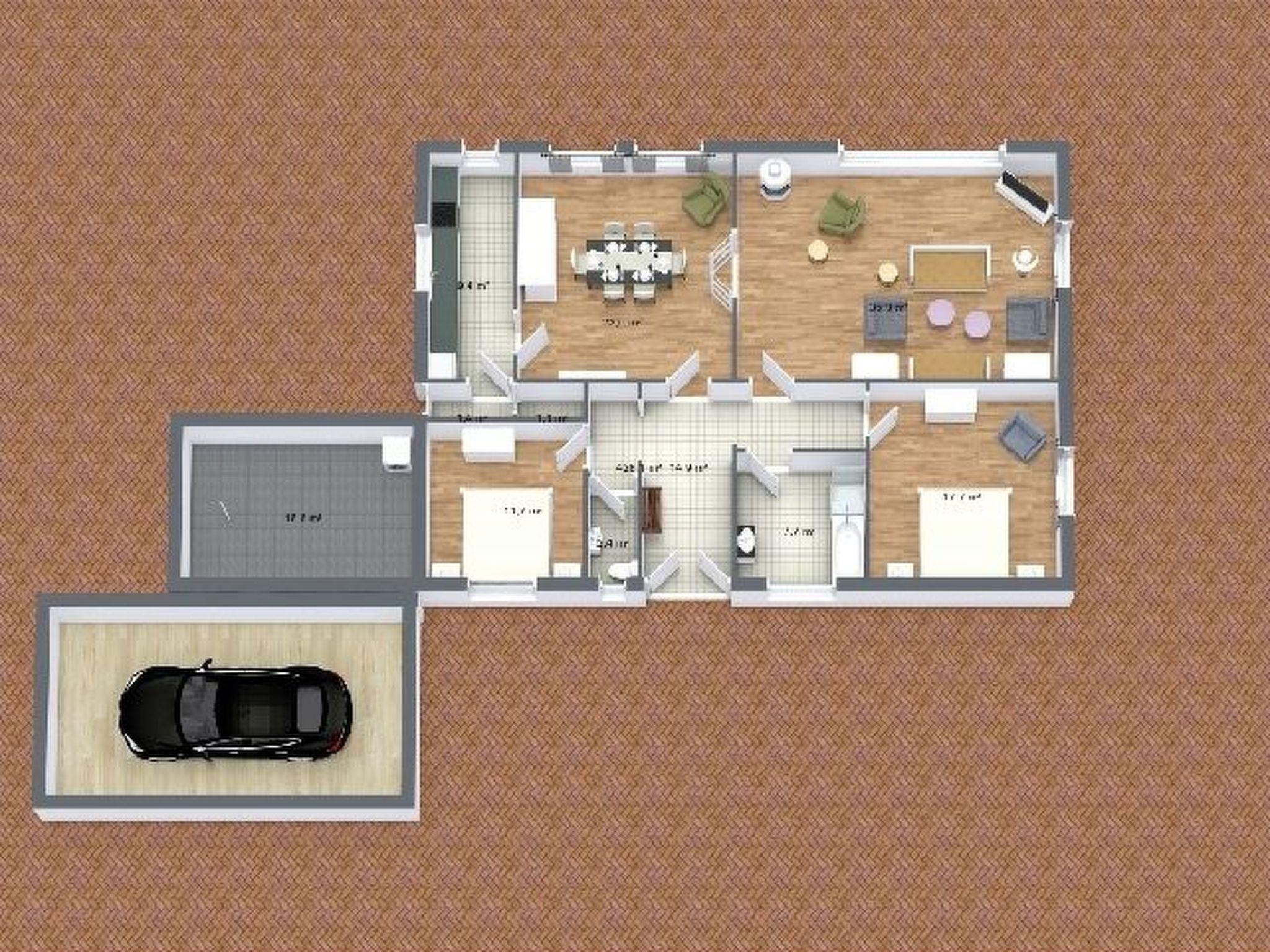 The house is completely at ground level, is approx. 100 square metres in size and has a large, bright and light-flooded living room with a wood-burning stove, a bright dining room and 2 bright bedrooms with a double bed 180 x 200. The bathroom is equipped with shower and bathtub, washbasin and separate WC. A bright country kitchen invites you to cook and a utility room provides enough space for supplies.