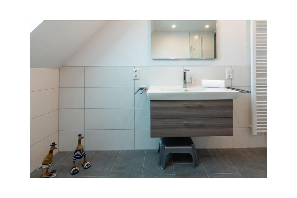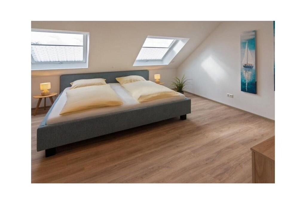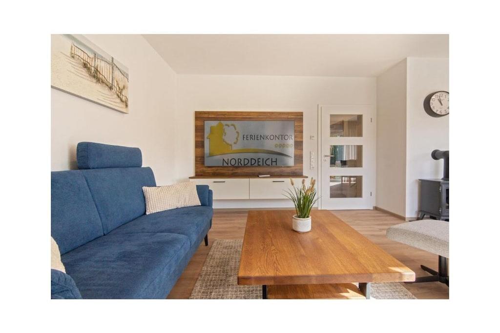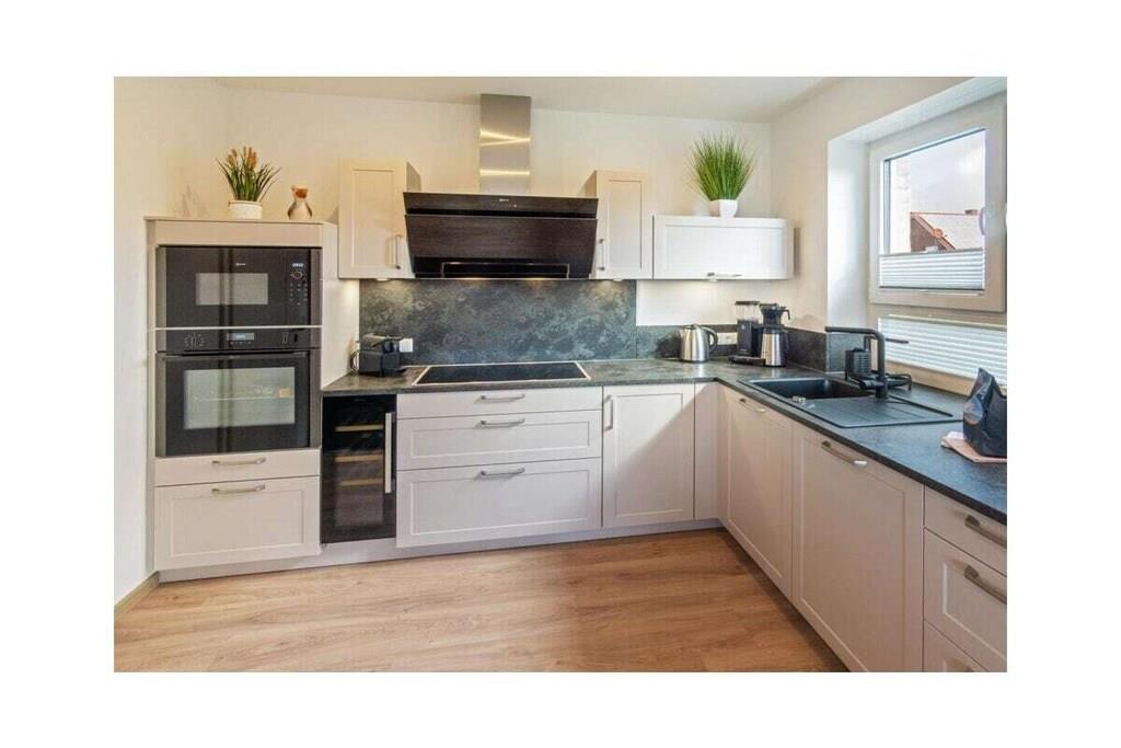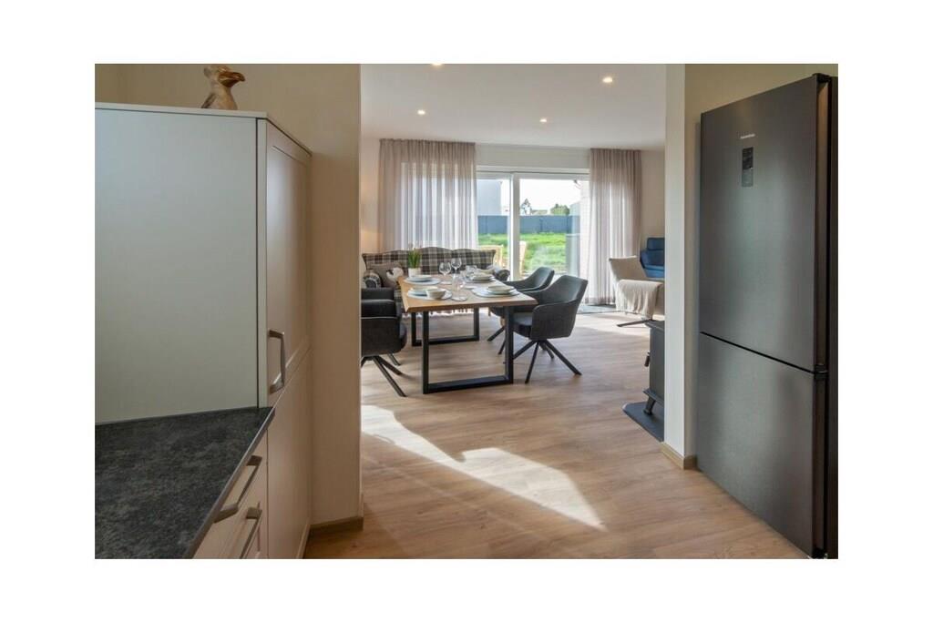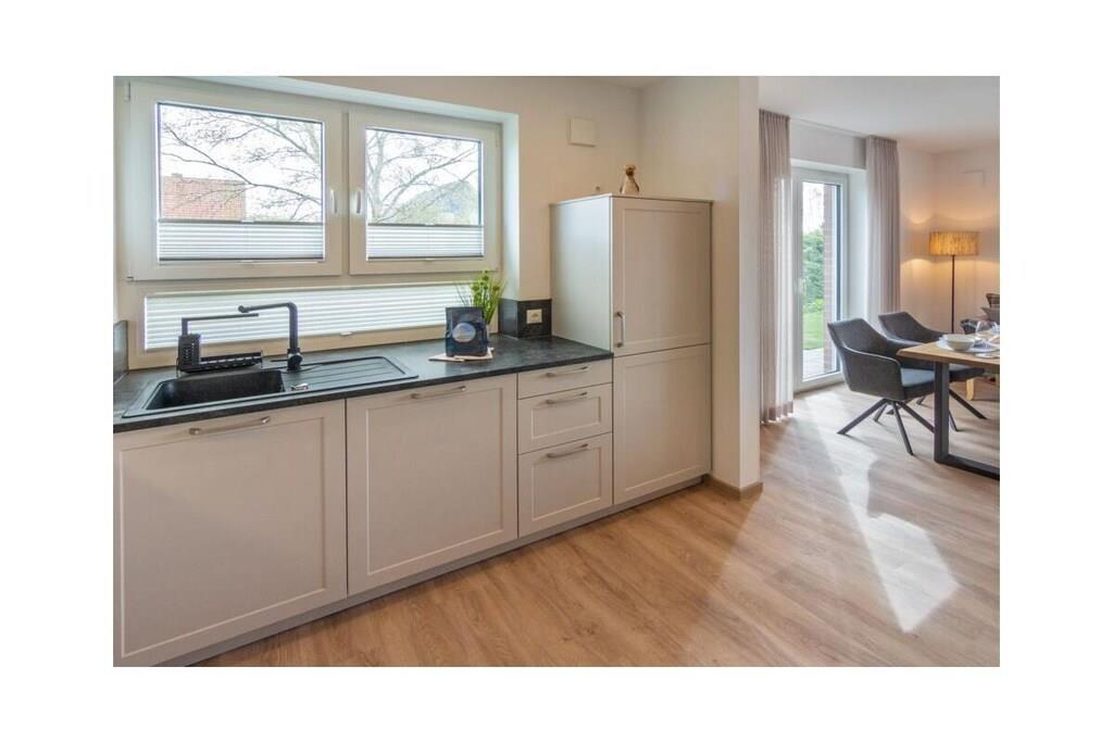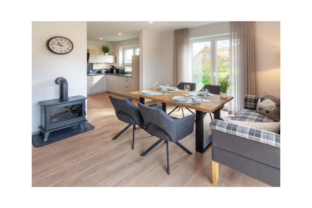 Holiday home Lüttje Steern As a traditional health resort on the North Sea coast, Hage is known for its healthy sea air and mild, stimulating climate. Surrounded by green meadows, Hage offers an ideal environment for those seeking relaxation and nature lovers. The quiet atmosphere and the variety of leisure activities make it a popular destination for a relaxing holiday in the midst of North German nature. Immerse yourself in the relaxed atmosphere of Hage and enjoy the beauty of the North German coast when you move into our exclusive holiday apartment "Lüttje Steern". "Lüttje Steern" is a real gem among the holiday apartments in Hage. Our charming holiday apartment is located in a newly built semi-detached house in the middle of a quiet residential area. It extends over two floors, is designed to accommodate four adults and offers the ideal retreat for a relaxing holiday on the North Sea coast. Enjoy that very special something as soon as you enter this holiday apartment. The open design of the living area is inviting and spacious, and welcomes you with light. The harmonious combination of kitchen, dining area and living room creates a warm atmosphere in which you immediately feel at home. The comfortable sofa set with matching armchair and the large TV monitor invite you to spend sociable evenings with friends. A modern electric fireplace, equipped with the latest effect fire technology and crackling effect, completes the cozy ambience. The adjoining dining area is also located in this living area. The large table with its four chairs and a cozy Friesian sofa offers enough space for four people. Be it for breakfast together, a sociable game night or for a home-cooked dinner in the evening. The modern kitchen is fully at your disposal for this. It is a real highlight and offers everything your heart desires.