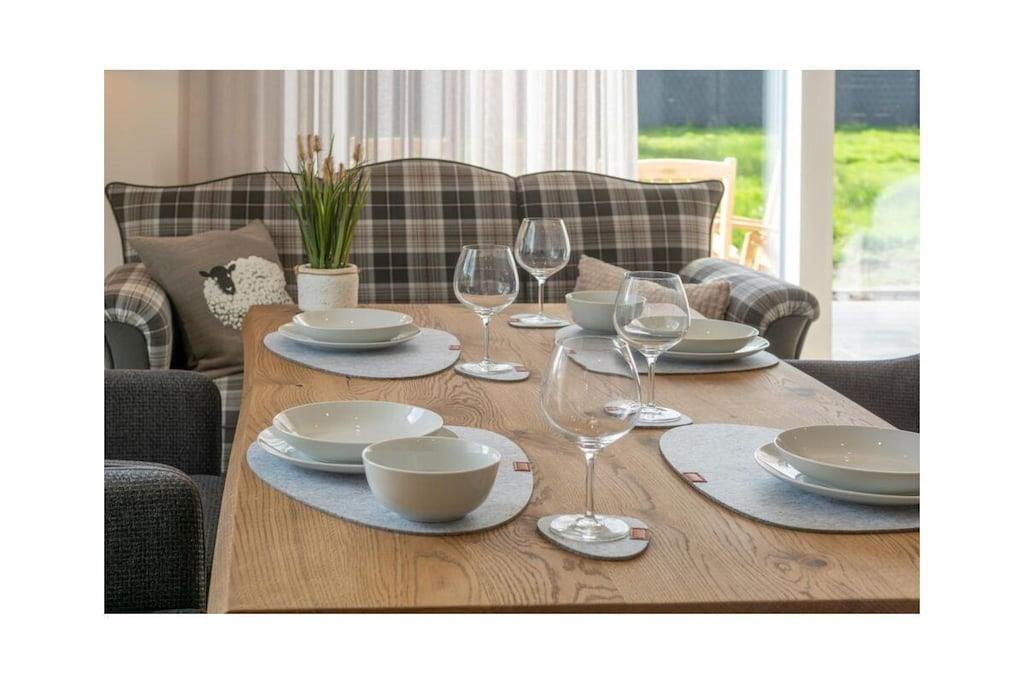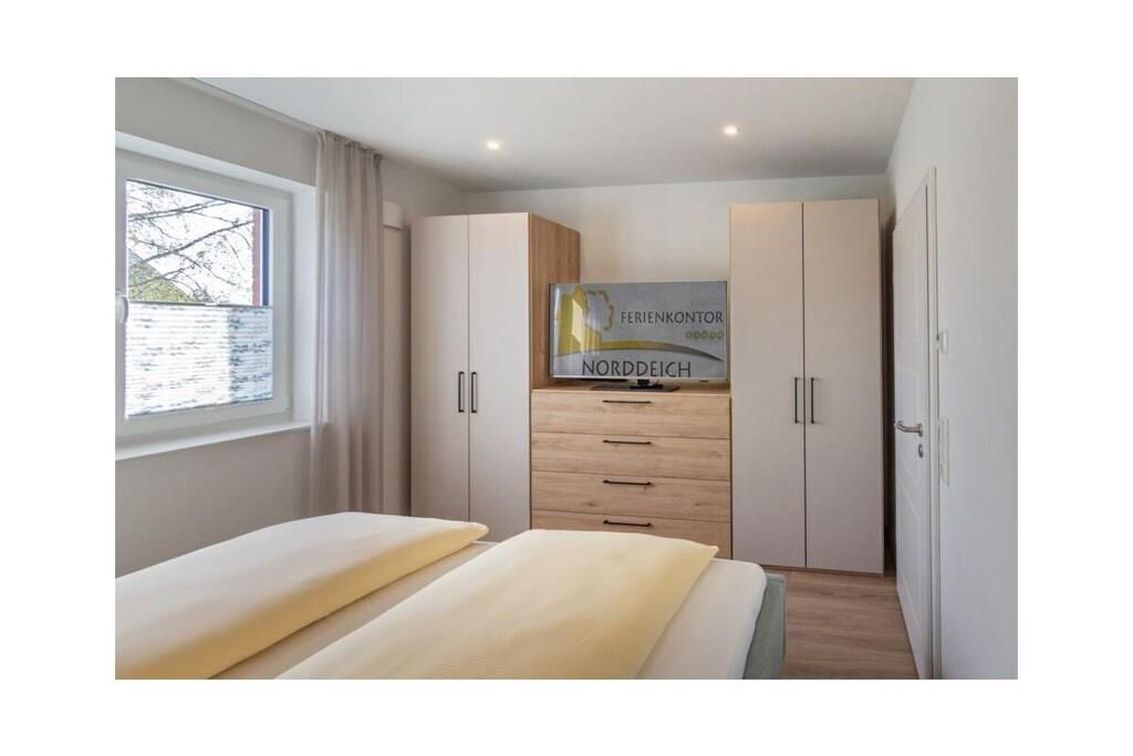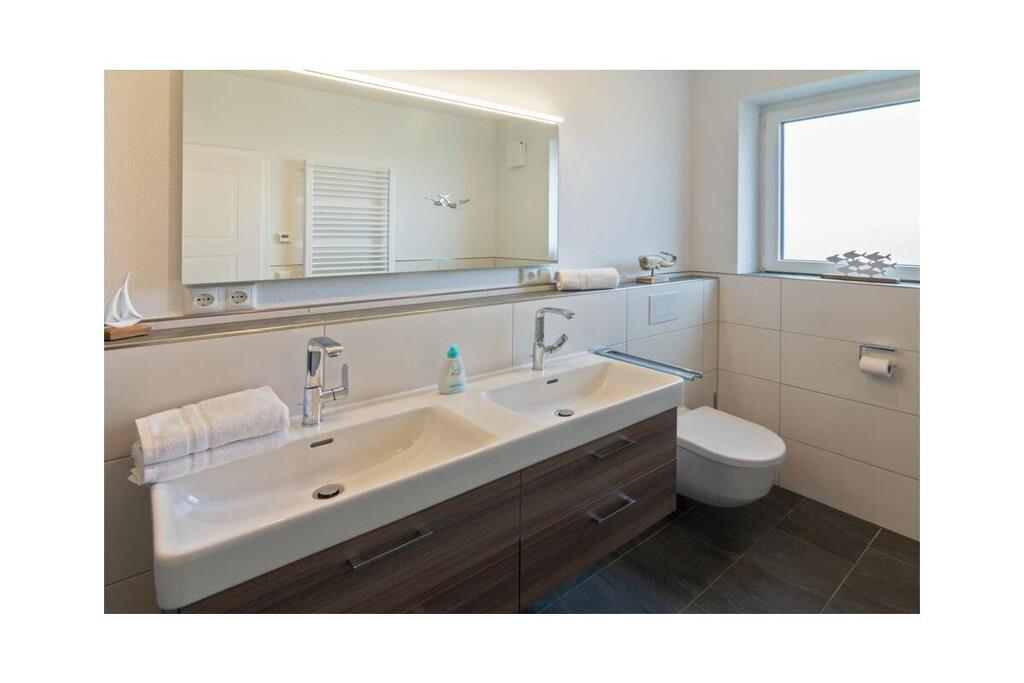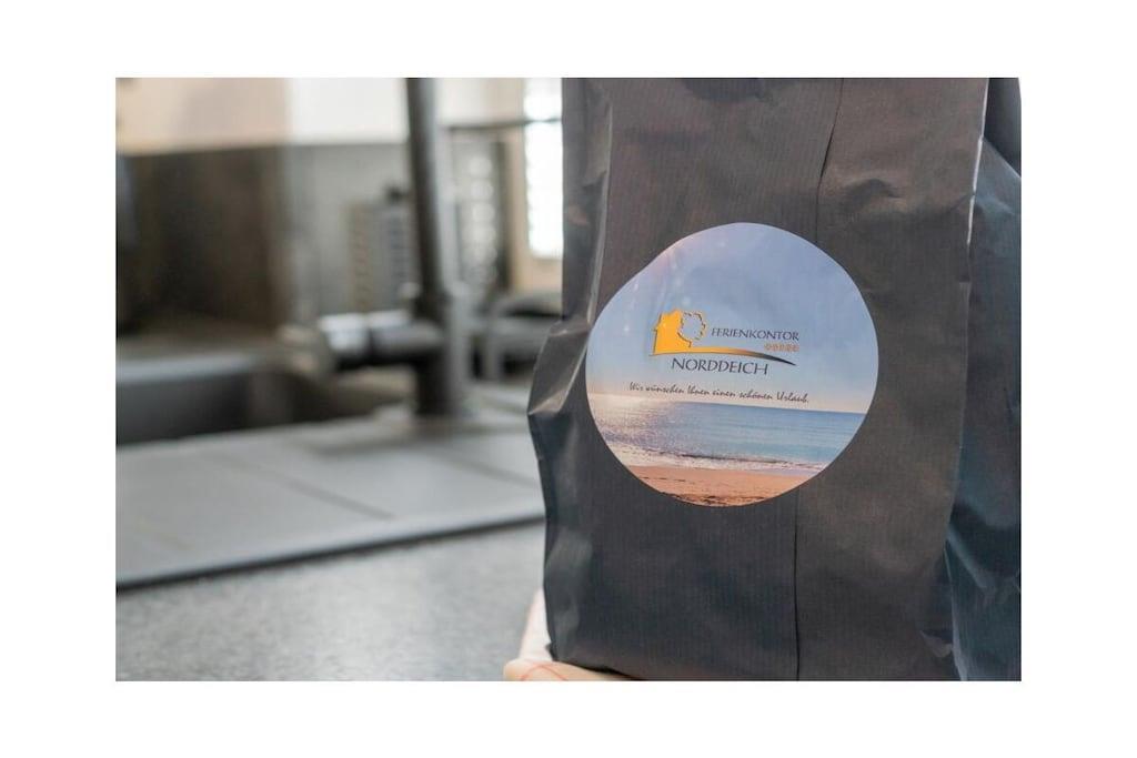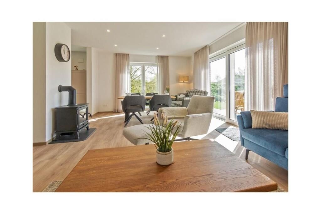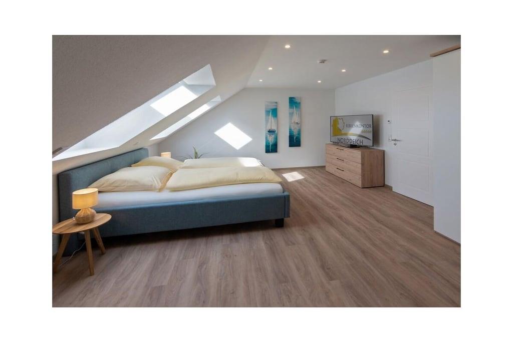 Holiday home Lüttje Steern As a traditional health resort on the North Sea coast, Hage is known for its healthy sea air and mild, stimulating climate. Surrounded by green meadows, Hage offers an ideal environment for those seeking relaxation and nature lovers. The quiet atmosphere and the variety of leisure activities make it a popular destination for a relaxing holiday in the midst of North German nature. Immerse yourself in the relaxed atmosphere of Hage and enjoy the beauty of the North German coast when you move into our exclusive holiday apartment "Lüttje Steern". "Lüttje Steern" is a real gem among the holiday apartments in Hage. Our charming holiday apartment is located in a newly built semi-detached house in the middle of a quiet residential area. It extends over two floors, is designed to accommodate four adults and offers the ideal retreat for a relaxing holiday on the North Sea coast. Enjoy that very special something as soon as you enter this holiday apartment. The open design of the living area is inviting and spacious, and welcomes you with light. The harmonious combination of kitchen, dining area and living room creates a warm atmosphere in which you immediately feel at home. The comfortable sofa set with matching armchair and the large TV monitor invite you to spend sociable evenings with friends. A modern electric fireplace, equipped with the latest effect fire technology and crackling effect, completes the cozy ambience. The adjoining dining area is also located in this living area. The large table with its four chairs and a cozy Friesian sofa offers enough space for four people. Be it for breakfast together, a sociable game night or for a home-cooked dinner in the evening. The modern kitchen is fully at your disposal for this. It is a real highlight and offers everything your heart desires.