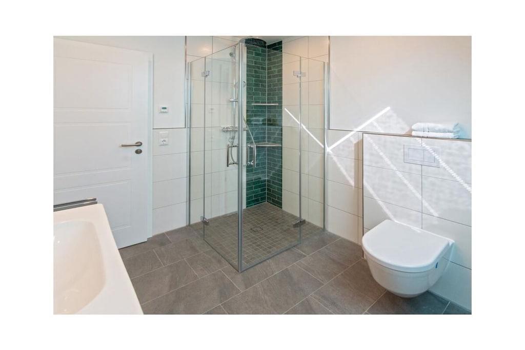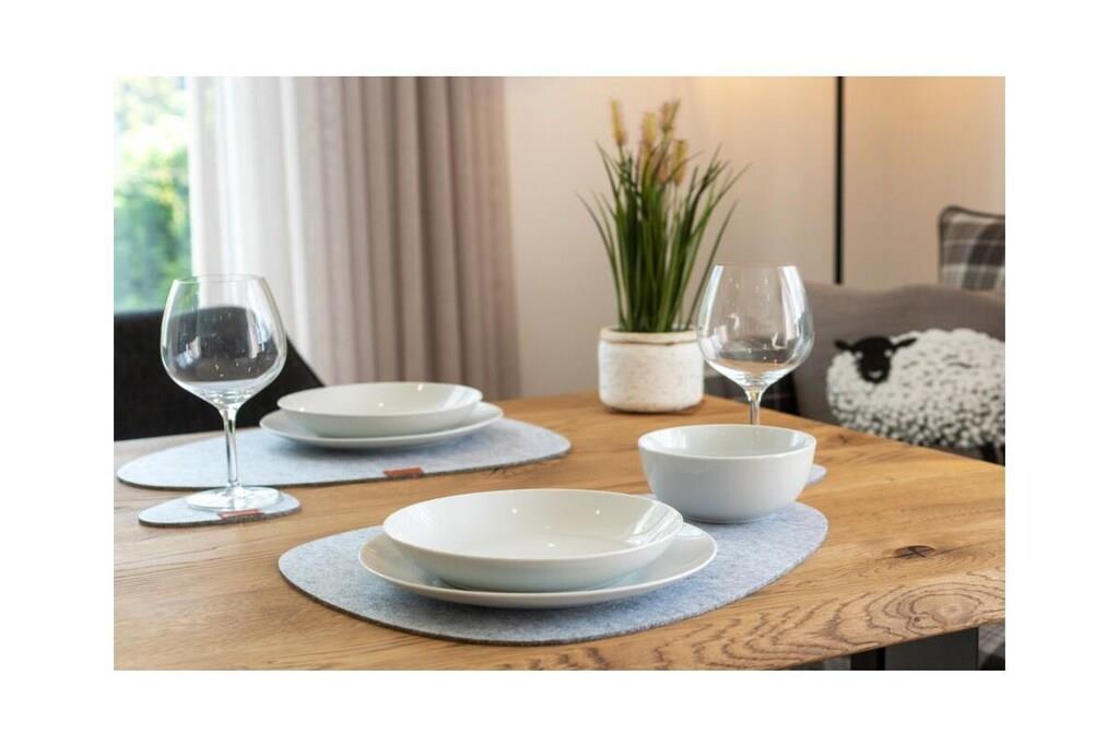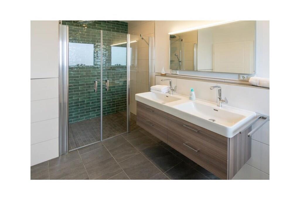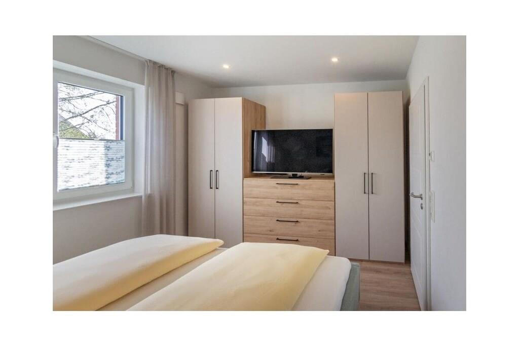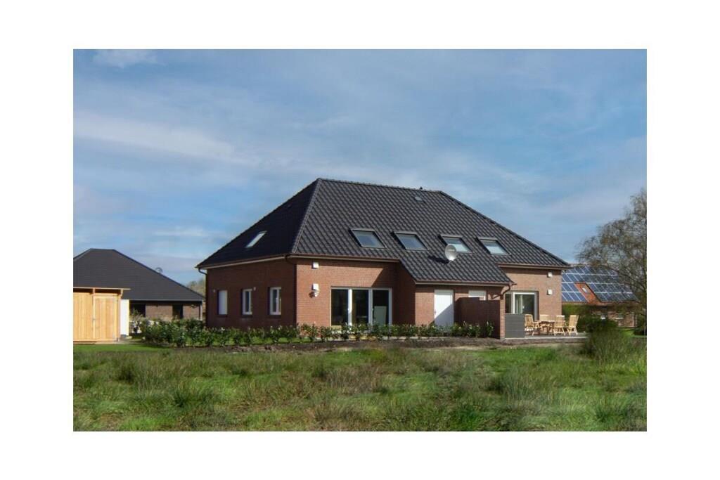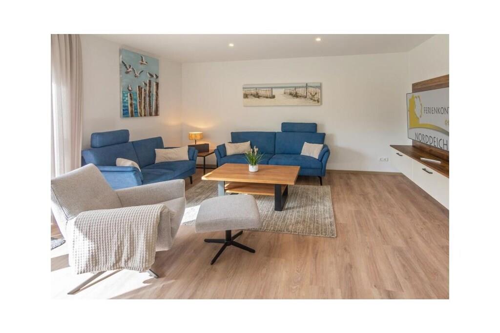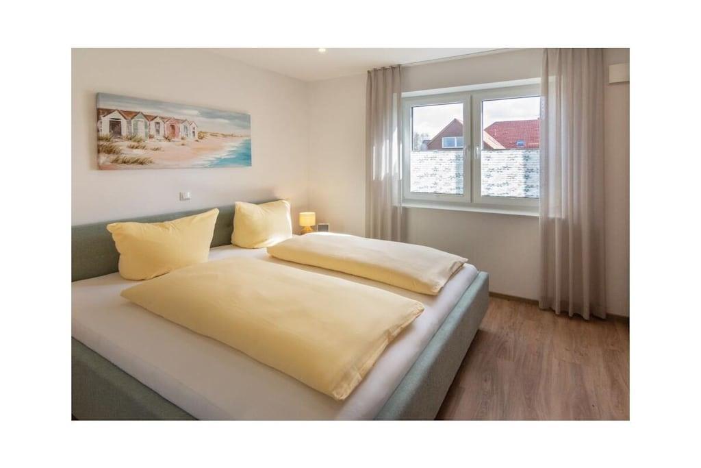 Holiday home Lüttje Steern As a traditional health resort on the North Sea coast, Hage is known for its healthy sea air and mild, stimulating climate. Surrounded by green meadows, Hage offers an ideal environment for those seeking relaxation and nature lovers. The quiet atmosphere and the variety of leisure activities make it a popular destination for a relaxing holiday in the midst of North German nature. Immerse yourself in the relaxed atmosphere of Hage and enjoy the beauty of the North German coast when you move into our exclusive holiday apartment "Lüttje Steern". "Lüttje Steern" is a real gem among the holiday apartments in Hage. Our charming holiday apartment is located in a newly built semi-detached house in the middle of a quiet residential area. It extends over two floors, is designed to accommodate four adults and offers the ideal retreat for a relaxing holiday on the North Sea coast. Enjoy that very special something as soon as you enter this holiday apartment. The open design of the living area is inviting and spacious, and welcomes you with light. The harmonious combination of kitchen, dining area and living room creates a warm atmosphere in which you immediately feel at home. The comfortable sofa set with matching armchair and the large TV monitor invite you to spend sociable evenings with friends. A modern electric fireplace, equipped with the latest effect fire technology and crackling effect, completes the cozy ambience. The adjoining dining area is also located in this living area. The large table with its four chairs and a cozy Friesian sofa offers enough space for four people. Be it for breakfast together, a sociable game night or for a home-cooked dinner in the evening. The modern kitchen is fully at your disposal for this. It is a real highlight and offers everything your heart desires.