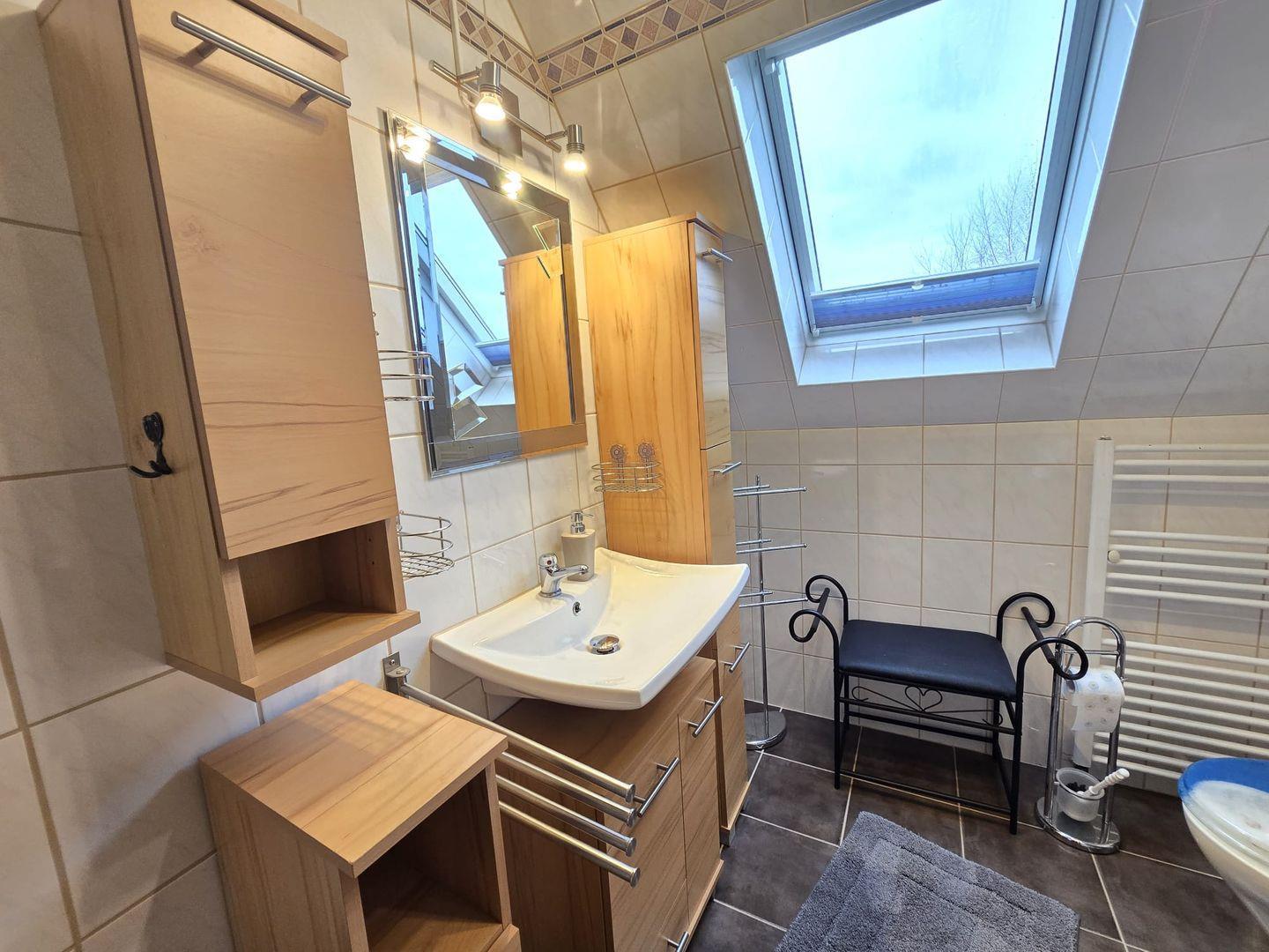 Das Badezimmer ist modern gestaltet und verfügt über eine Dusche, Waschbecken und WC. Es bietet Ihnen alle Annehmlichkeiten für einen angenehmen Start in den Tag.