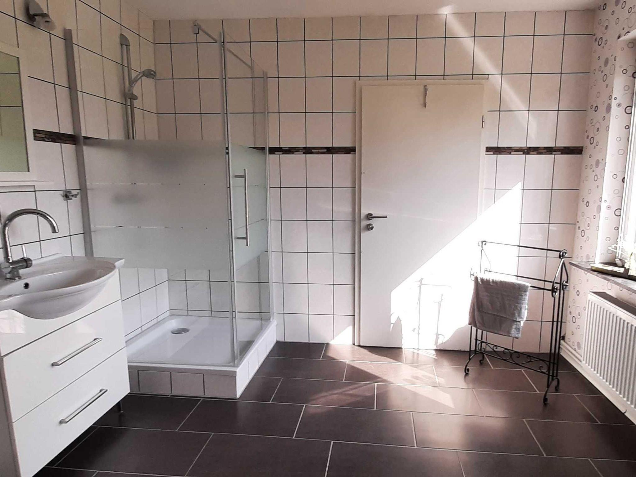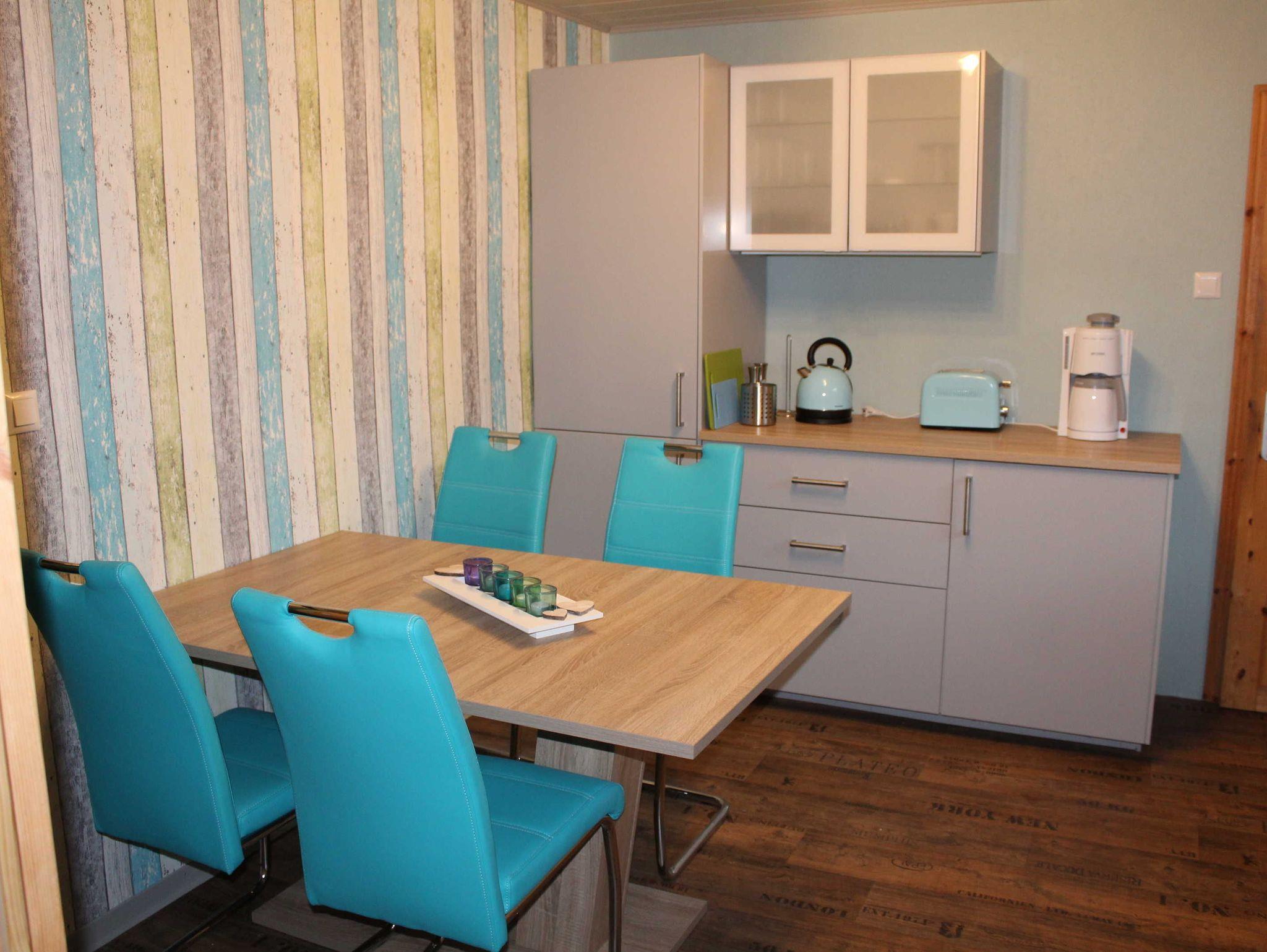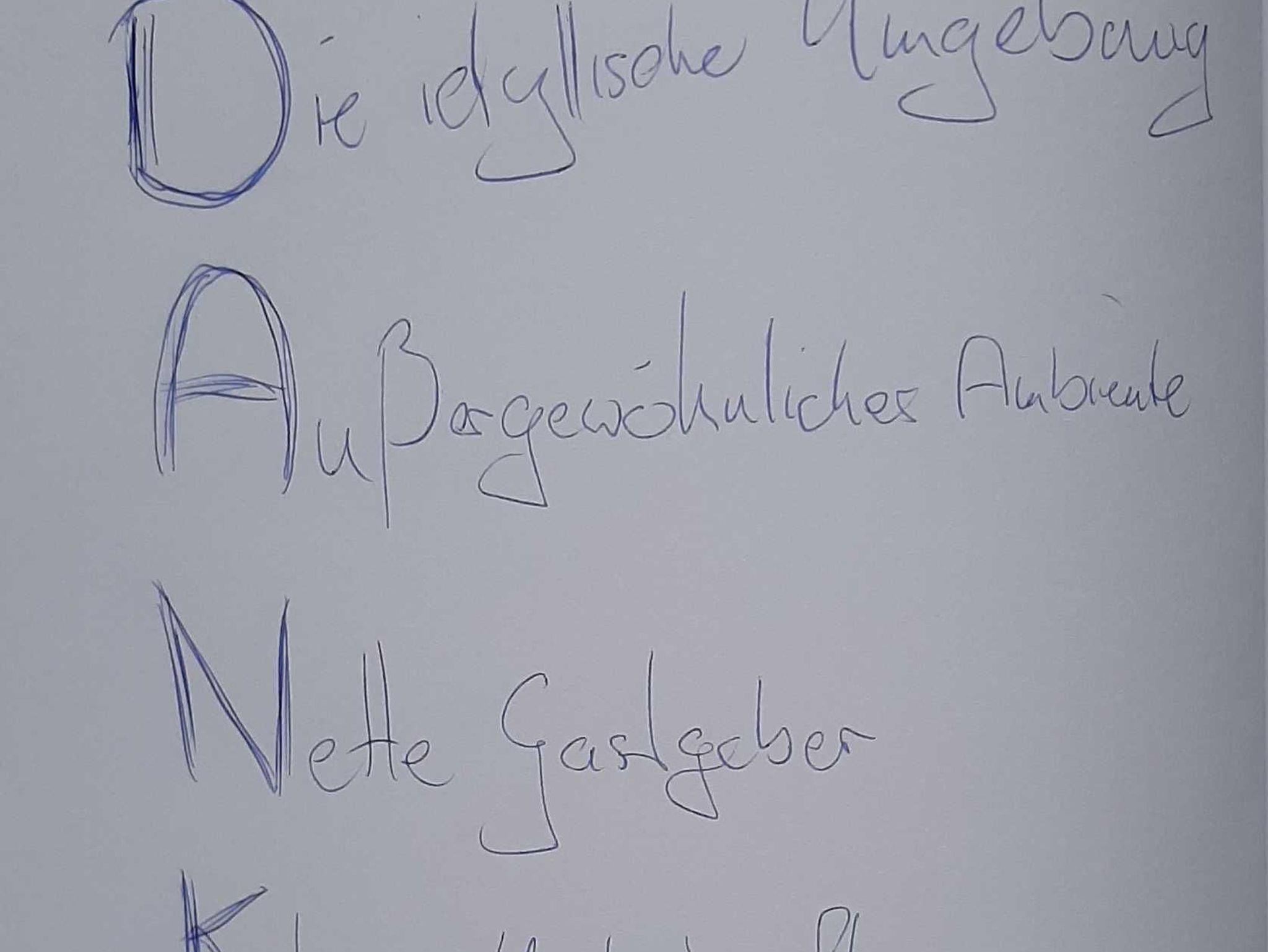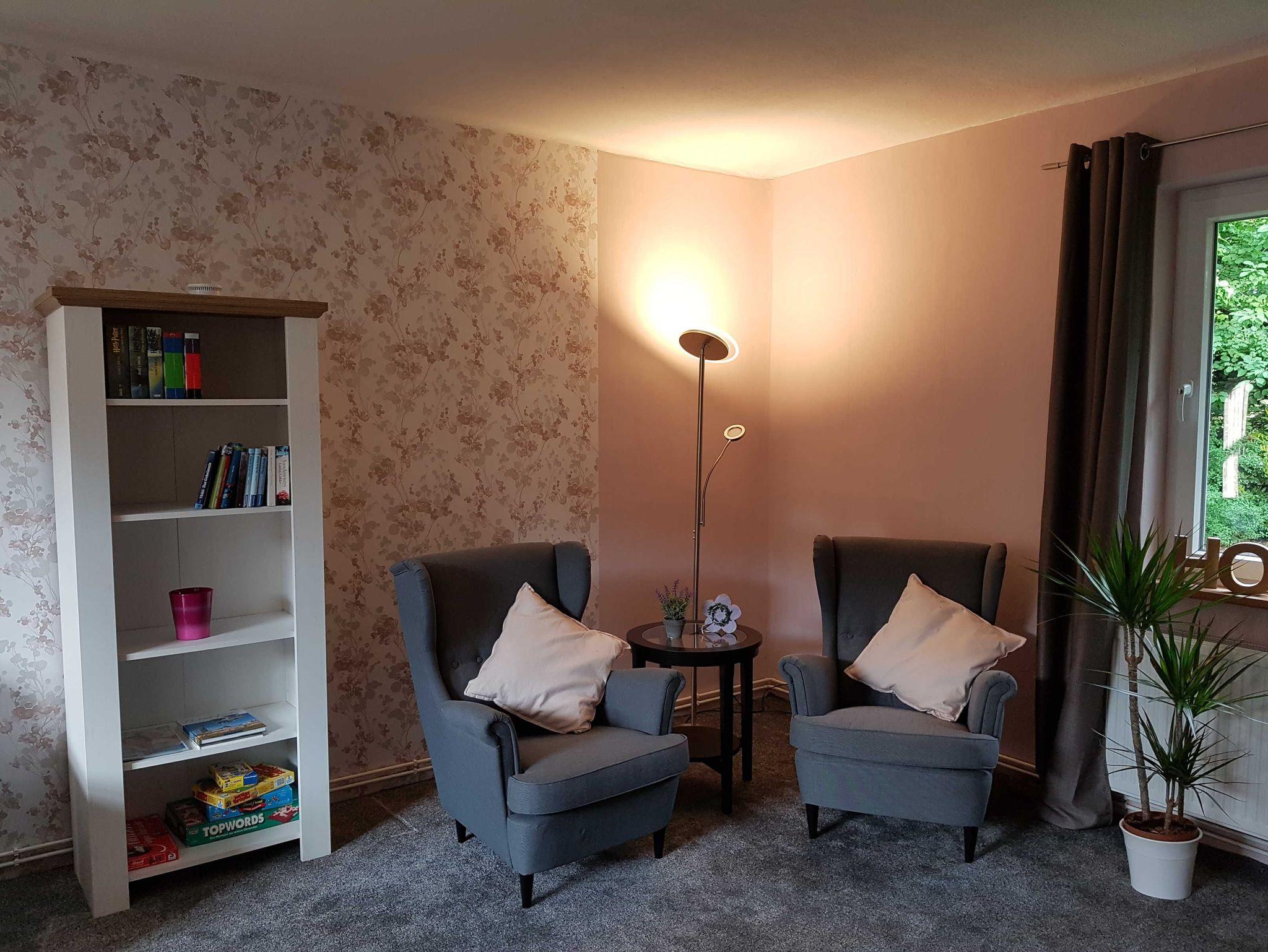 Einrichtung: Küche neu und vollständig ausgestattet; Wohnzimmer ca. 30 qm mit hellen Schränken, schwarze Sitz-Eckgarnitur, Lesecke mit 2 Ohrensesseln und kleinem Kaminofen ( Feuerholz kostenlos ); 1 Schlafzimmer für 2 Personen mit neuen Möbeln, französisches Bett 1,40 x 2 m; 1 Schlafzimmer mit neuen Möbeln für 1 Person, auf Wunsch zzgl. Kinder-Reisebett ( bis 2 Jahre ); Badezimmer mit Dusche, kleiner Flur mit geräumigen Vorbau. Terasse mit Gartenmöbeln und Blick in den großen Garten.