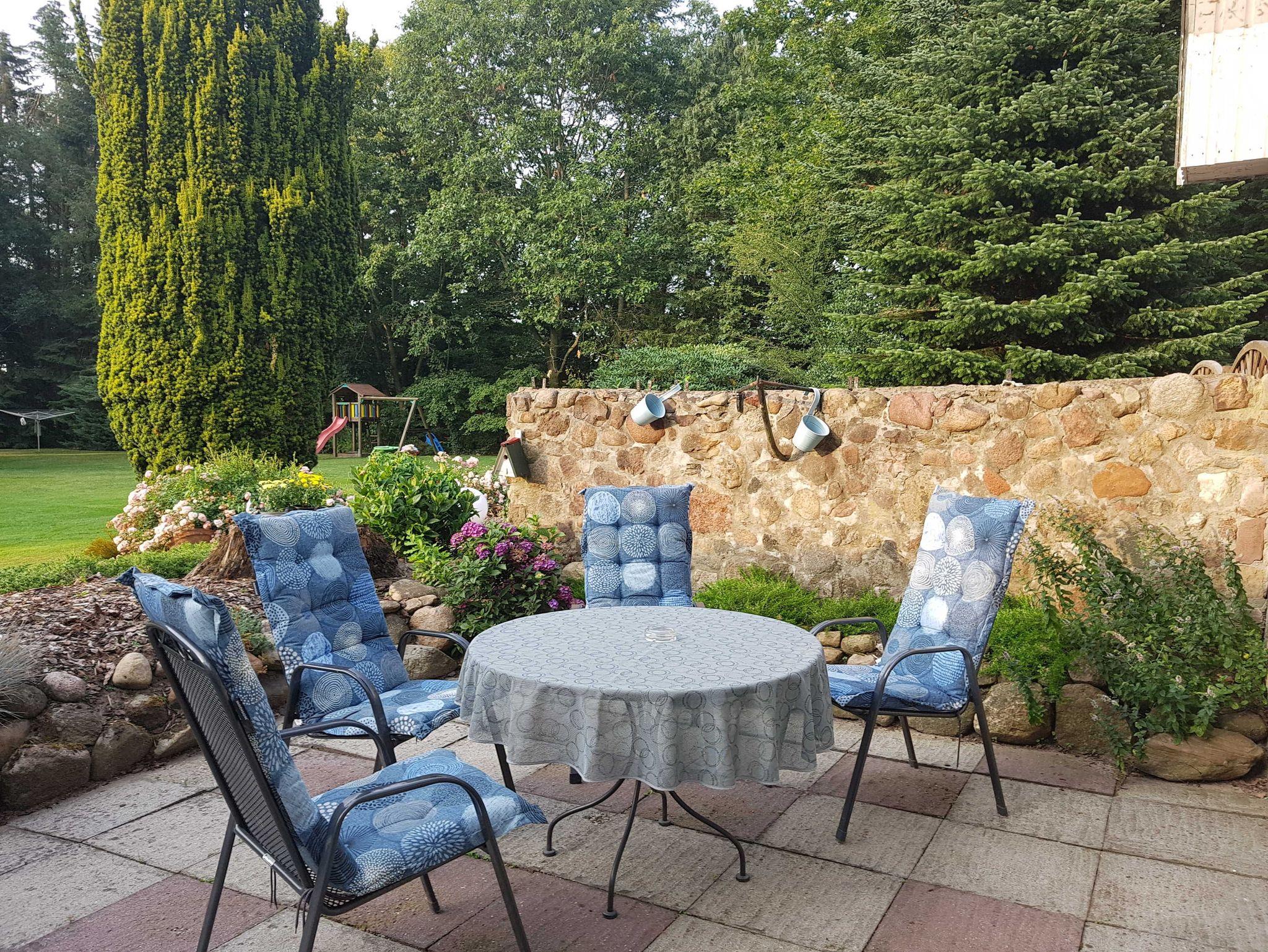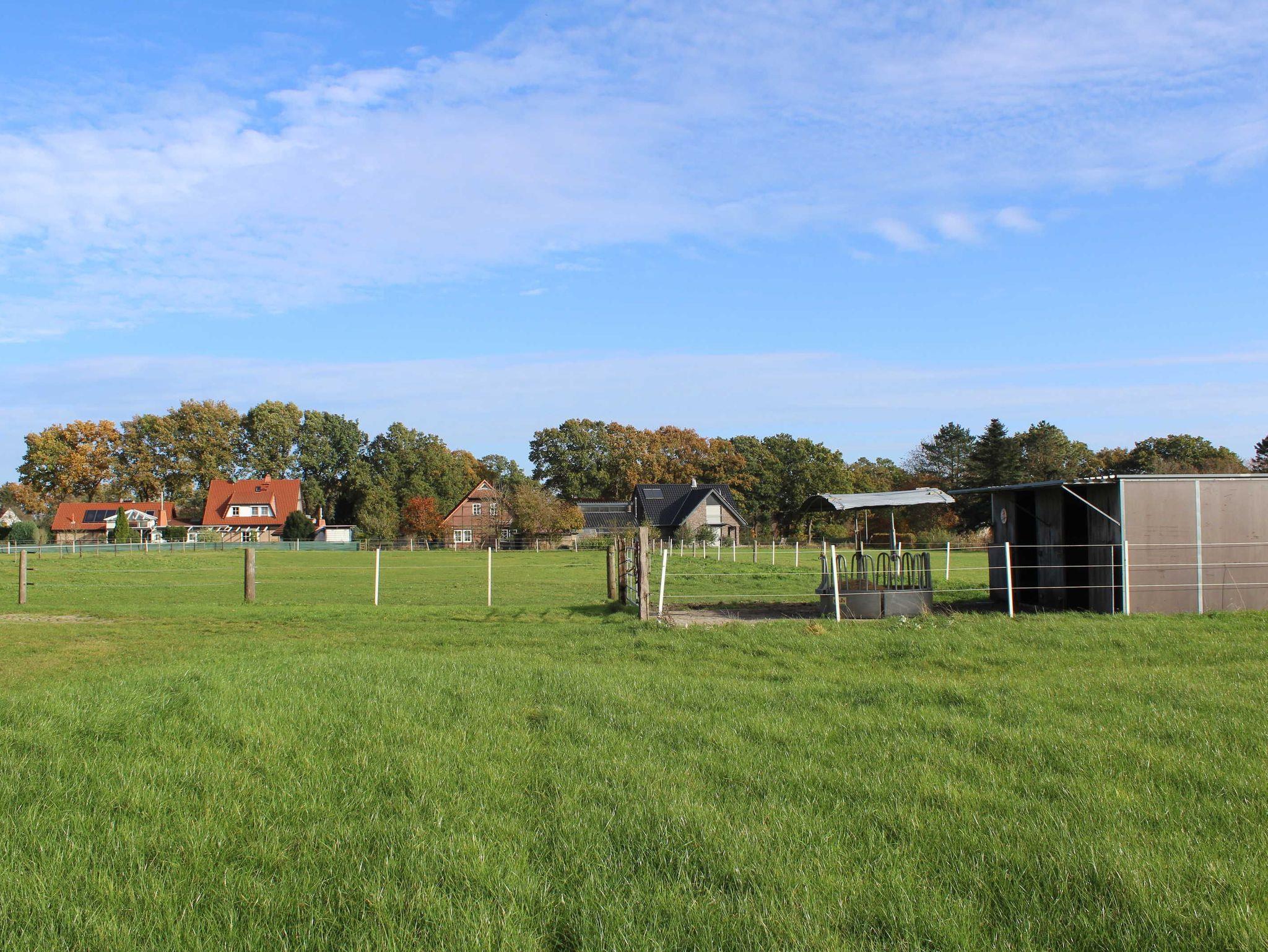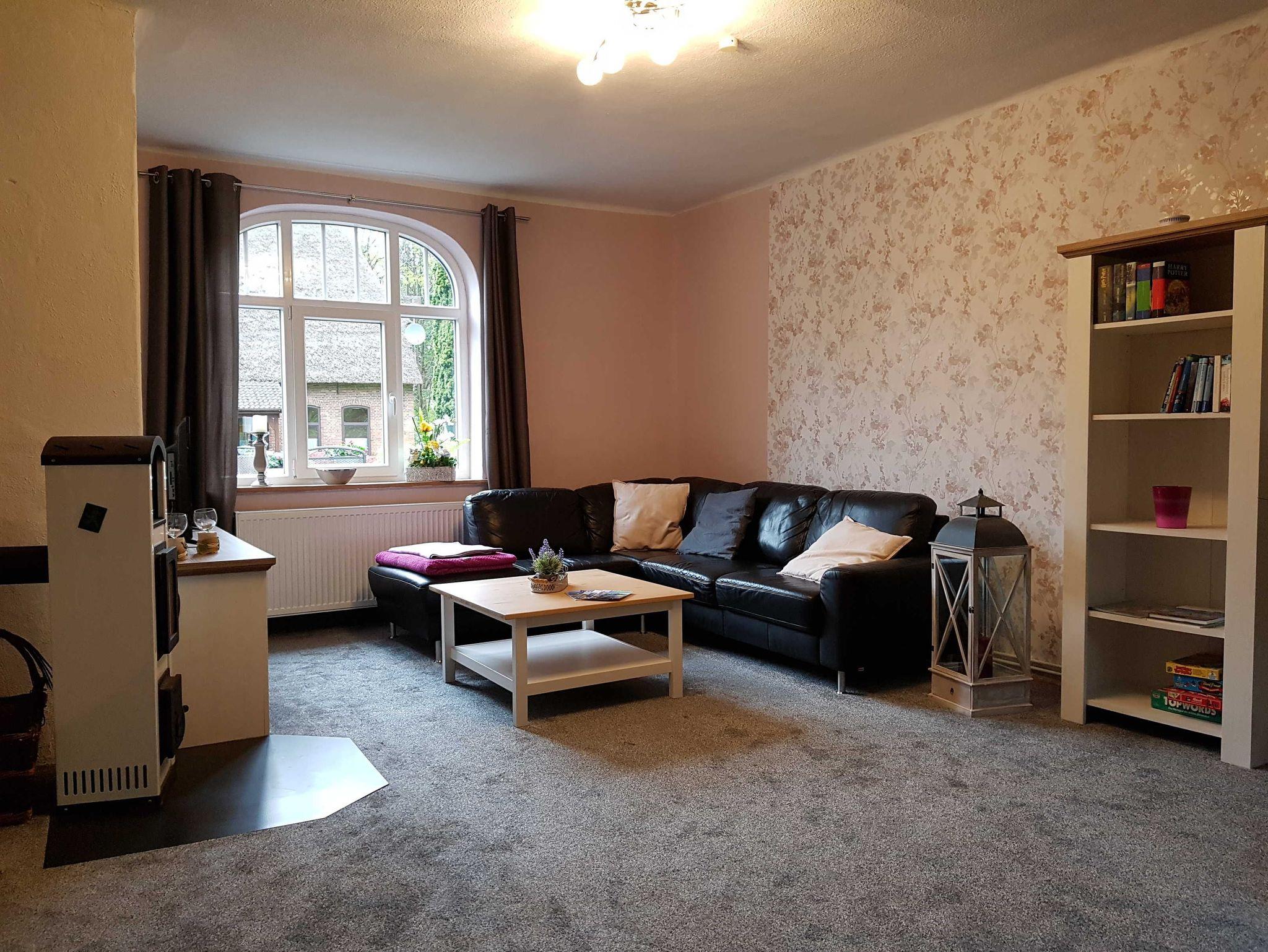 Ferienhaus im Landhaus-Stil mit Terasse in ruhiger ländlicher Lage im großen Garten eines ehemaligen Bauernhofs in Einzellage umgeben von großen Bäumen und Pferdekoppeln. Großes Waldgebiet in ca 1 KM. Wohnung im Erdgeschoß. Wohnfläche ca. 90 qm, großes Wohnzimmer, 1 Schlafzimmer mit Doppelbett, 1 Schlafzimmer mit Einzelbett, zusätzliches Kinderbett möglich. Küche, Bad mit Dusche. Zentralheizung und Kaminofen. Carport, Fahrradunterstellung.
