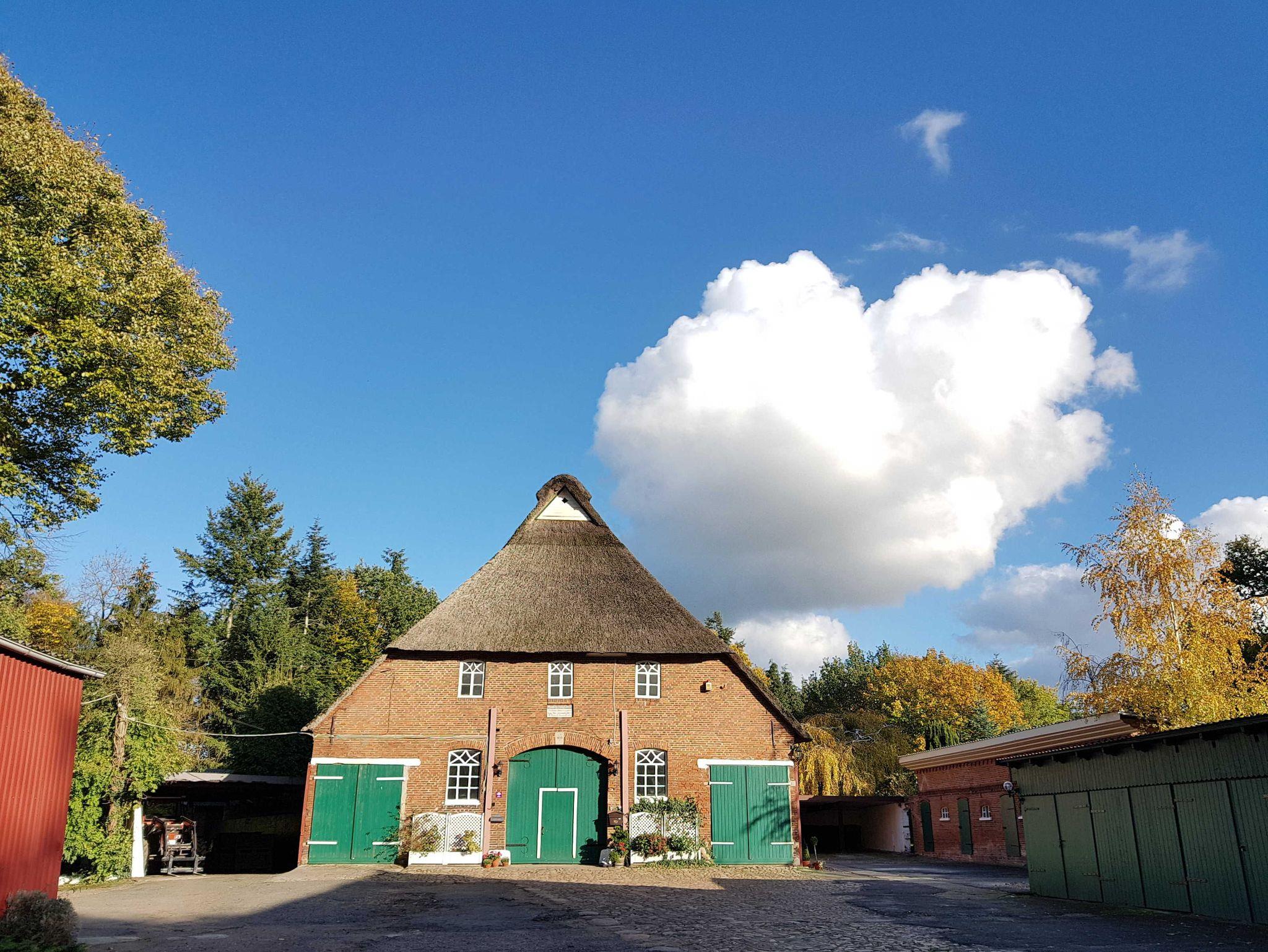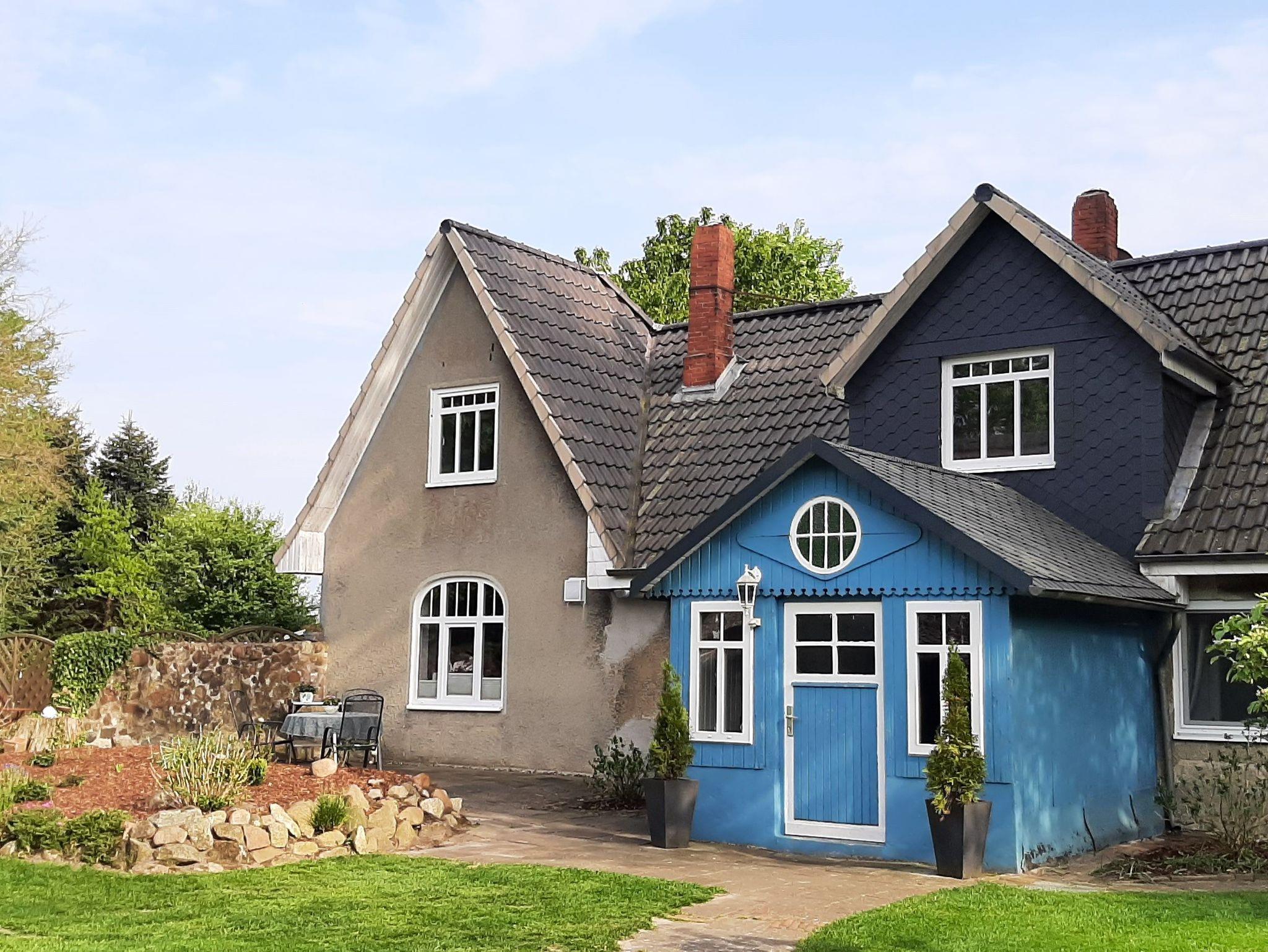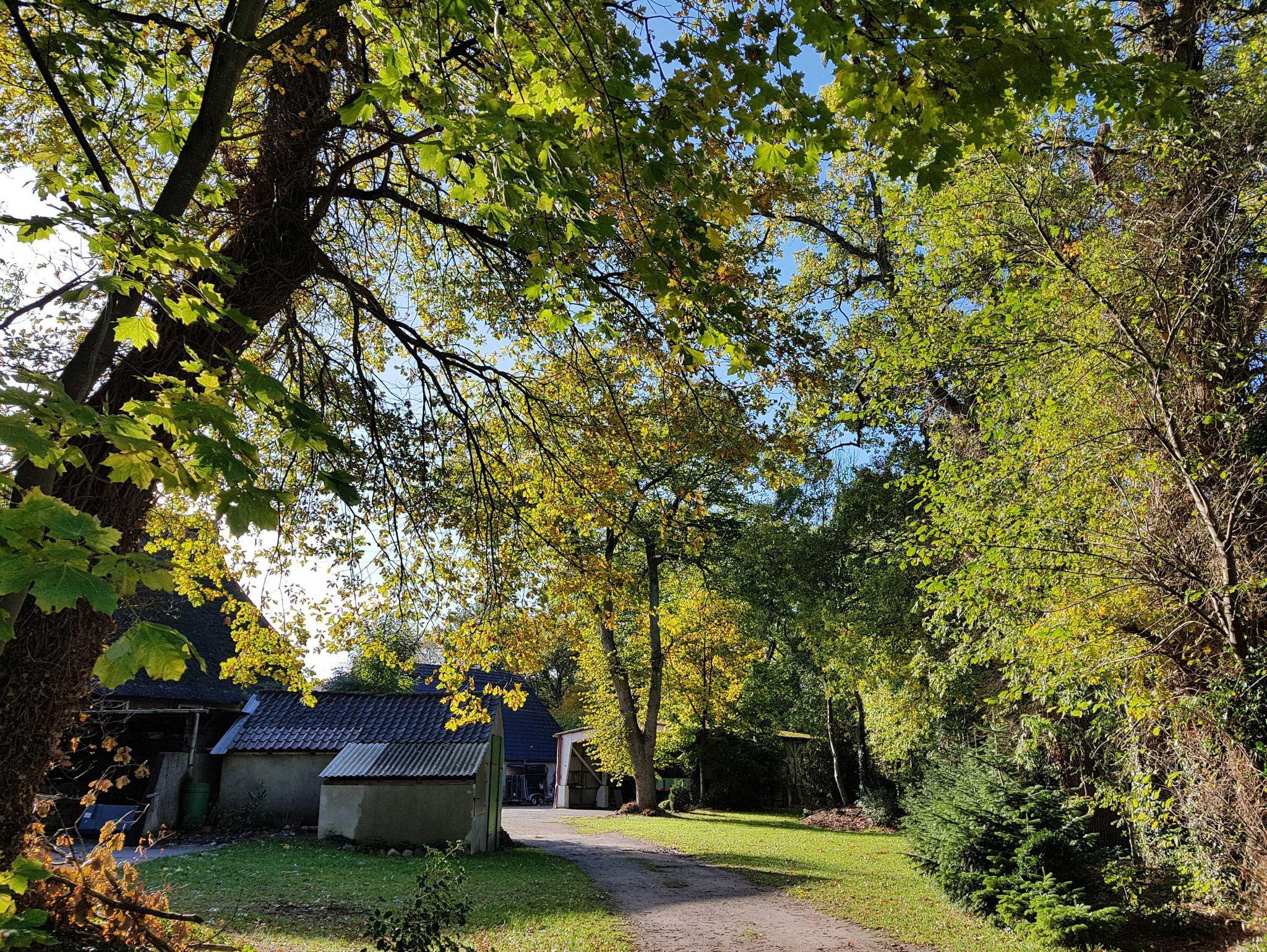 Ferienhaus im Landhaus-Stil mit Terasse in ruhiger ländlicher Lage im großen Garten eines ehemaligen Bauernhofs in Einzellage umgeben von großen Bäumen und Pferdekoppeln. Großes Waldgebiet in ca 1 KM. Wohnung im Erdgeschoß. Wohnfläche ca. 90 qm, großes Wohnzimmer, 1 Schlafzimmer mit Doppelbett, 1 Schlafzimmer mit Einzelbett, zusätzliches Kinderbett möglich. Küche, Bad mit Dusche. Zentralheizung und Kaminofen. Carport, Fahrradunterstellung.