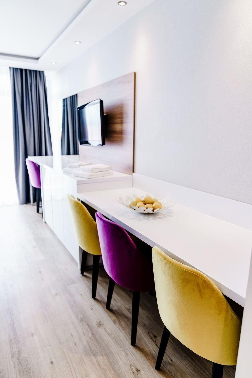 Der Wohnbereich ist mit einem einladenden Sofa, einem Sessel und einem Esstisch eingerichtet, ergänzt durch einen TV für Unterhaltungsabende.