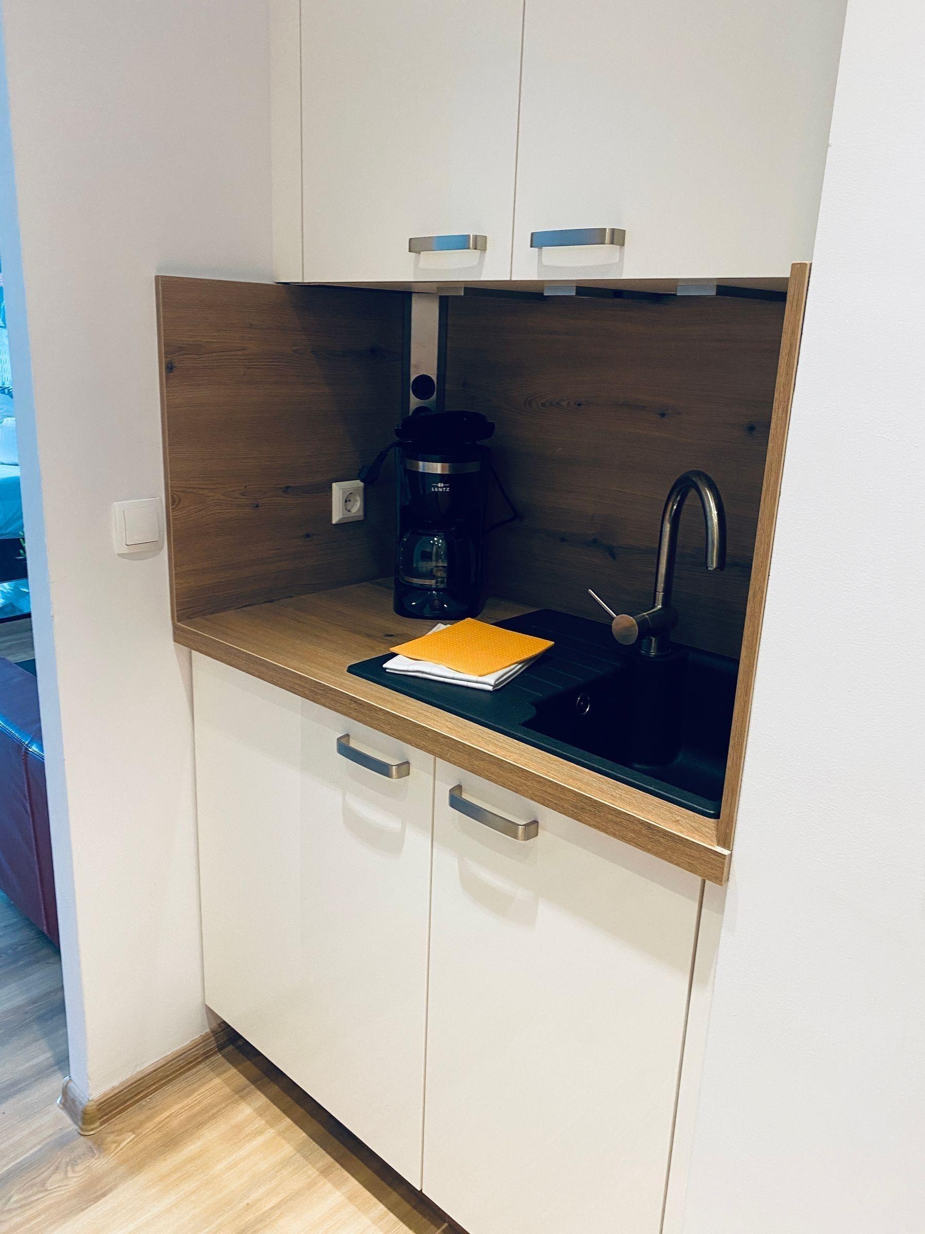 Die Ferienwohnung bietet eine moderne und komfortable Ausstattung, die den Aufenthalt zu einem angenehmen Erlebnis macht. In einem einladenden Schlafzimmer befindet sich ein Doppelbett, das für erholsame Nächte sorgt. Die offene Küche ist mit einem Elektro-/Gasherd, Kühlschrank, Kaffeemaschine, Toaster sowie Geschirr und Besteck ausgestattet, was eine ideale Grundlage für die Zubereitung eigener Mahlzeiten bietet. Das Badezimmer verfügt über eine bodengleiche Dusche und ein Fenster, das für Tageslicht sorgt. Ein Wohnzimmer mit Sofa lädt zum Entspannen ein. Die Wohnung ist zudem mit Internet über WLAN ausgestattet und bietet einen Fernseher zur Unterhaltung. Praktische Annehmlichkeiten, wie Geschirrtücher sowie eine Gefriermöglichkeit, runden die Ausstattung ab. Ein Fahrstuhl erleichtert den Zugang zur Wohnung. Dank der Heizung ist der Raum auch in den kälteren Monaten gemütlich. Die Ferienwohnung ist ein perfekter Rückzugsort für einen unvergesslichen Aufenthalt.