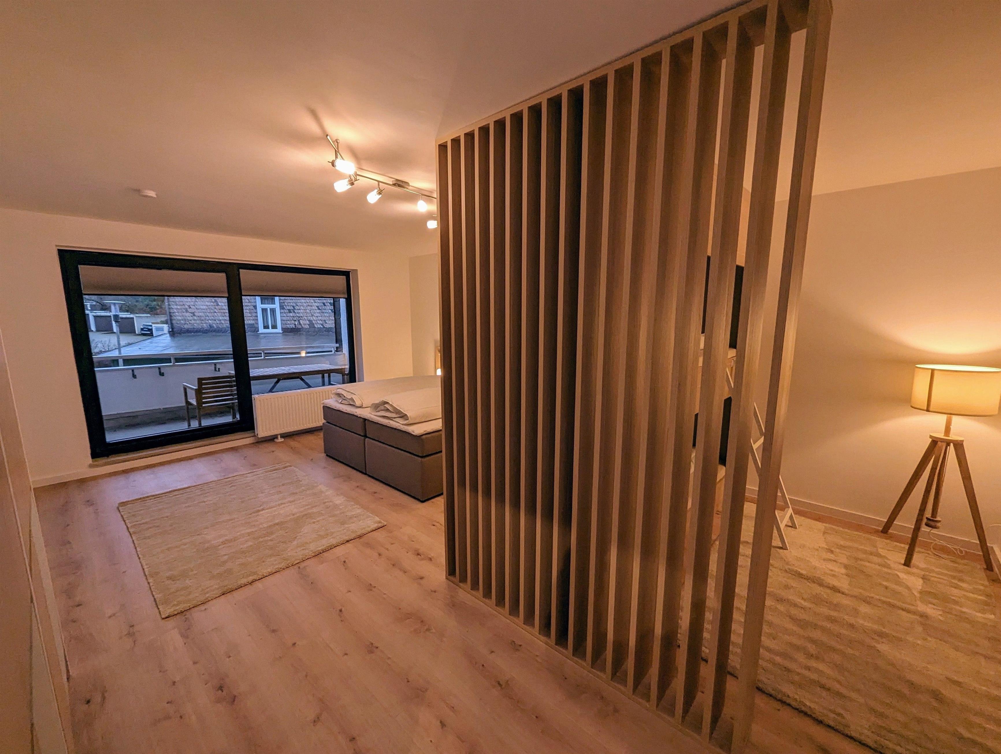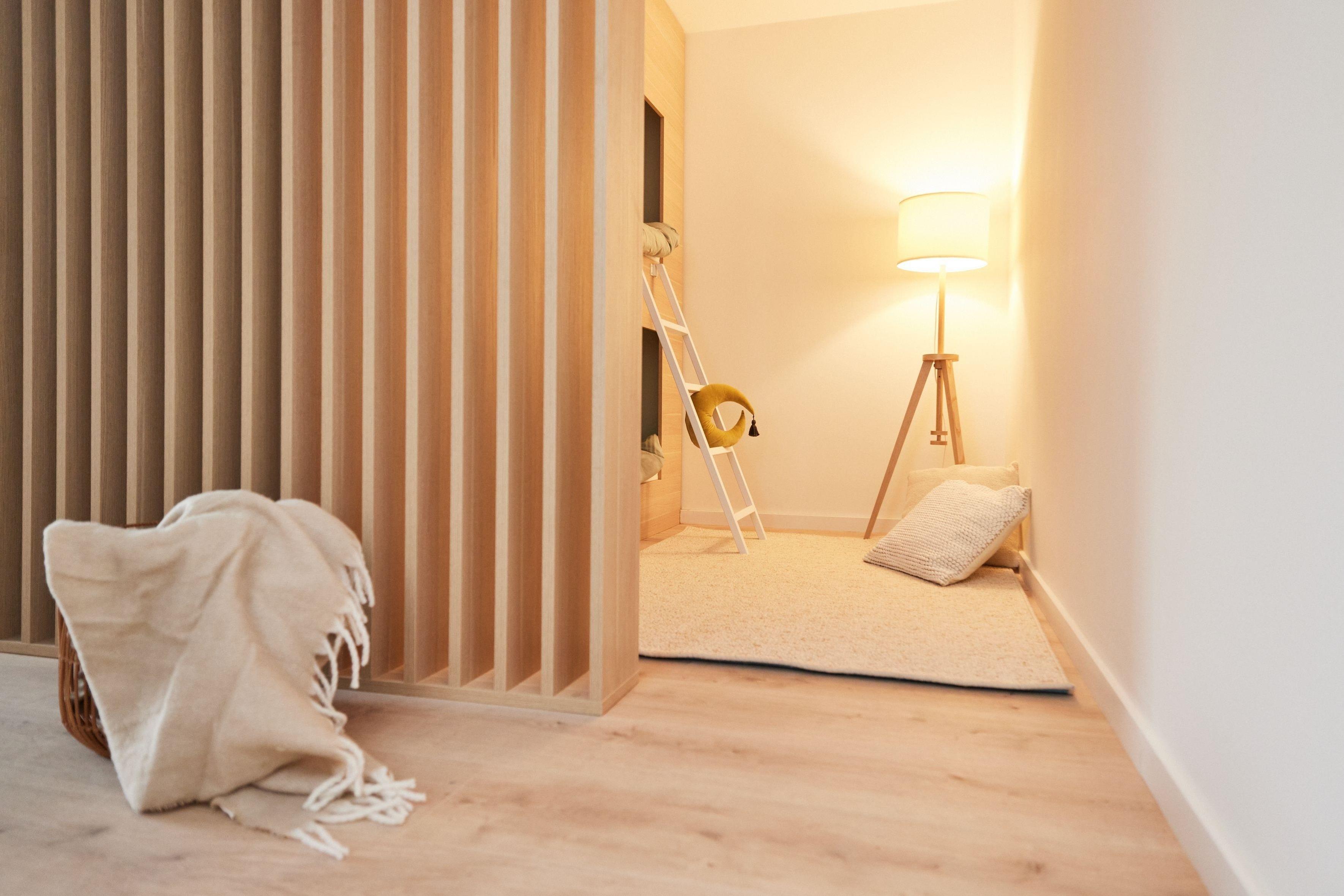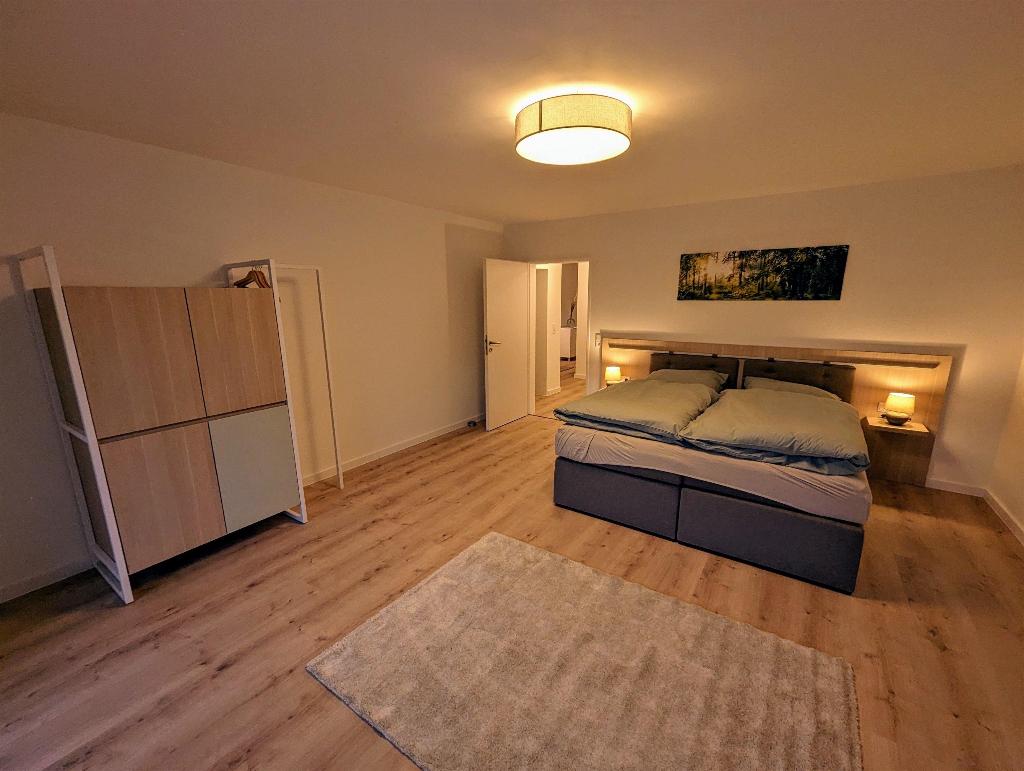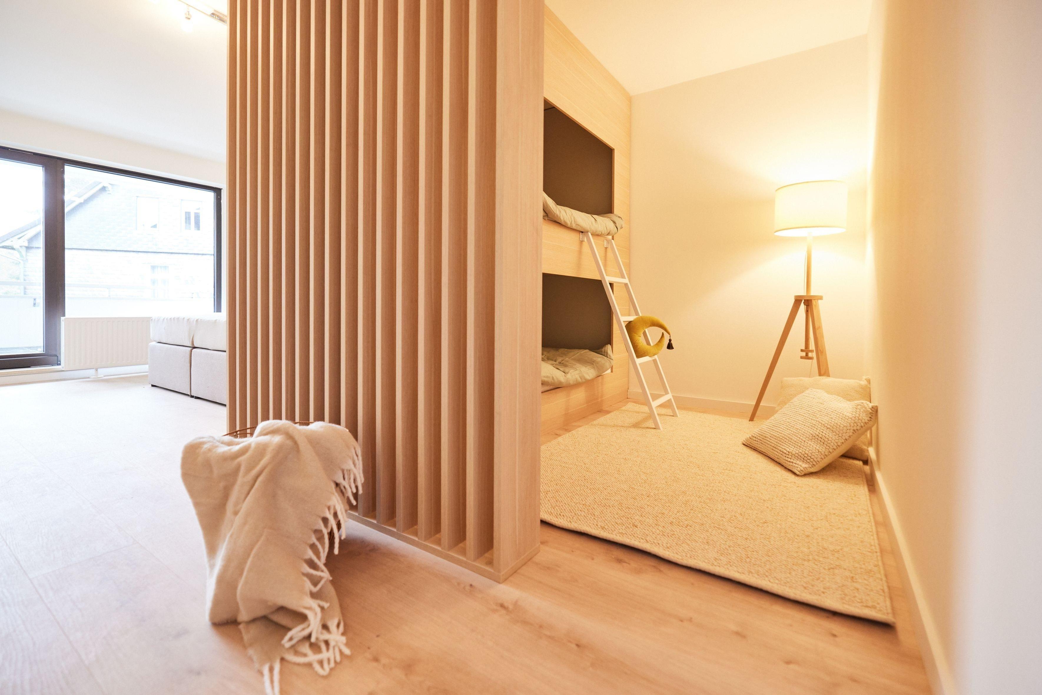Hier finden Sie auf 135m2 eine moderne und helle Wohnung. Diese verfügt über ein Schlafzimmer mit Doppelbett, einem Schlafzimmer mit Doppelbett sowie durch einen modernen Raumteiler abgetrennten Bereich ein Stockbett.