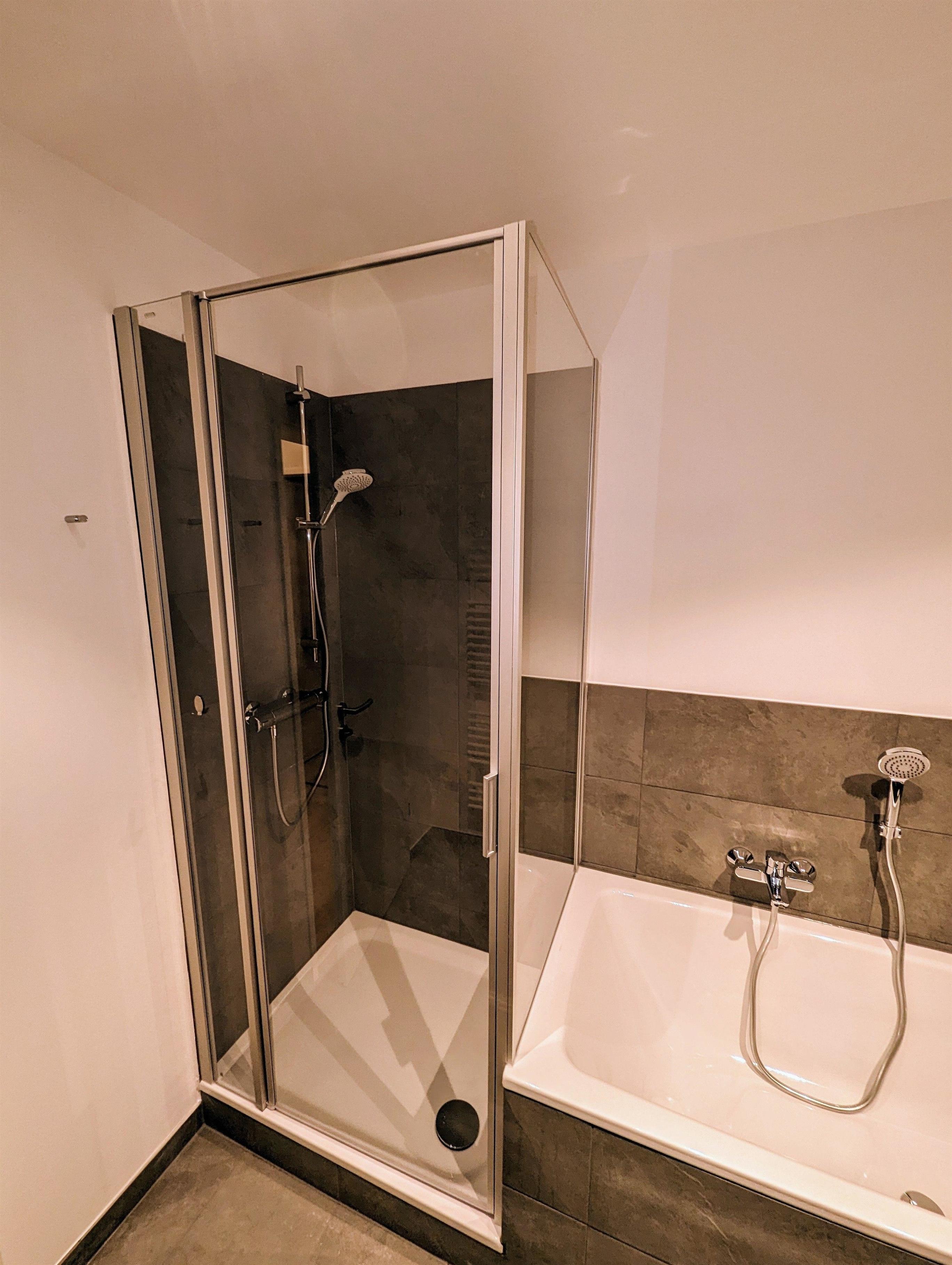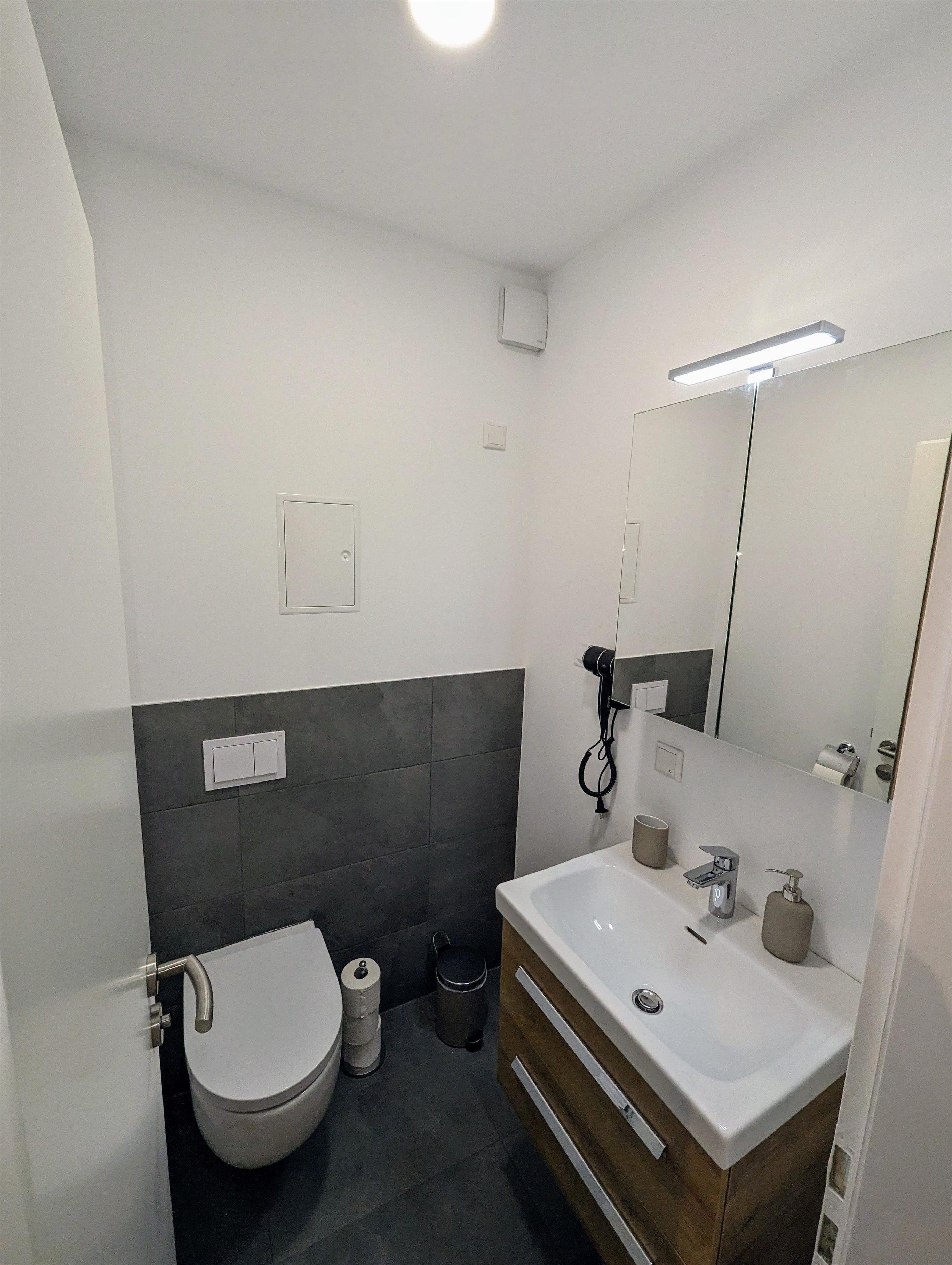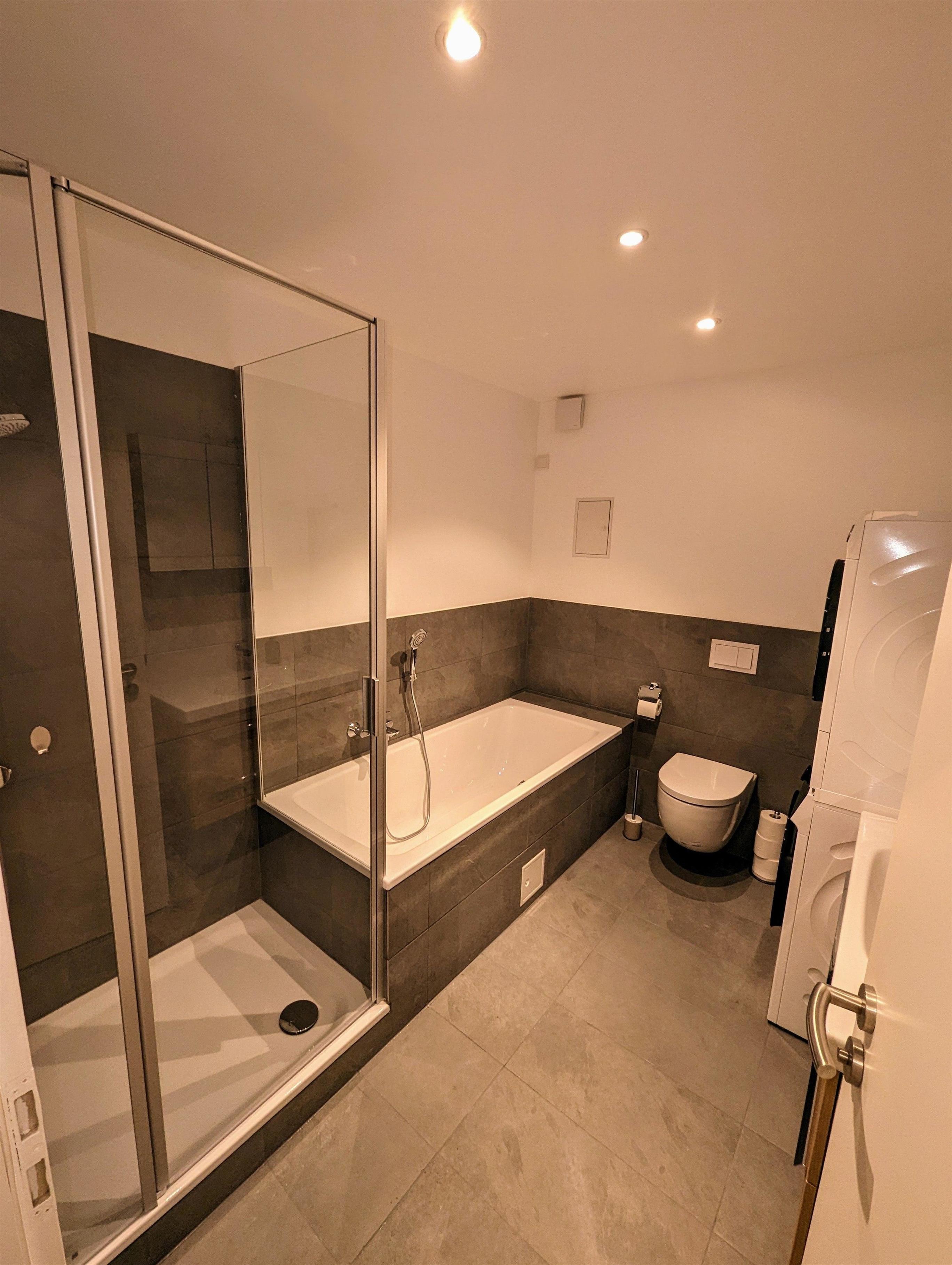 Sie finden hier ein Vollbad vor, welches zusätzlich mit einer Waschmaschine sowie einem Trockner ausgestattet ist. Ein Gäste-WC ist ebenso vorhanden.