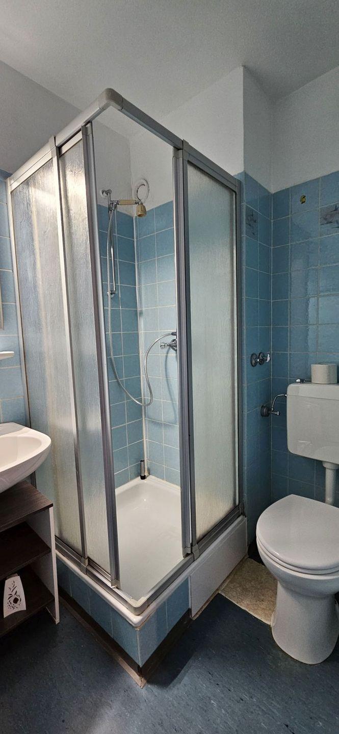 Das Badezimmer hat eine Dusche und einen Spiegelschrank.