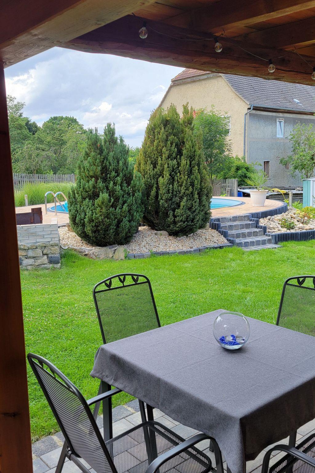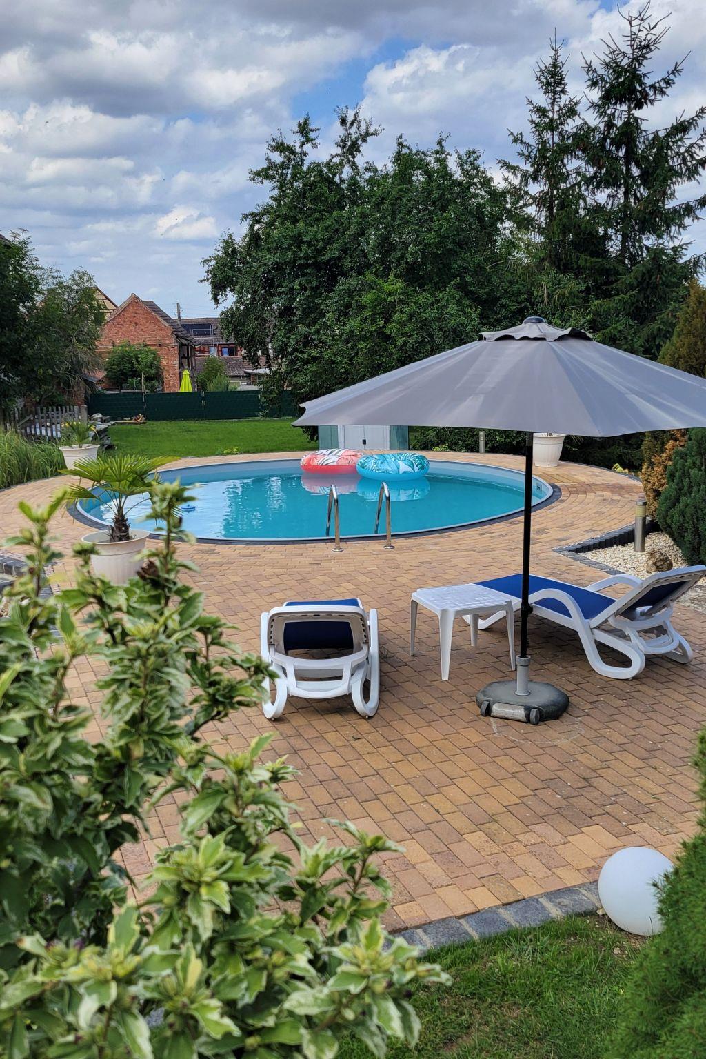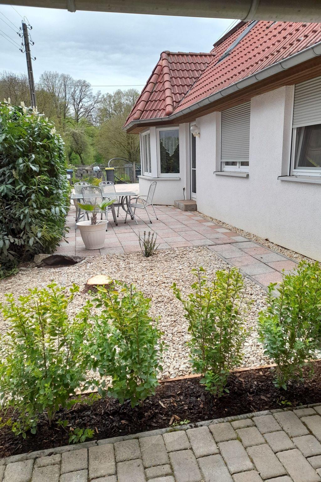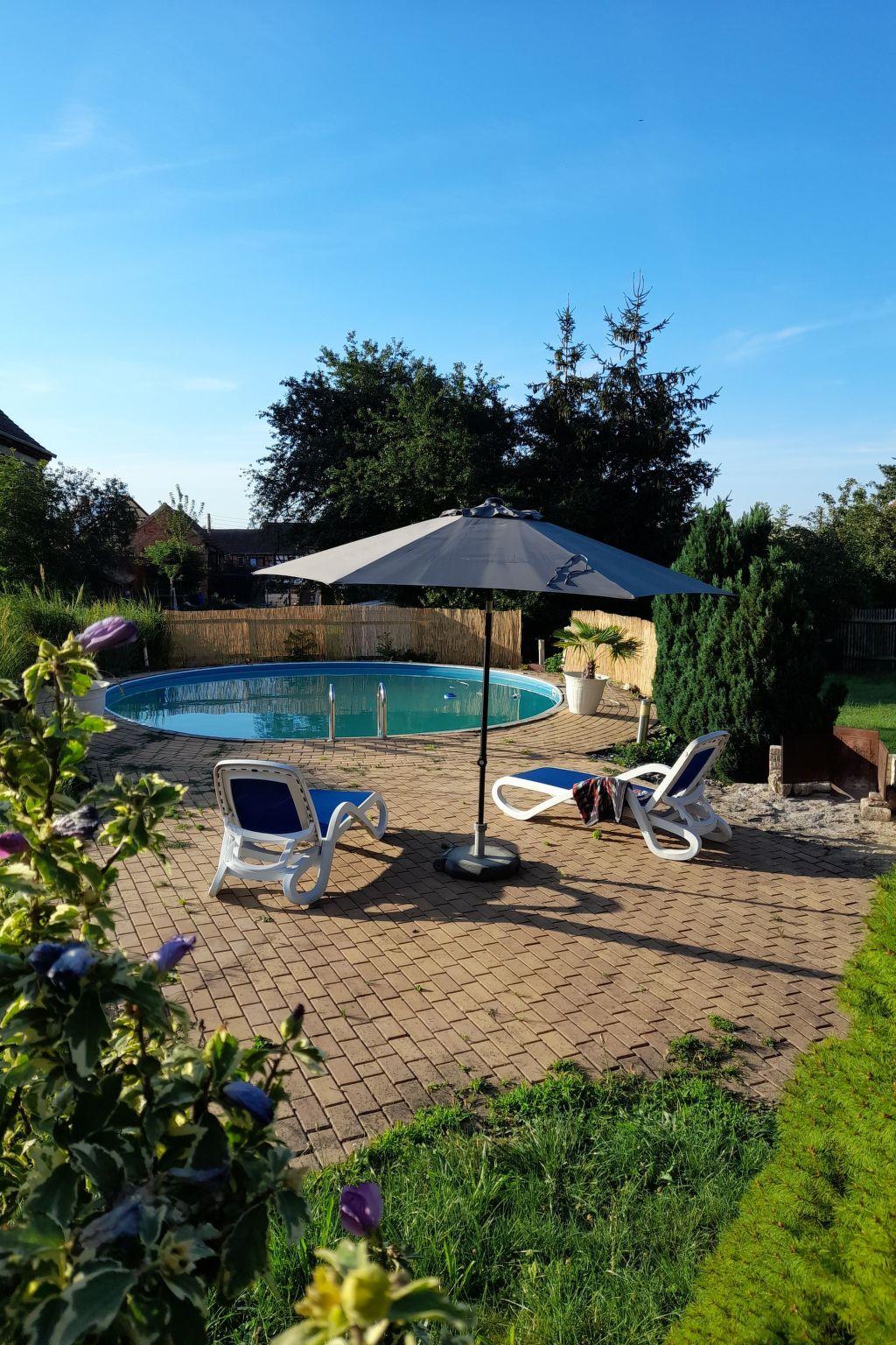 In the outdoor area, the approximately 6 metre diameter and 1.40 metre deep pool, which can be used from around mid-May until late autumn, invites you to relax. The garden, although not yet fully finished, is available for fun and games, and fruit trees and shrubs invite you to snack. Two terraces with sun loungers, garden furniture and barbecue, as well as a new, covered seating area offer plenty of space for outdoor activities and relaxation.